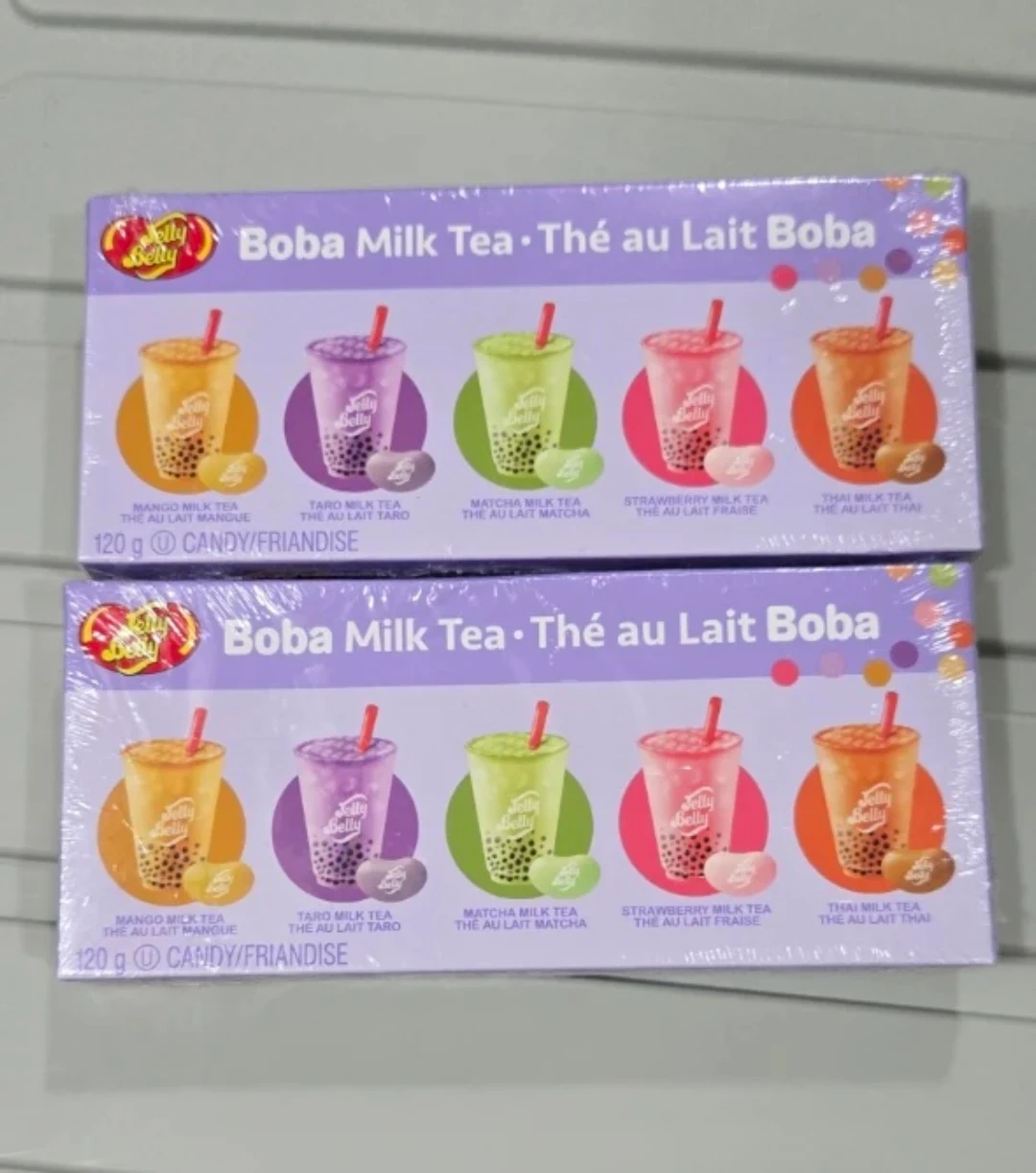 Selling two boxes of Jelly Belly Boba Milk Tea candies! Each box contains a mix of mango, taro, matcha, strawberry, and thai milk tea flavours. Perfect for boba lovers and candy enthusiasts alike