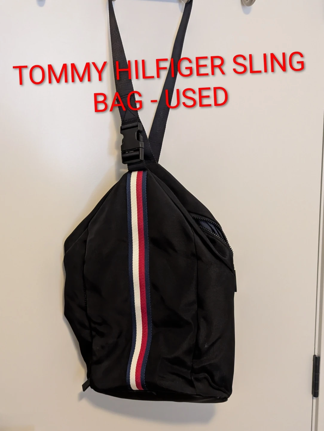 Tommy Hilfiger sling bag in black with the signature red, white, and blue stripe. It's in great condition and ready for a new owner!