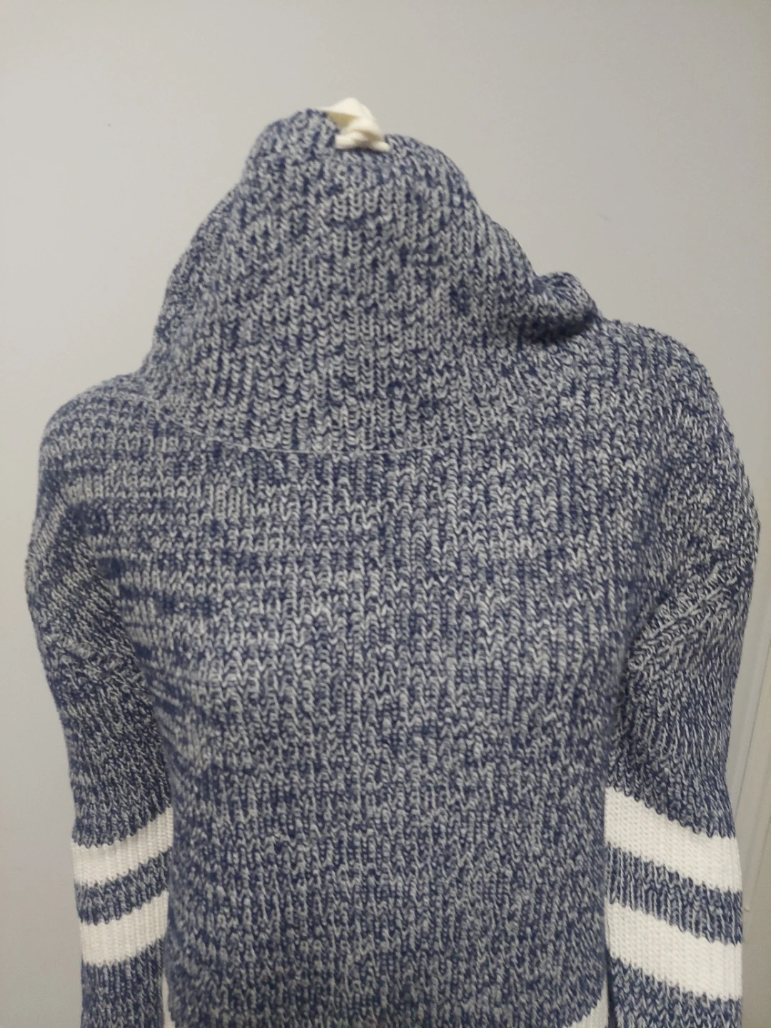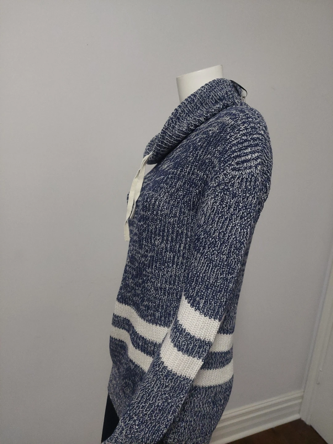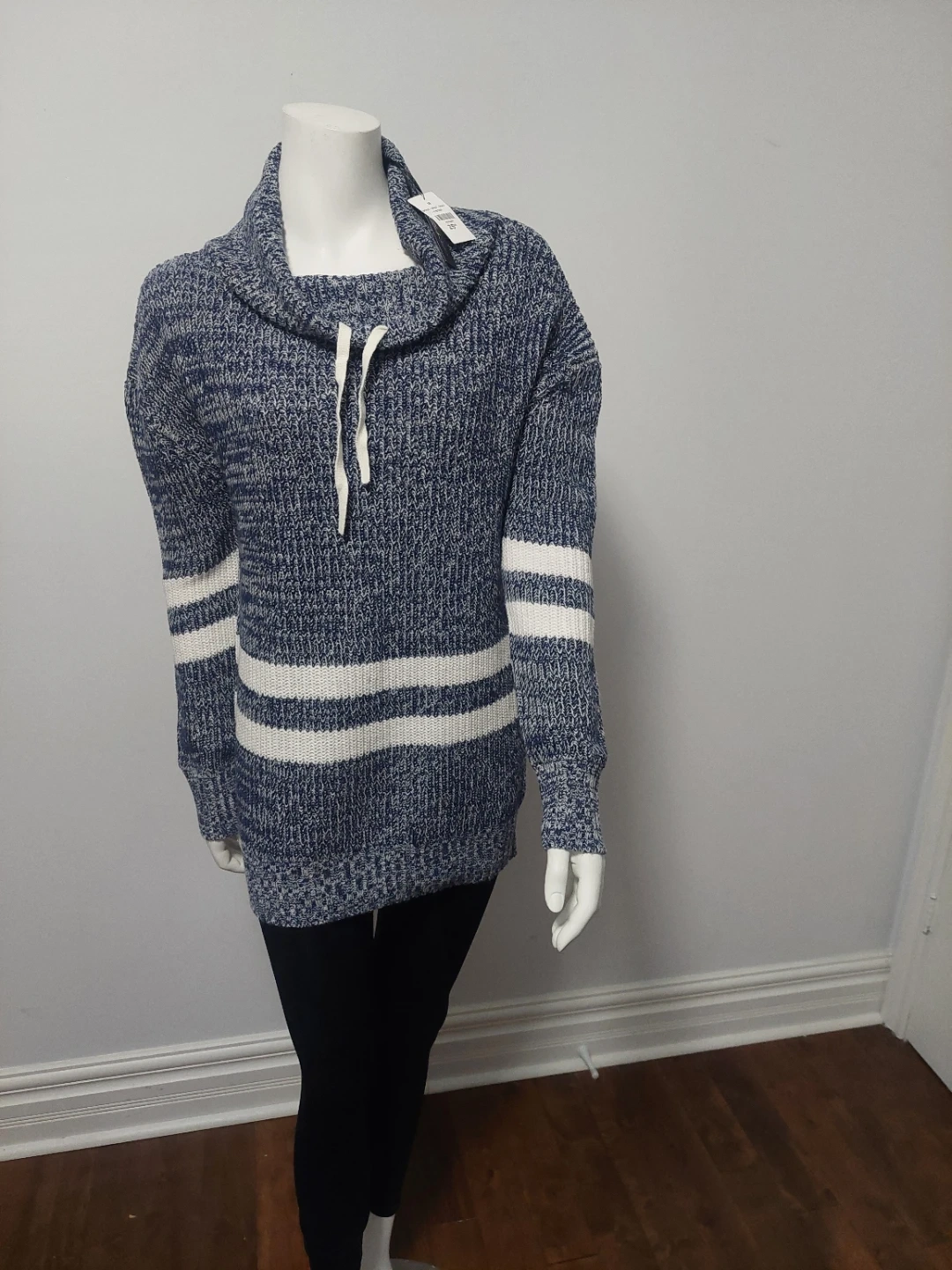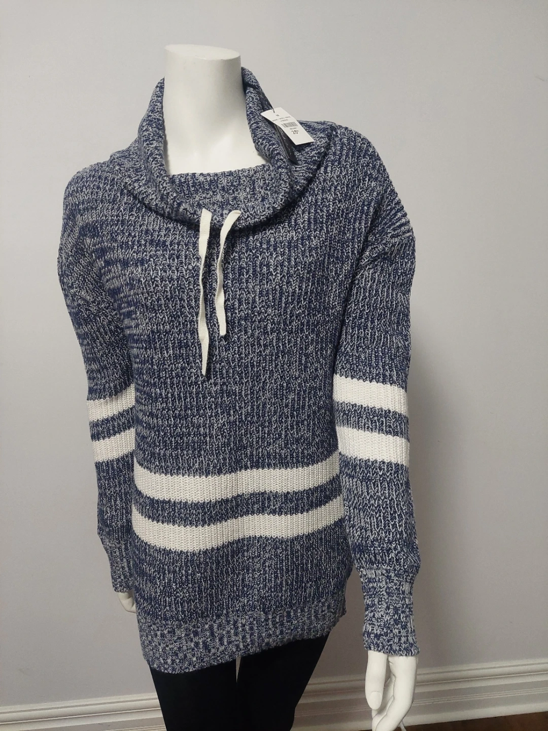 A cozy Seduction sweater in size medium! It features a stylish cowl neck with a drawstring and sporty white stripes on the sleeves and body. The blue and white knit is super comfy!