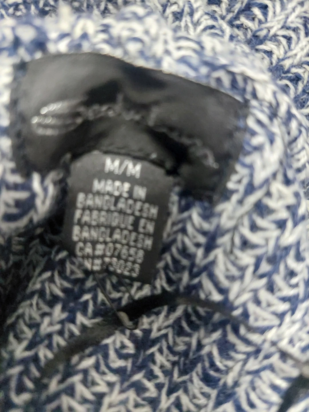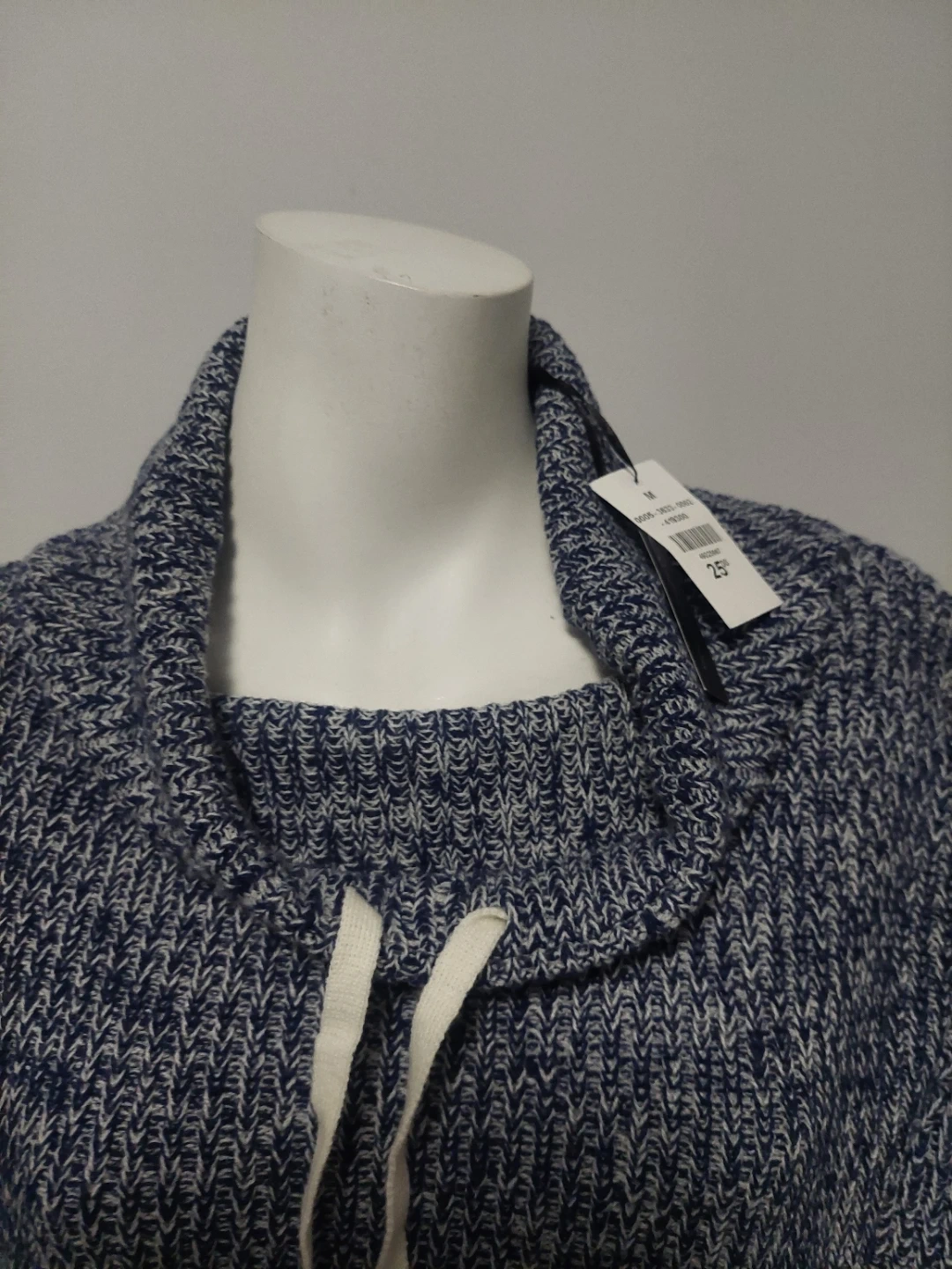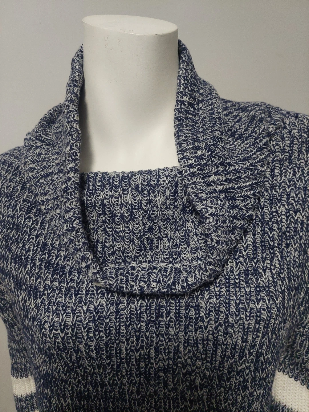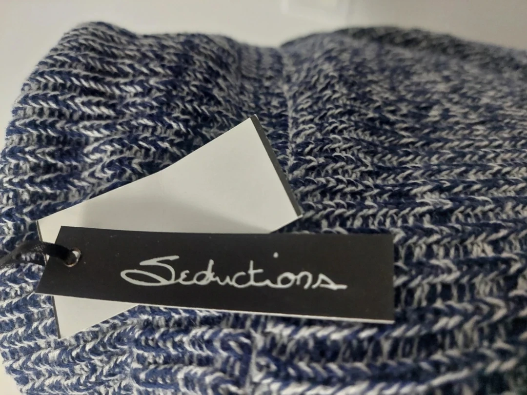 A cozy Seduction sweater in size medium! It features a stylish cowl neck with a drawstring and sporty white stripes on the sleeves and body. The blue and white knit is super comfy!