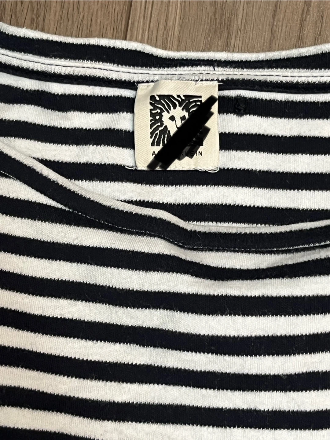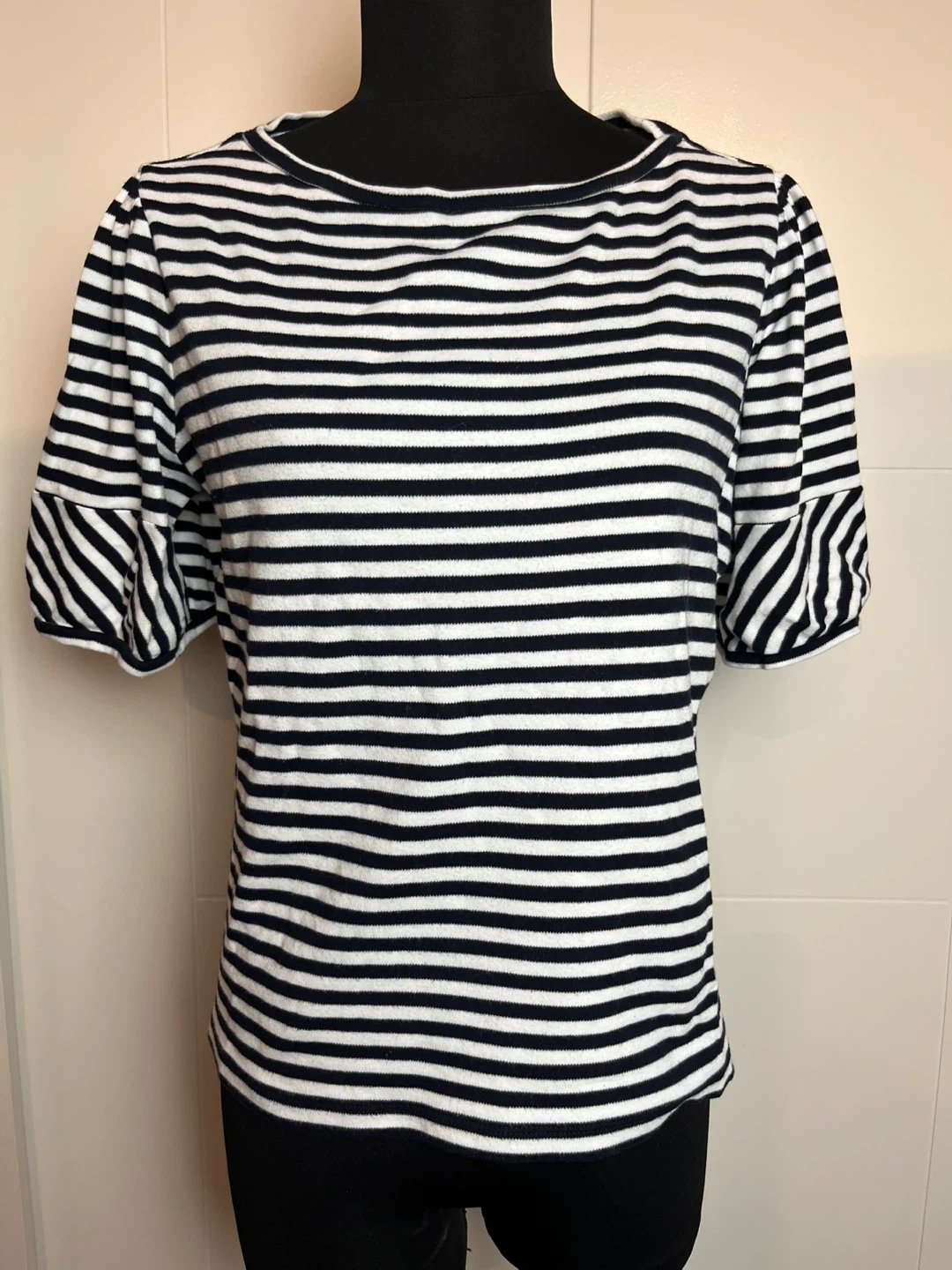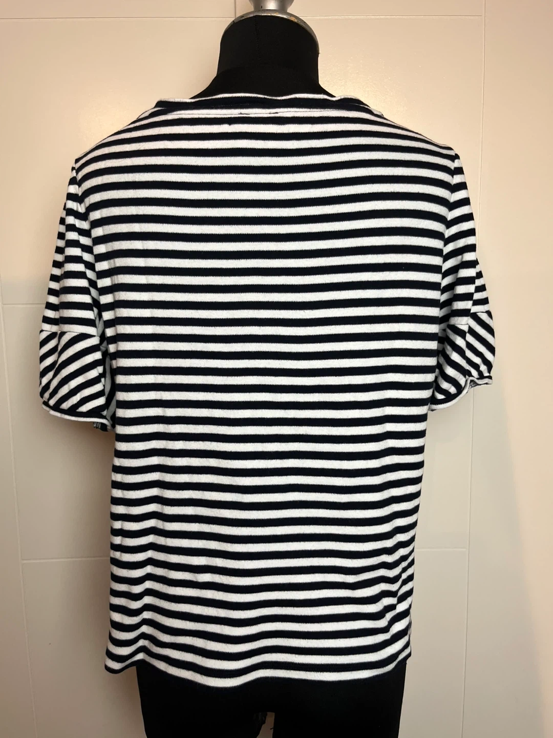 Selling an Anne Klein striped top. It's black and white and features short sleeves with a unique design.