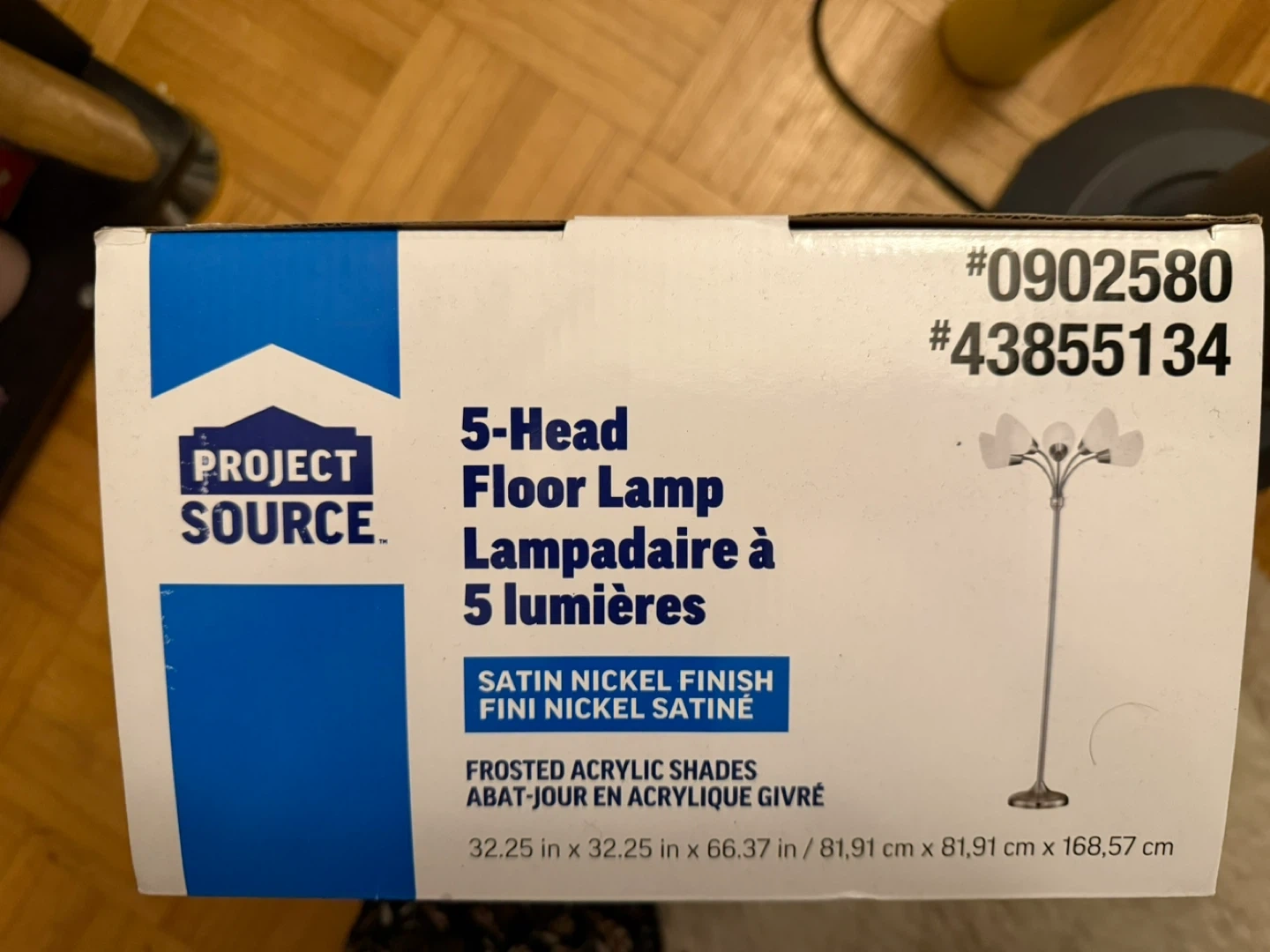 Selling a Project Source 5-Head Floor Lamp in satin nickel finish! It comes with frosted acrylic shades. The dimensions are 32.25 in x 32.25 in x 66.37 in. It's still in its original box never use never open box