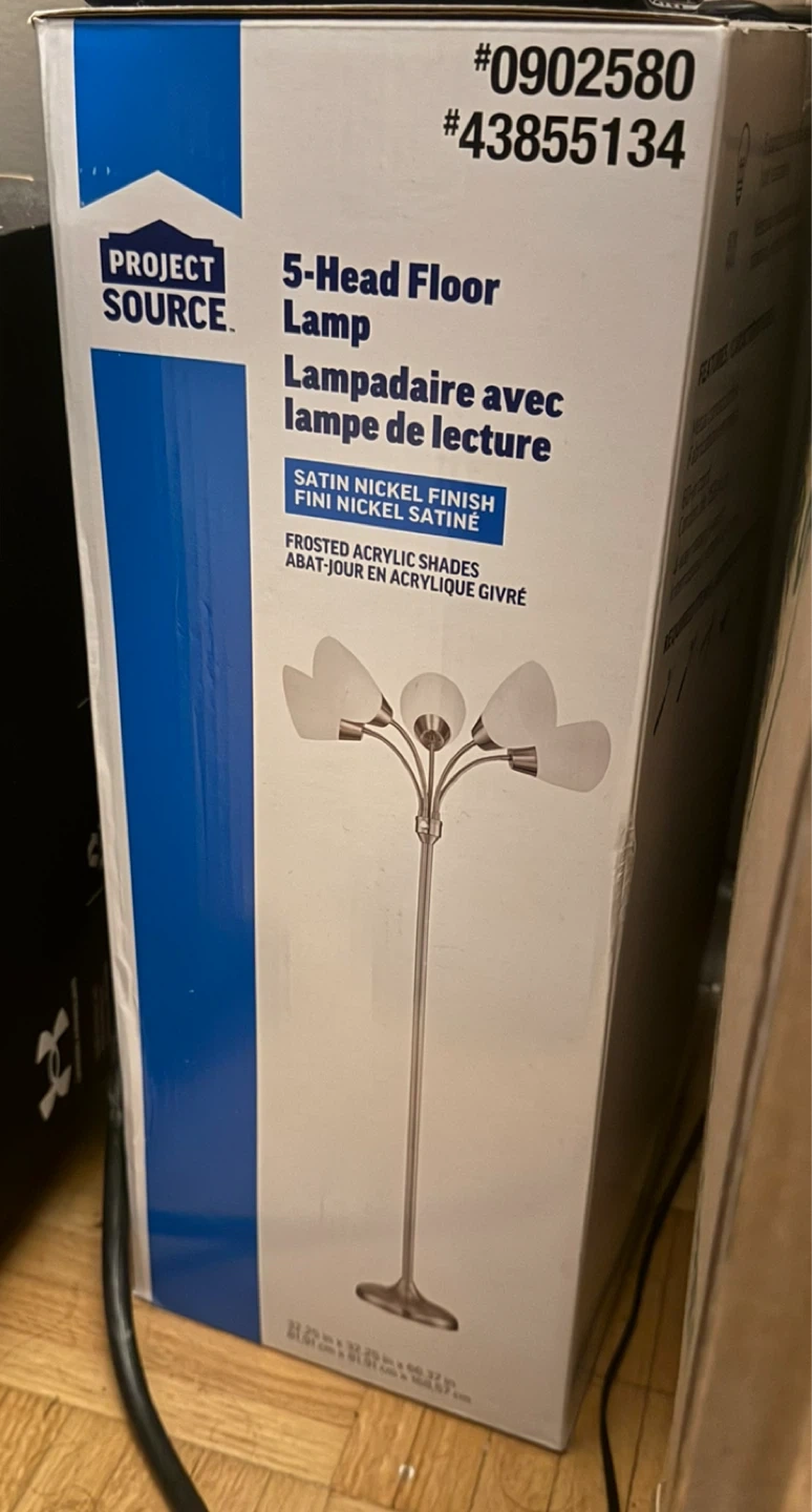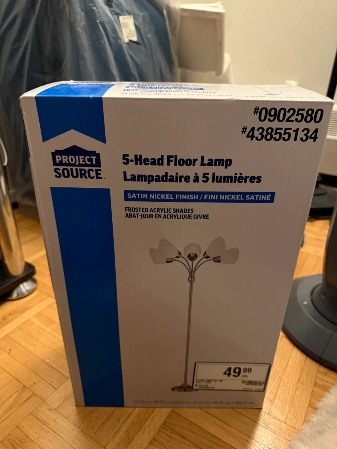Selling a Project Source 5-Head Floor Lamp in satin nickel finish! It comes with frosted acrylic shades. The dimensions are 32.25 in x 32.25 in x 66.37 in. It's still in its original box never use never open box