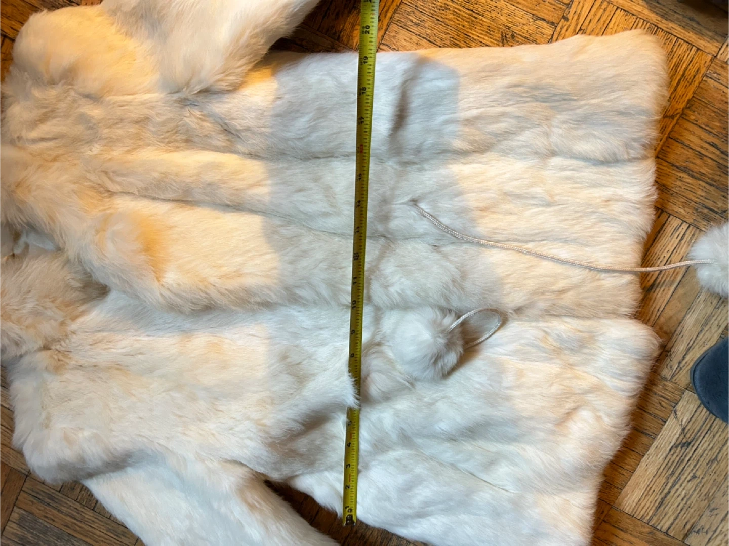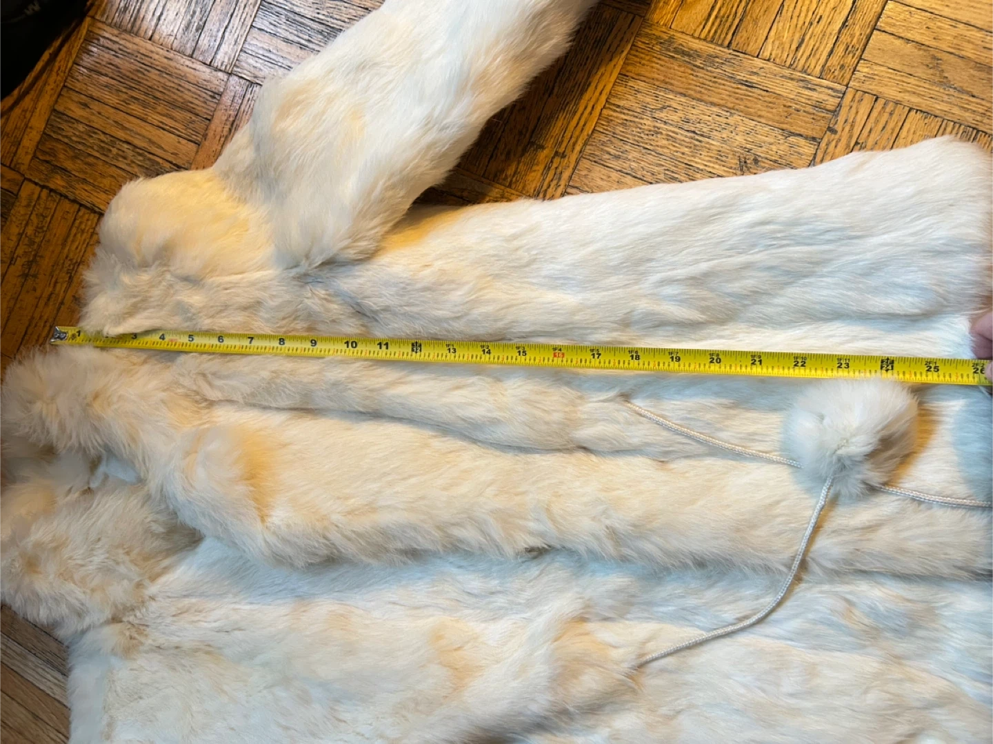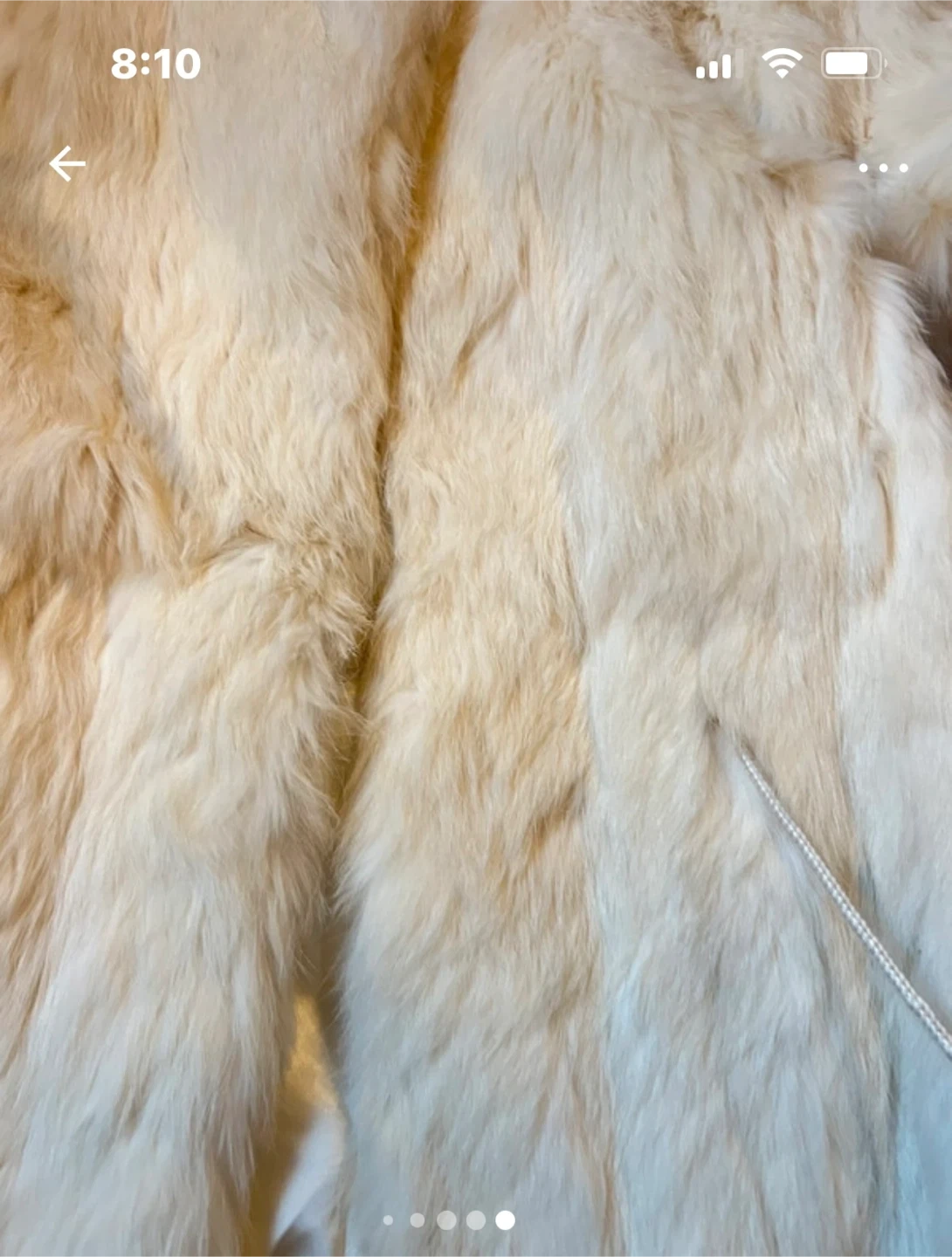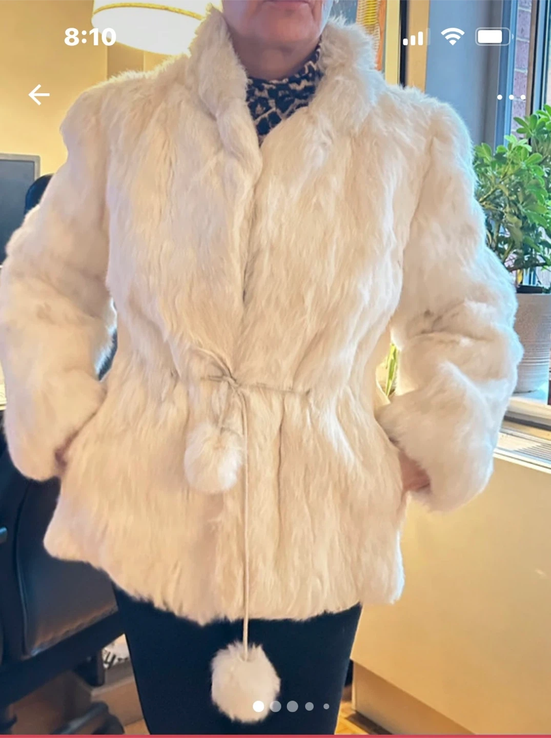 Selling a cute fur jacket in size M. But I wear a US 6 and fits perfectly. It's an off-white color and has a drawstring waist with pom poms. The jacket and lining is in great shape!