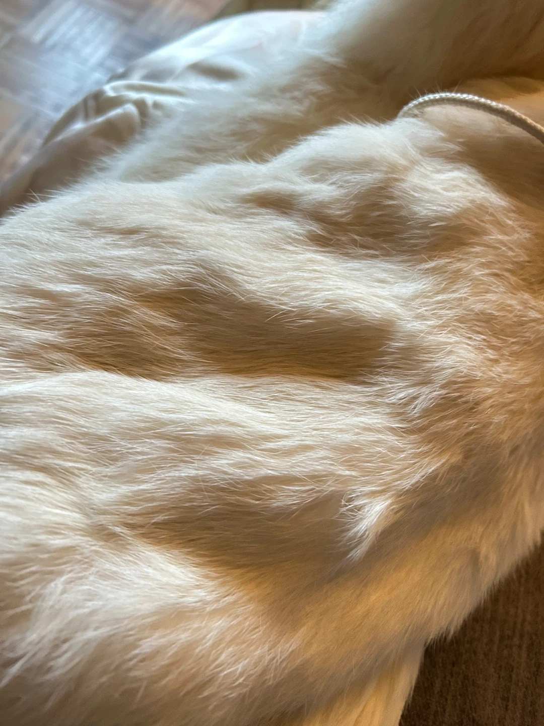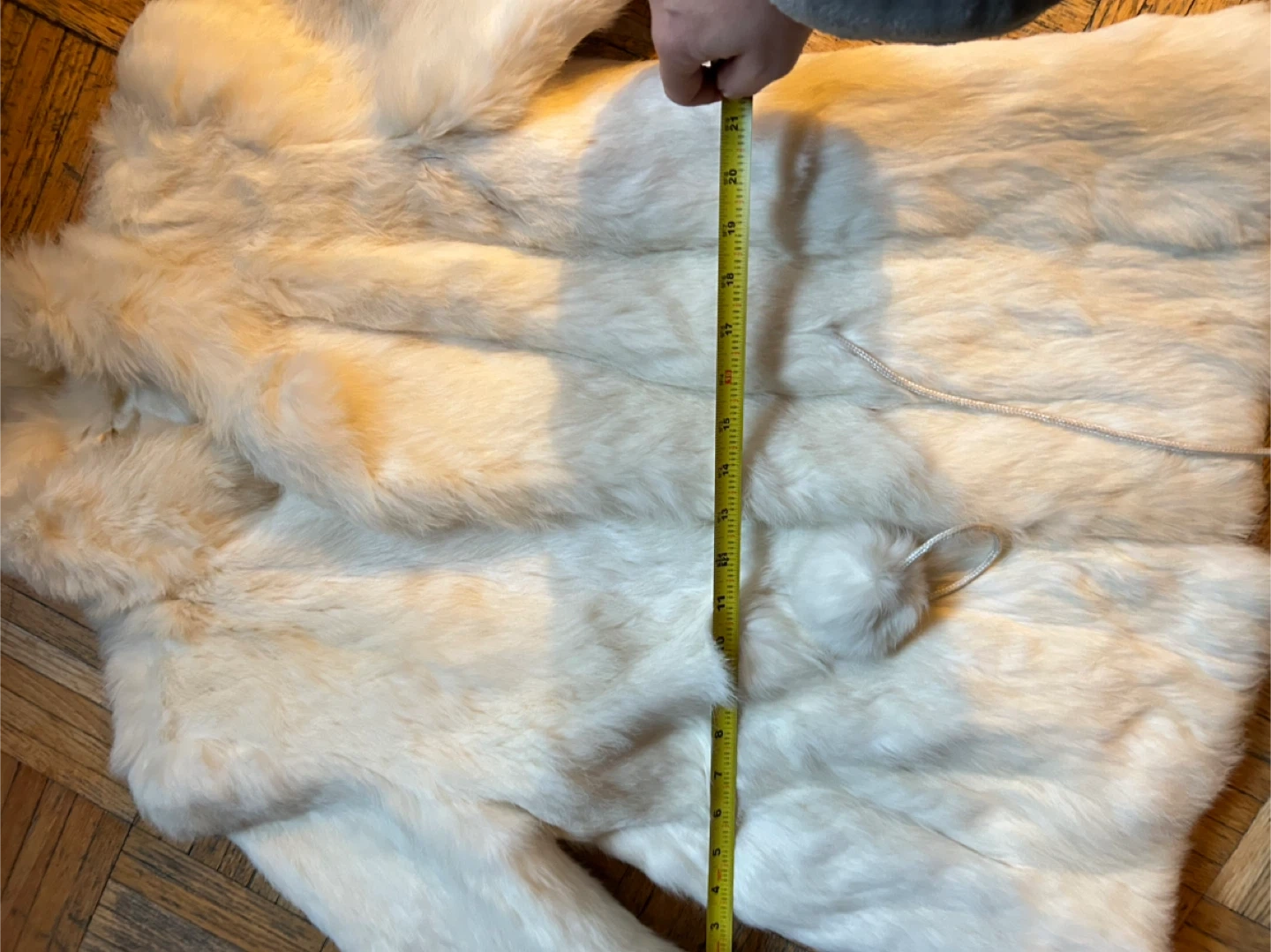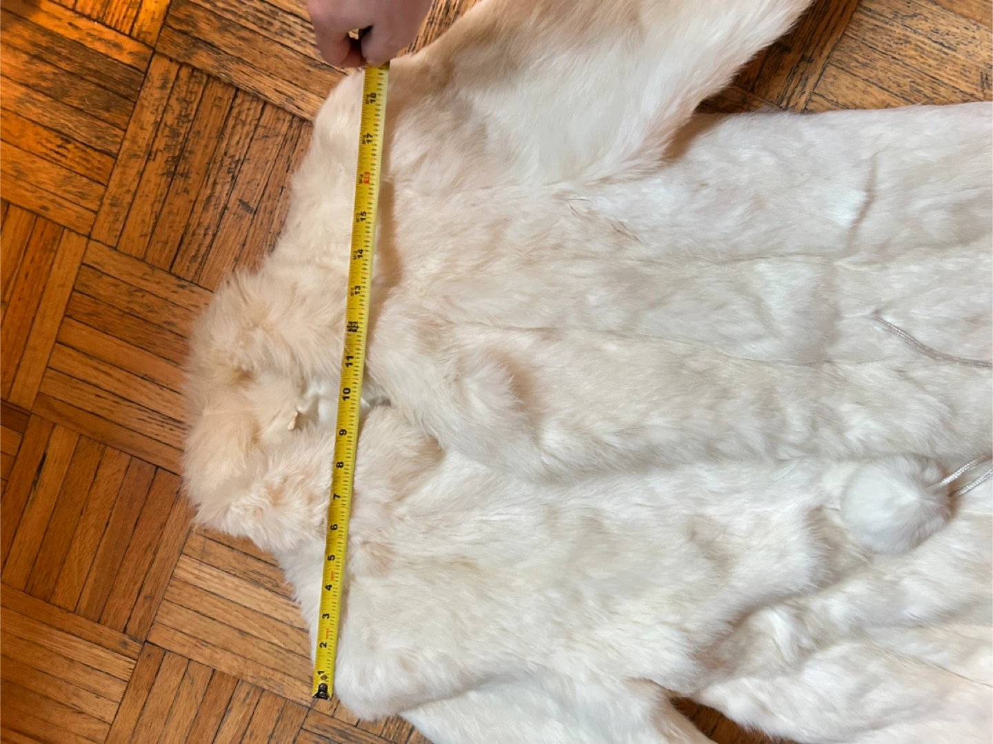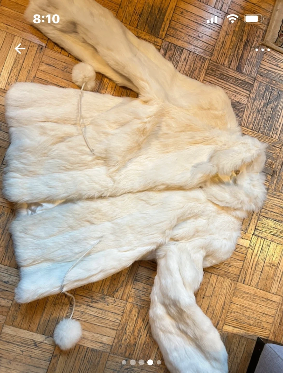 Selling a cute fur jacket in size M. But I wear a US 6 and fits perfectly. It's an off-white color and has a drawstring waist with pom poms. The jacket and lining is in great shape!