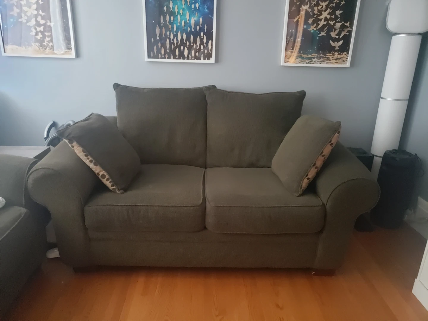 Selling a loveseat sofa in good condition. It's a cozy and comfortable piece, perfect for a smaller space. The colour is a nice neutral brown that should fit in with most decor. Comes with two matching throw pillows!