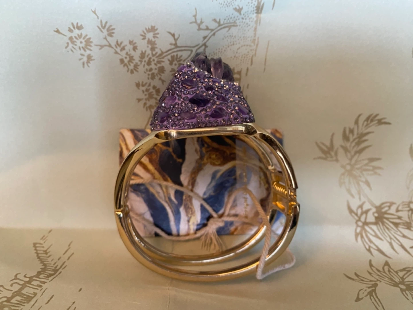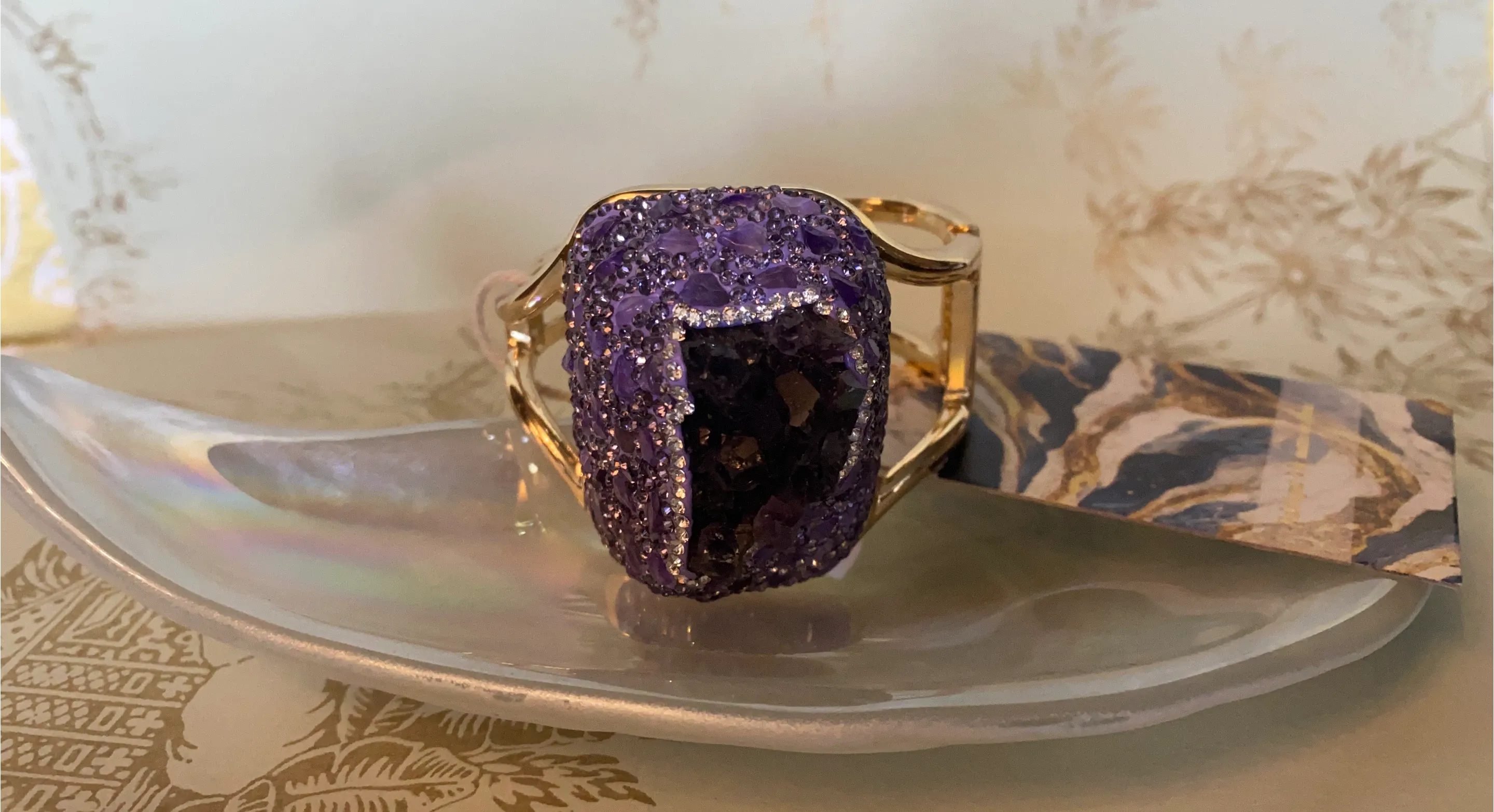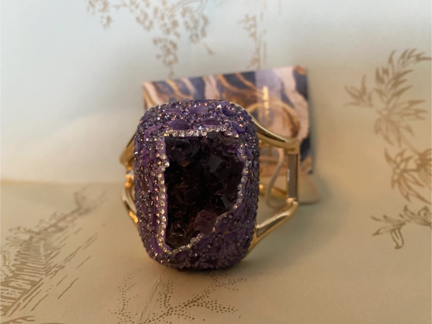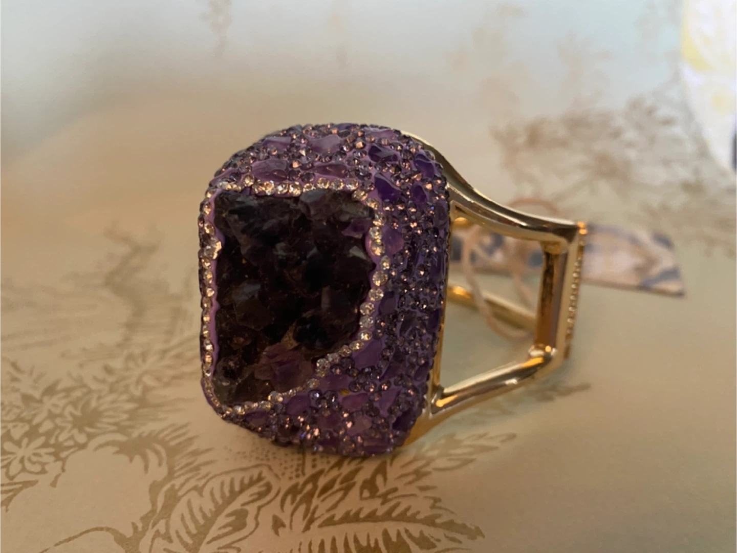 This is a beautiful statement piece! It features a large purple amethyst stone surrounded by smaller amethyst crystals, set in a gold-tone cuff bracelet. Perfect for adding a touch of glam to any outfit follow me @ casa_S_Decor