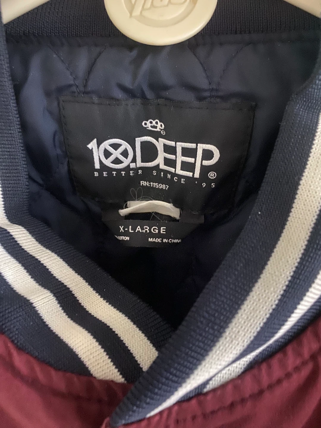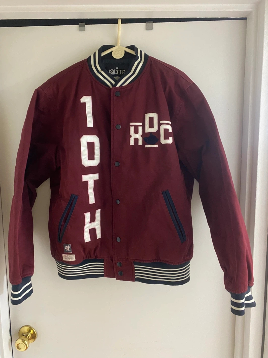 Selling a 10.Deep varsity jacket in size X-Large. It's a stylish burgundy color and has a comfortable fit. Perfect for adding a touch of streetwear to your wardrobe!