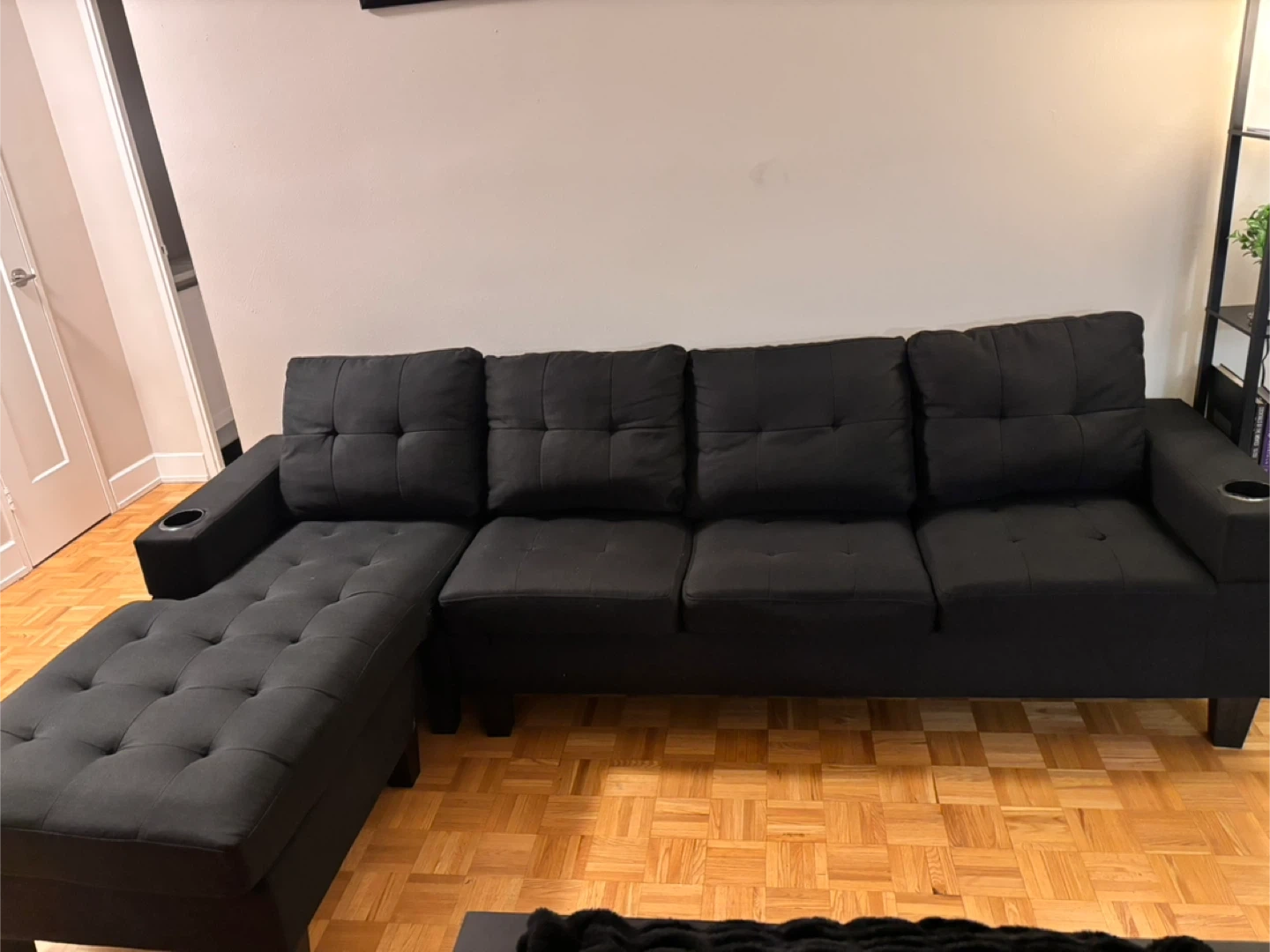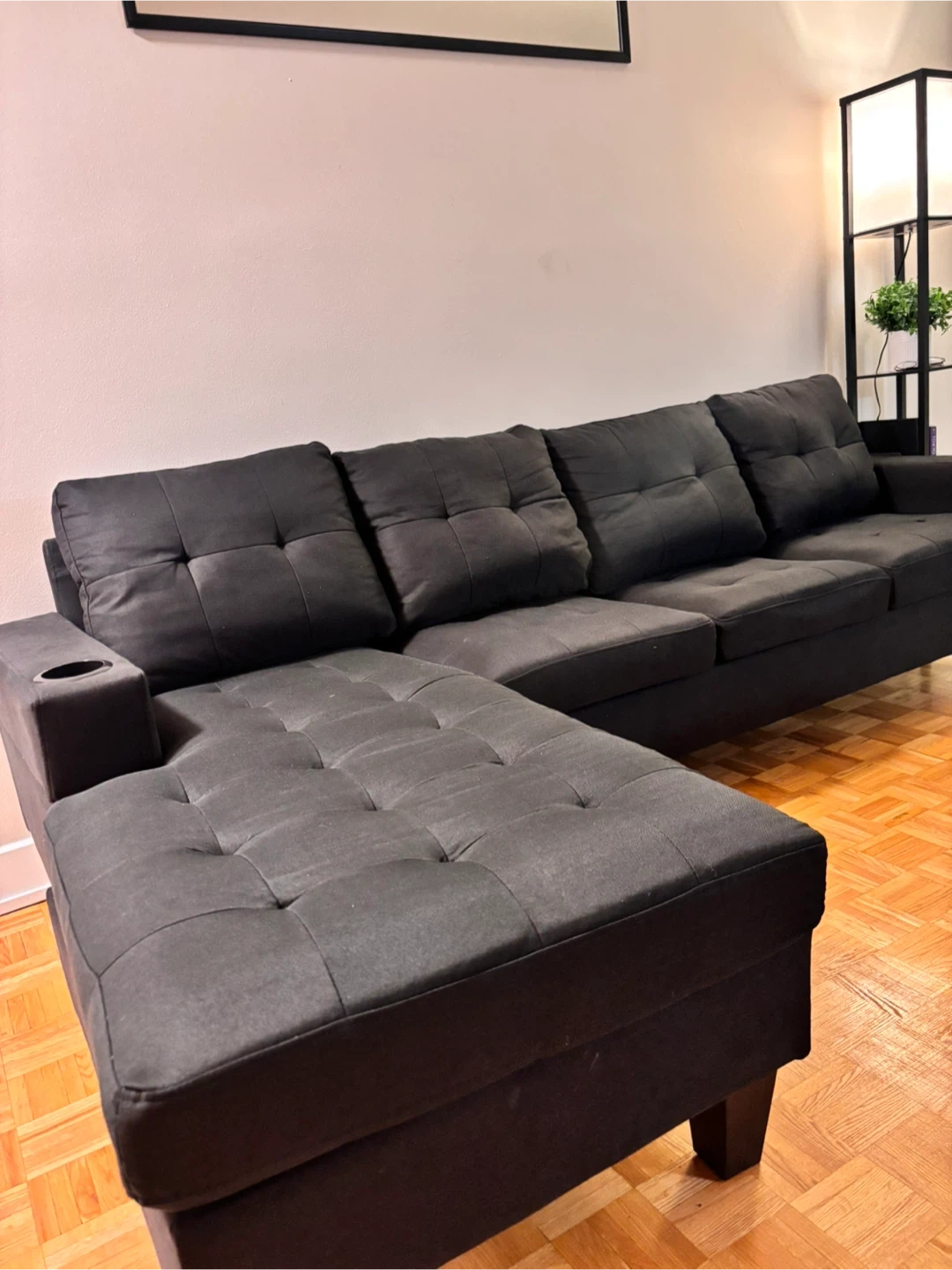 Selling a comfy black sectional sofa with an ottoman! It's in great shape and has a modern look that would fit well in any living room. The ottoman can be arranged on either side, or used as a separate piece. It has a cupholder on each end!