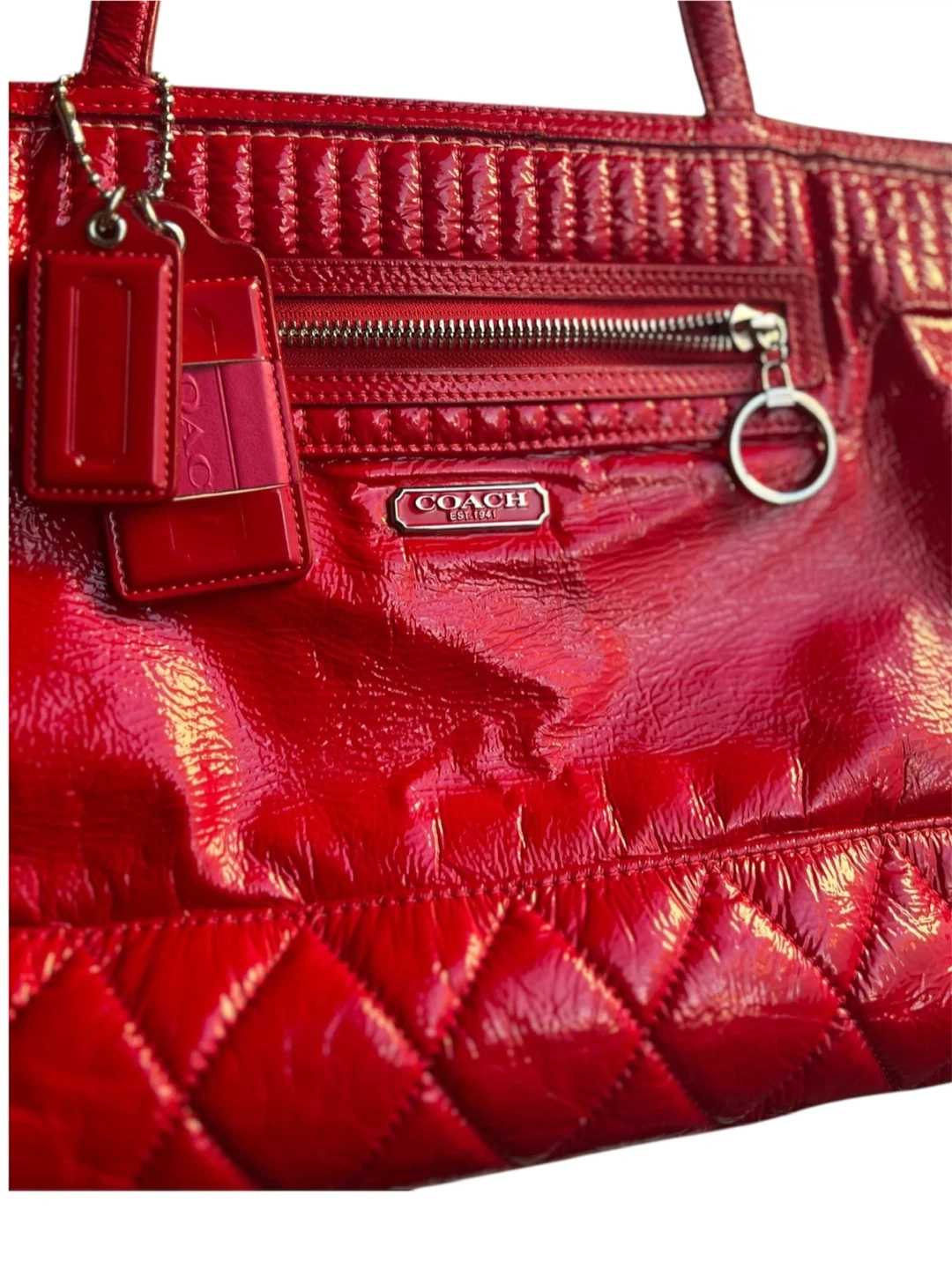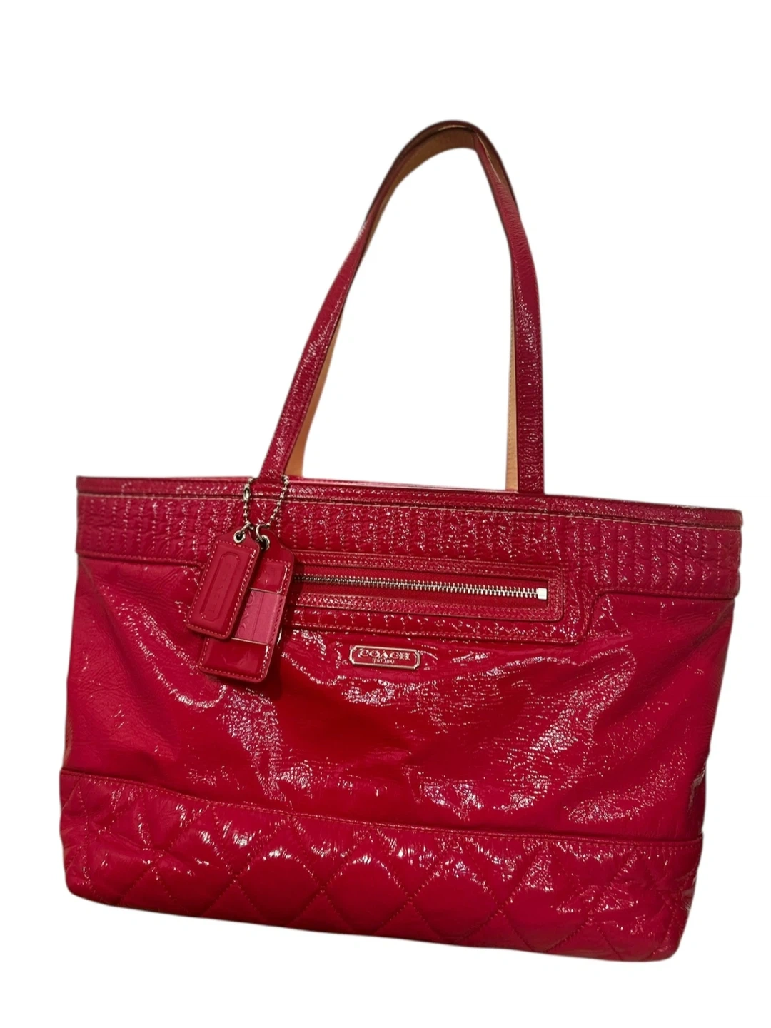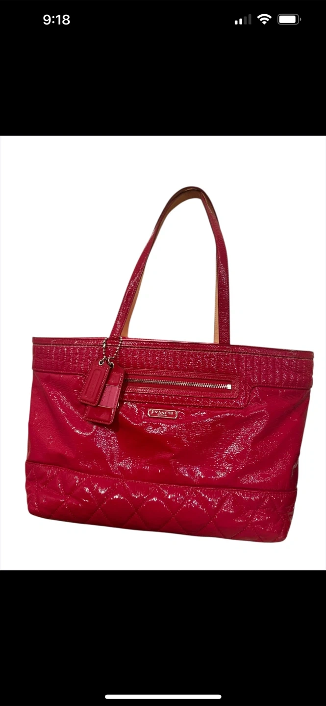 This is a Coach tote bag in a vibrant red patent leather. It features a quilted design on the bottom and top, with a zippered pocket on the front. The interior is lined with a matching red fabric and includes several pockets for organization. It's a stylish and practical bag for everyday use!