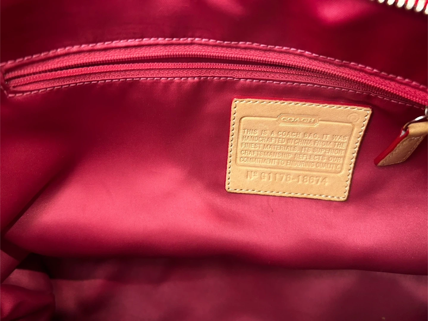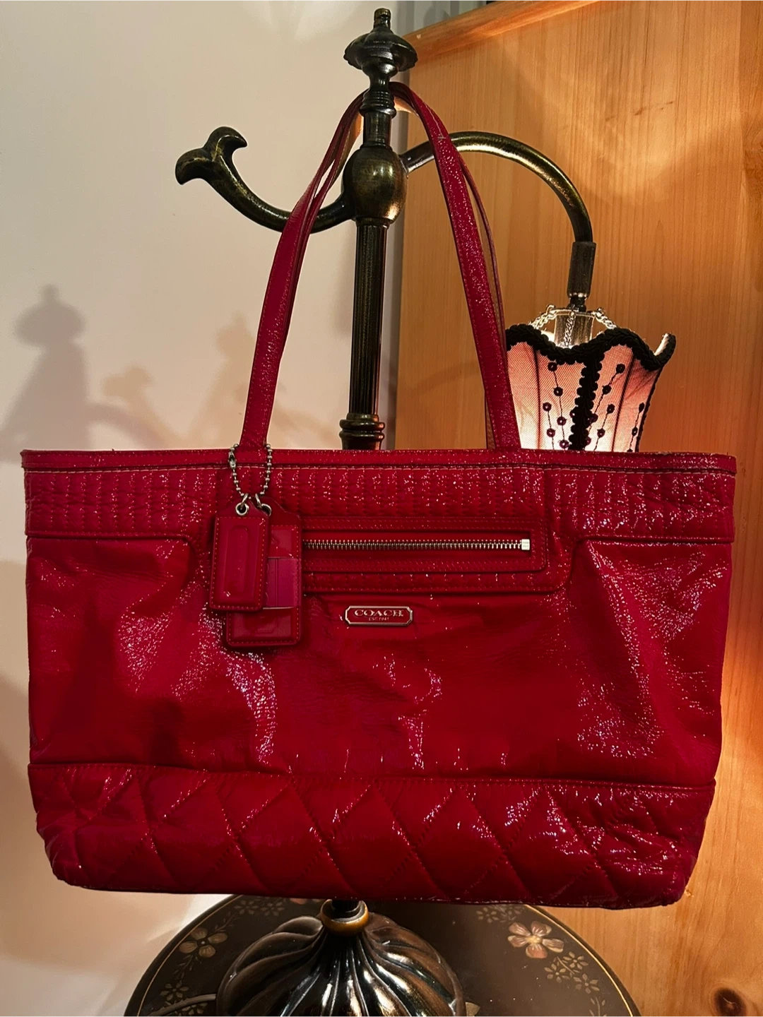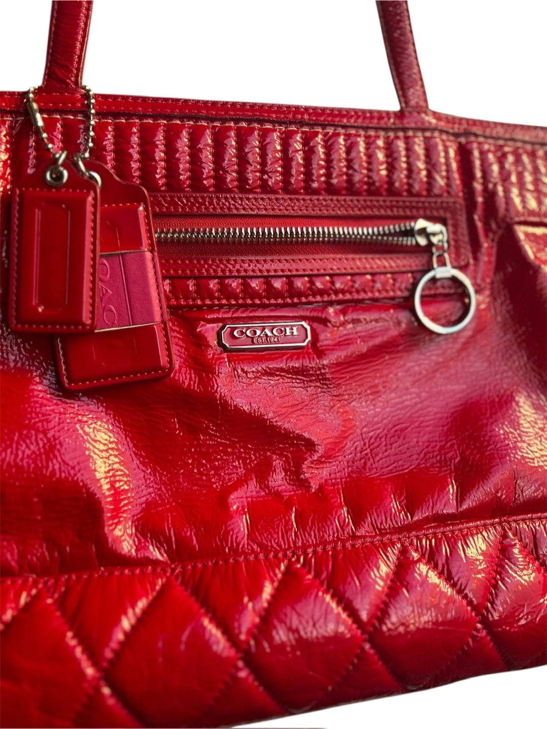 This is a Coach tote bag in a vibrant red patent leather. It features a quilted design on the bottom and top, with a zippered pocket on the front. The interior is lined with a matching red fabric and includes several pockets for organization. It's a stylish and practical bag for everyday use!