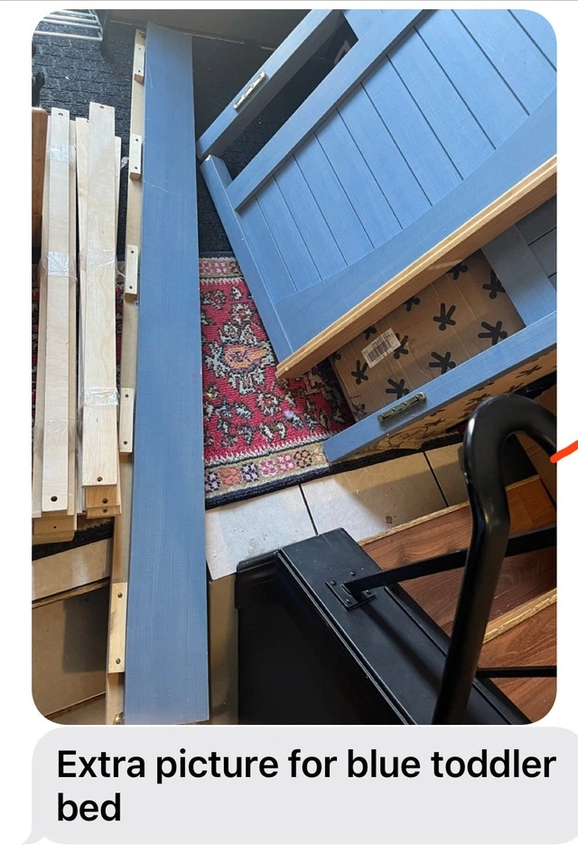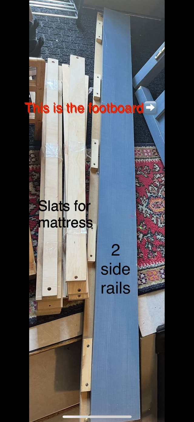 This adorable blue twin bed is ready for a new home! It includes the headboard, footboard, side rails, and mattress slats – everything you need to set it up for your little one. This bed has been lovingly used and is in good condition, perfect for transitioning your child from a crib to a 'big kid' bed. If the ad is up, the bed is available! $80 OBO Pick up Country Hills NE. SERIOUS INQUIRIES ONLY