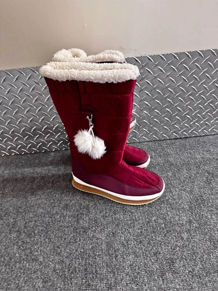 Cozy winter boots. Has super soft fluffy white trim and cute white pom poms on the side. Perfect for staying warm and stylish.