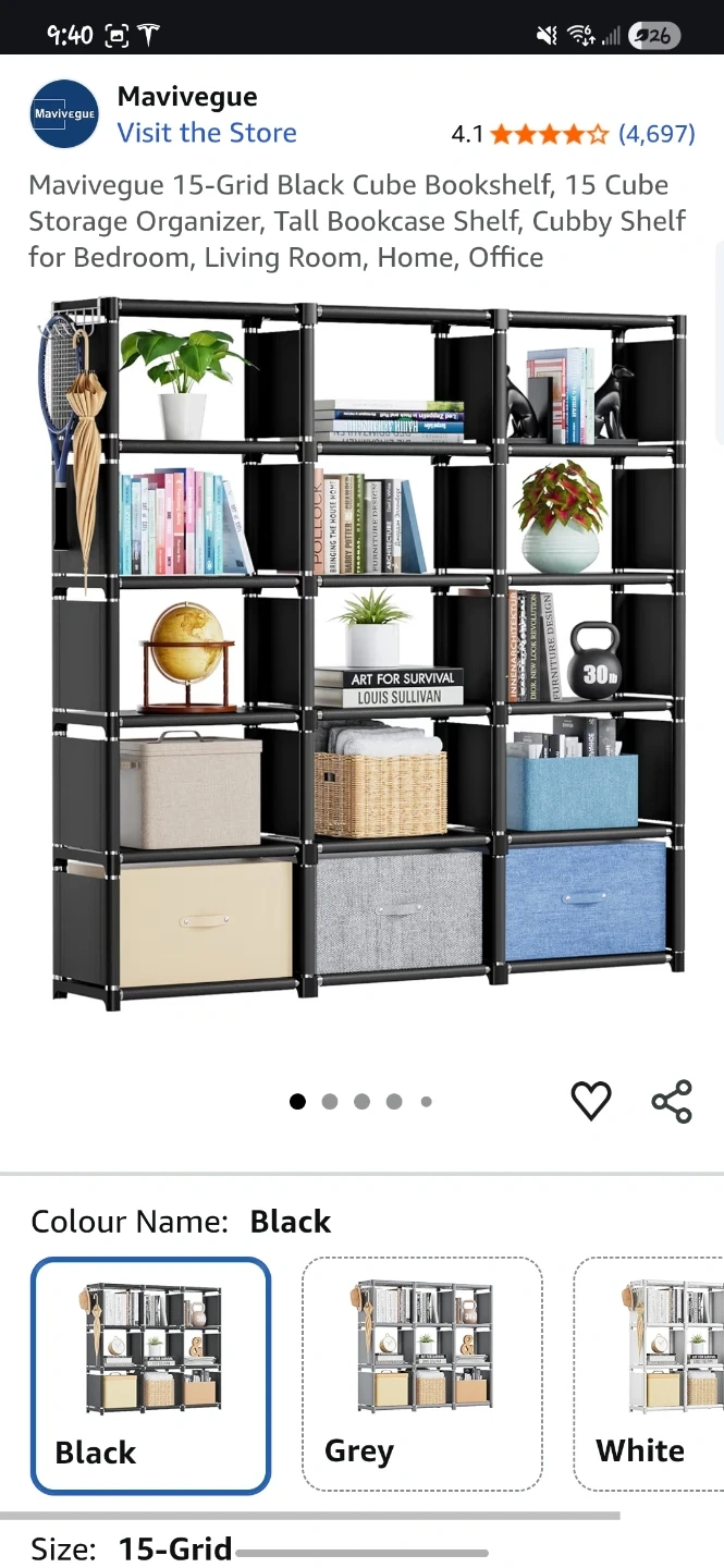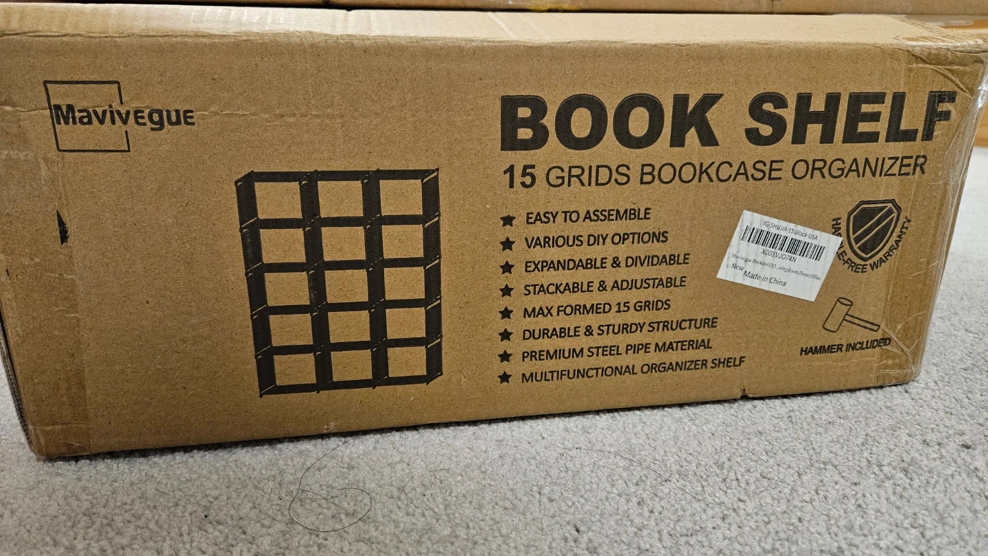 Selling a brand new Mavivegue 15-Grid Black Cube Bookshelf! It's still in its original packaging and ready to assemble. This bookshelf is easy to put together and offers various DIY options. It's expandable, dividable, stackable, and adjustable, with a durable and sturdy structure made from premium steel pipe material. Plus, it's a multifunctional organizer shelf!