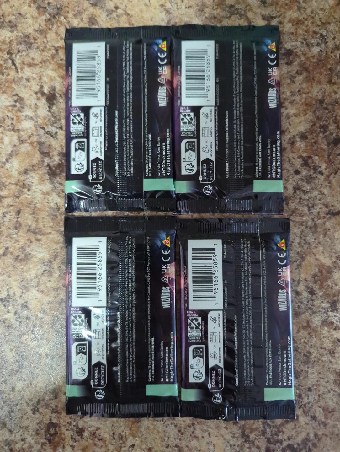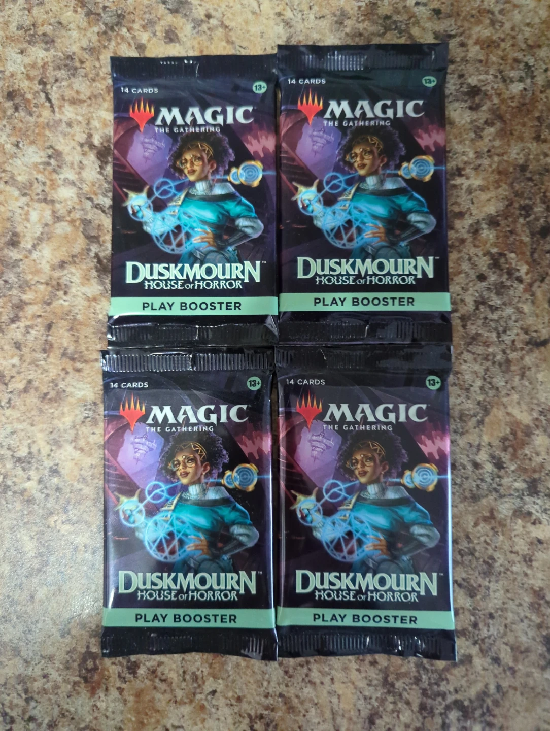 Selling four packs of Magic The Gathering: Duskmourn House of Horror Play Boosters! Each pack contains 14 cards and is suitable for ages 13+