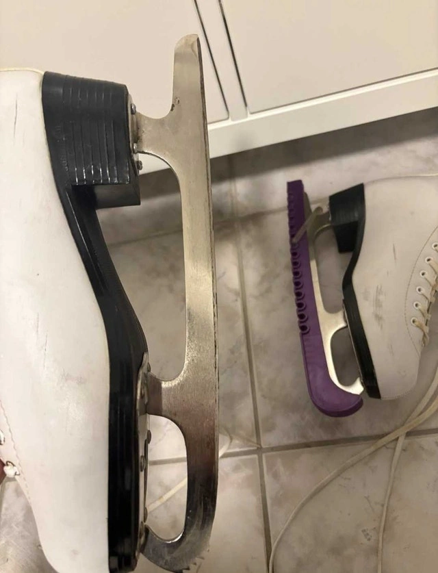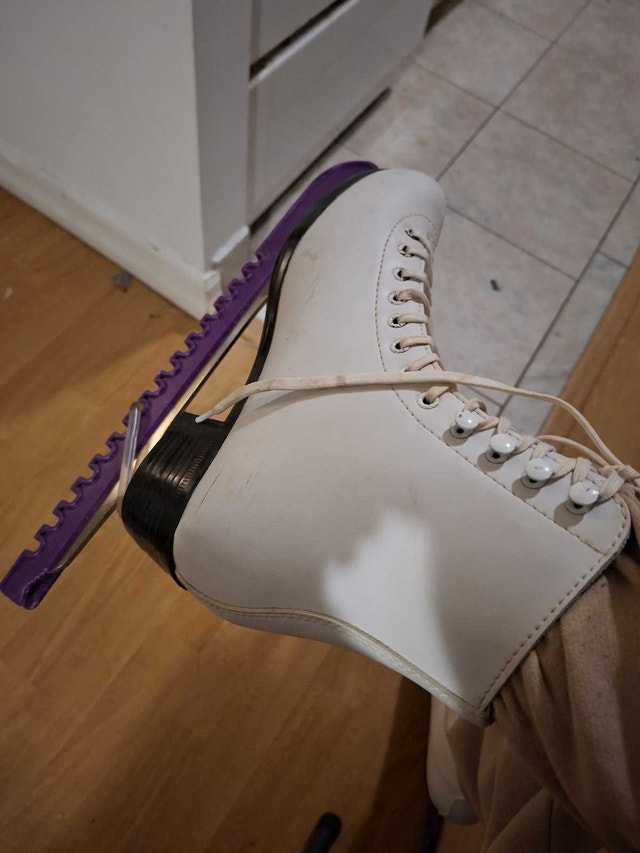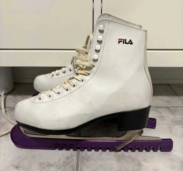 These are my Fila size 8 figure skates, great for recreational skating and learning new skills! These skates have seen some use, but they still have a lot of life left in them, ready for the rink. The blades are in decent shape, and the boots provide good ankle support.