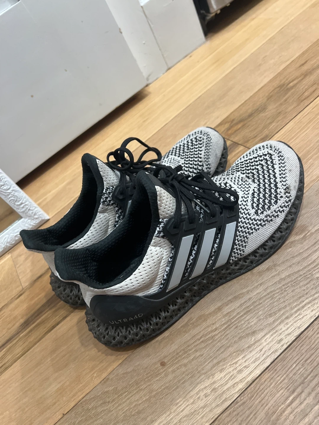 Selling a pair of Adidas Ultra 4D sneakers. They are white with black detailing and the classic Adidas stripes. The sole has a unique 4D printed design. Perfect for running or casual wear!