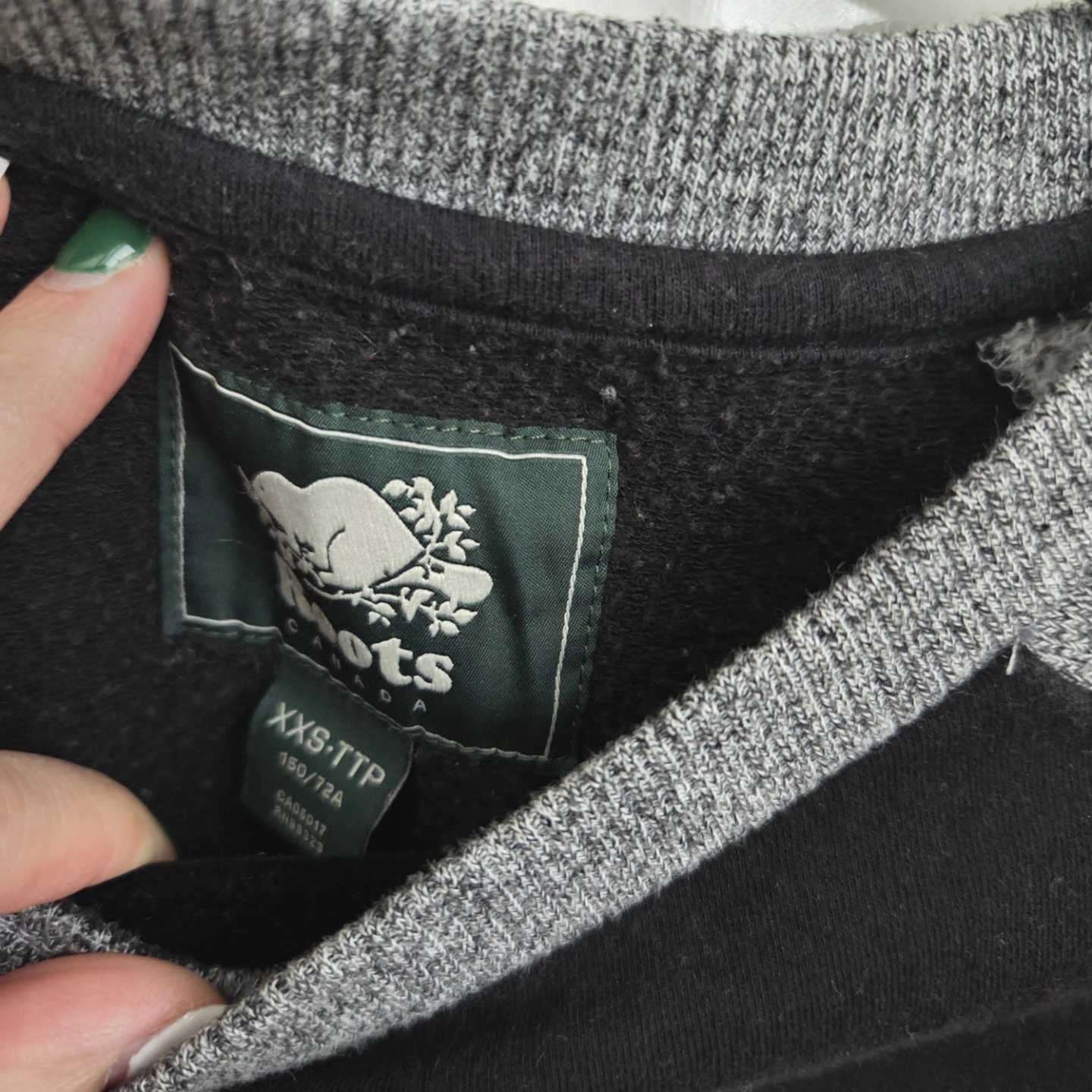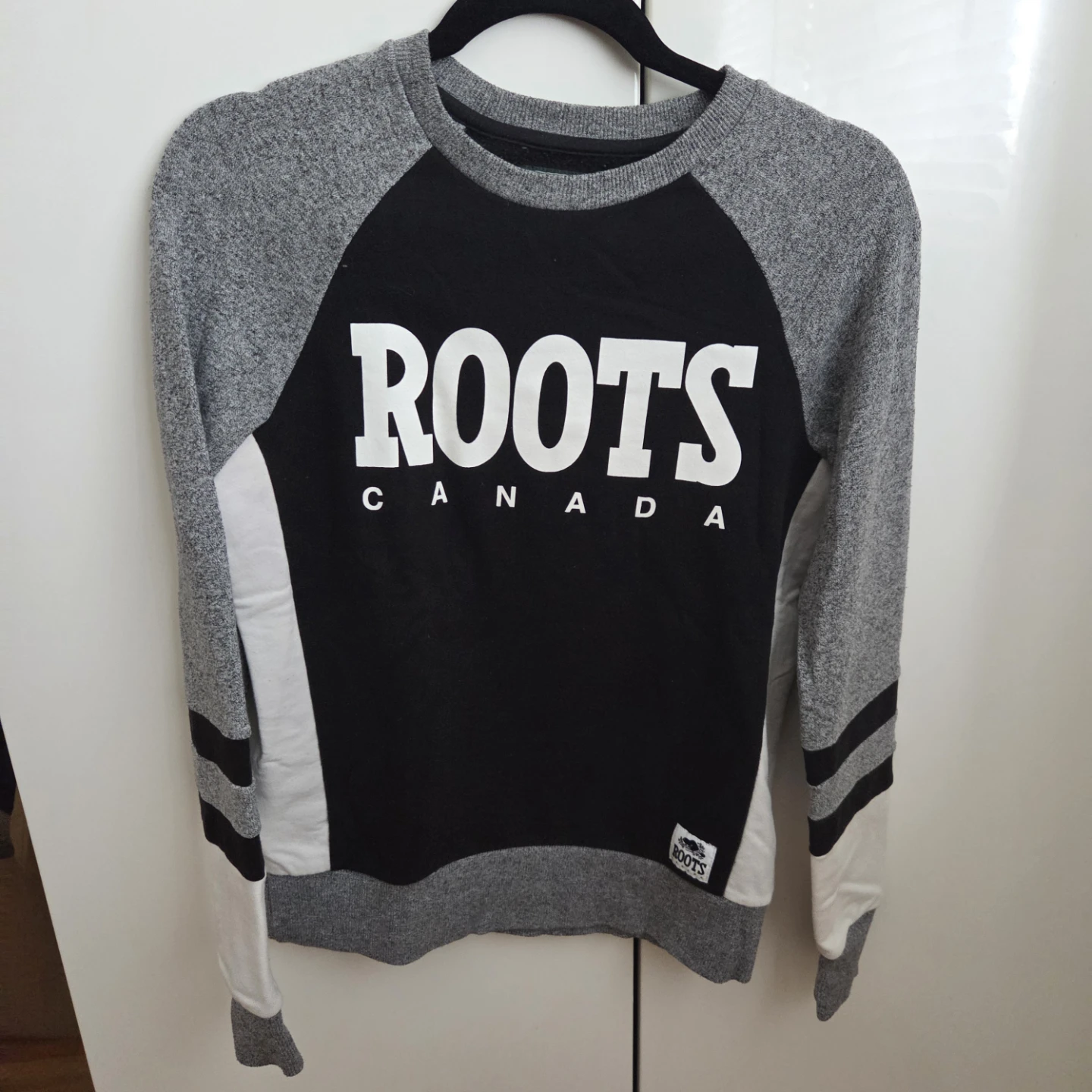 Selling a Roots Canada sweatshirt in size XXS. It features a black body with the Roots logo, grey sleeves, and white accents.