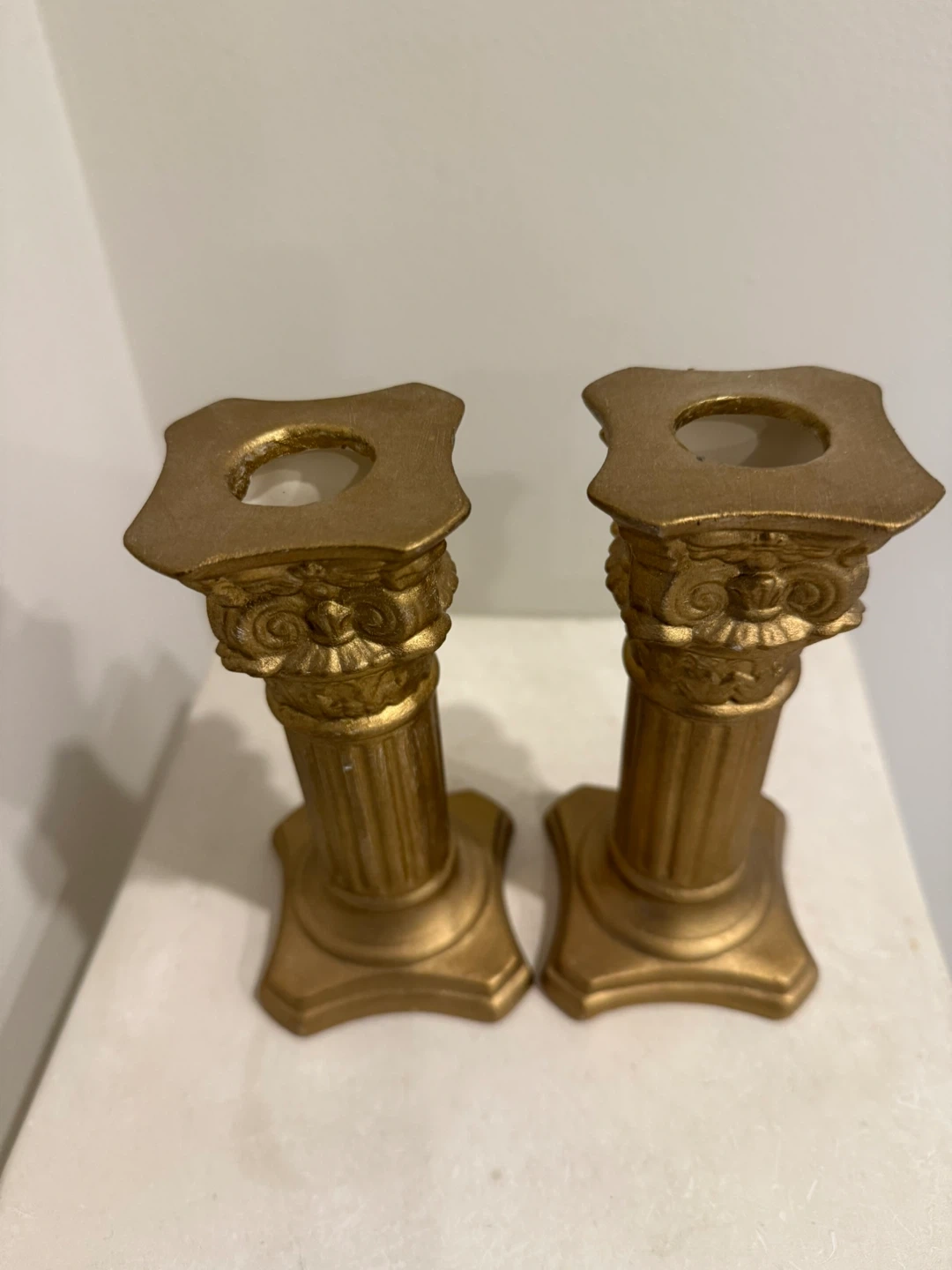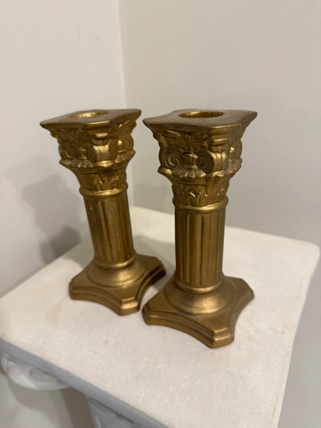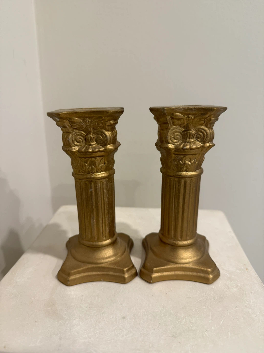 Selling a pair of decorative candle holders that are hand painted ceramics. They are gold and shaped like classic columns. Perfect for adding a touch of elegance to your home decor!