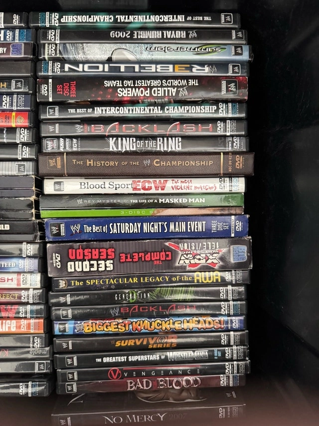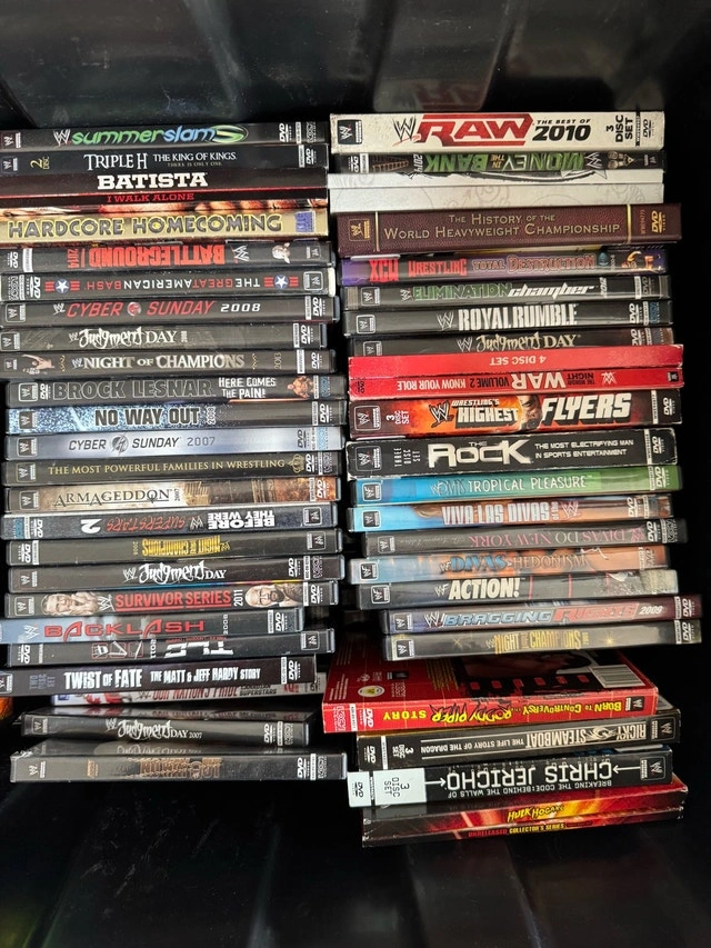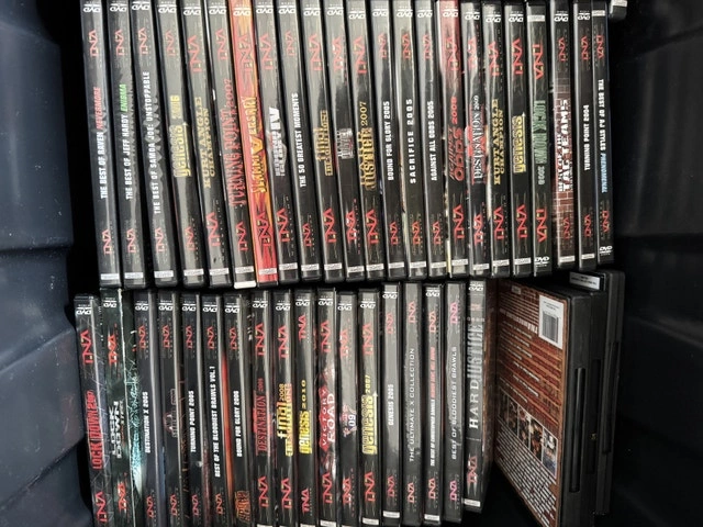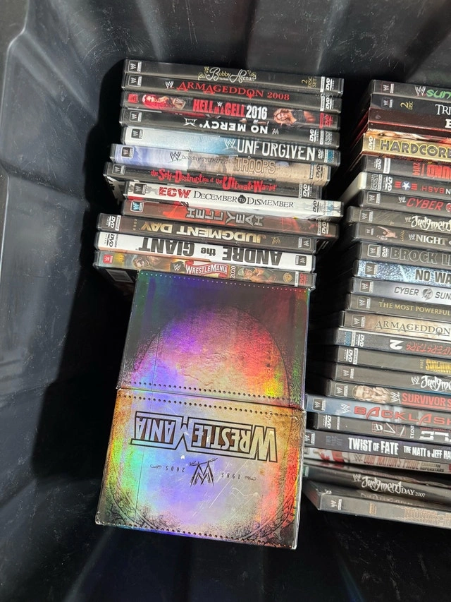 Huge wrestling/wwe collection need gone as I’m moving and can’t bring with and could use the funds. 2 bins full of DVDs including tons of TNAs etc . Also have the complete anthology, also a bunch of elite figures sealed and over 1k cards. This is a huge collection 3 bins full of stuff Feel free to come by and take a look easily double to triple value here . I’m asking 2k Thanks