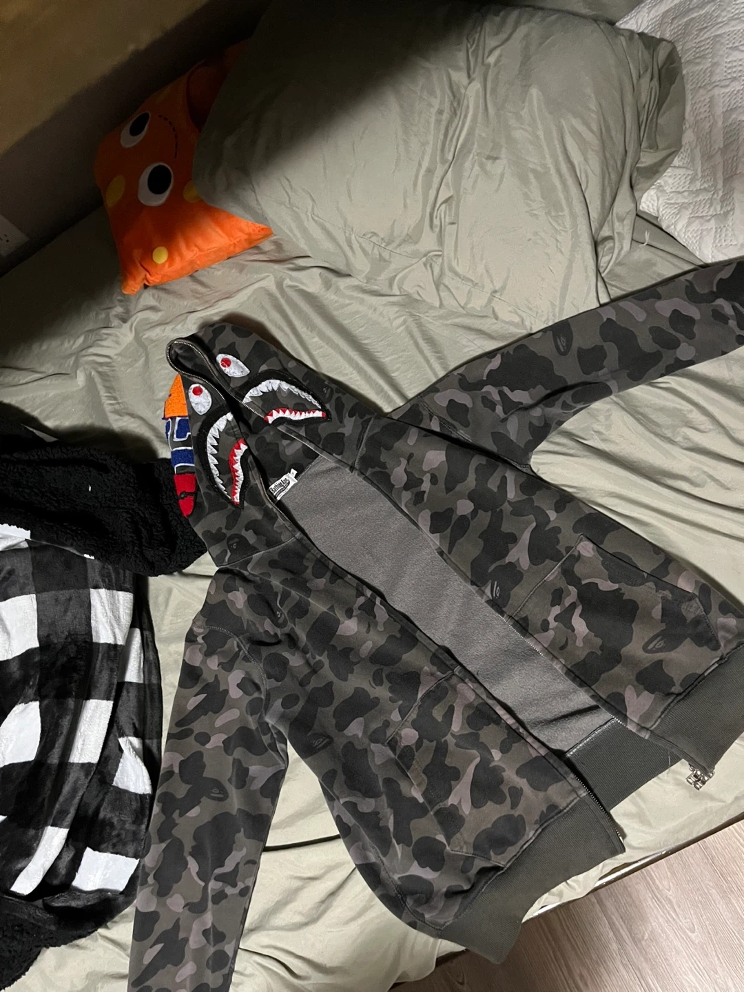 Selling a BAPE camo shark hoodie in size medium! It's in good condition and features the iconic shark design.