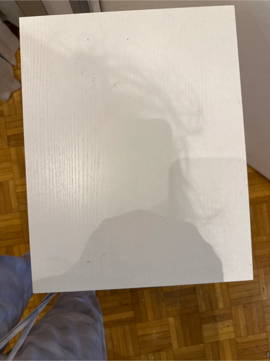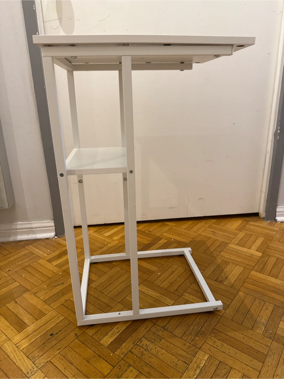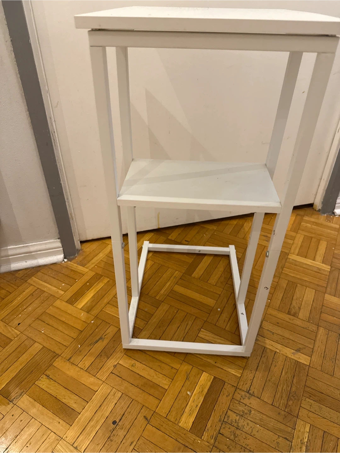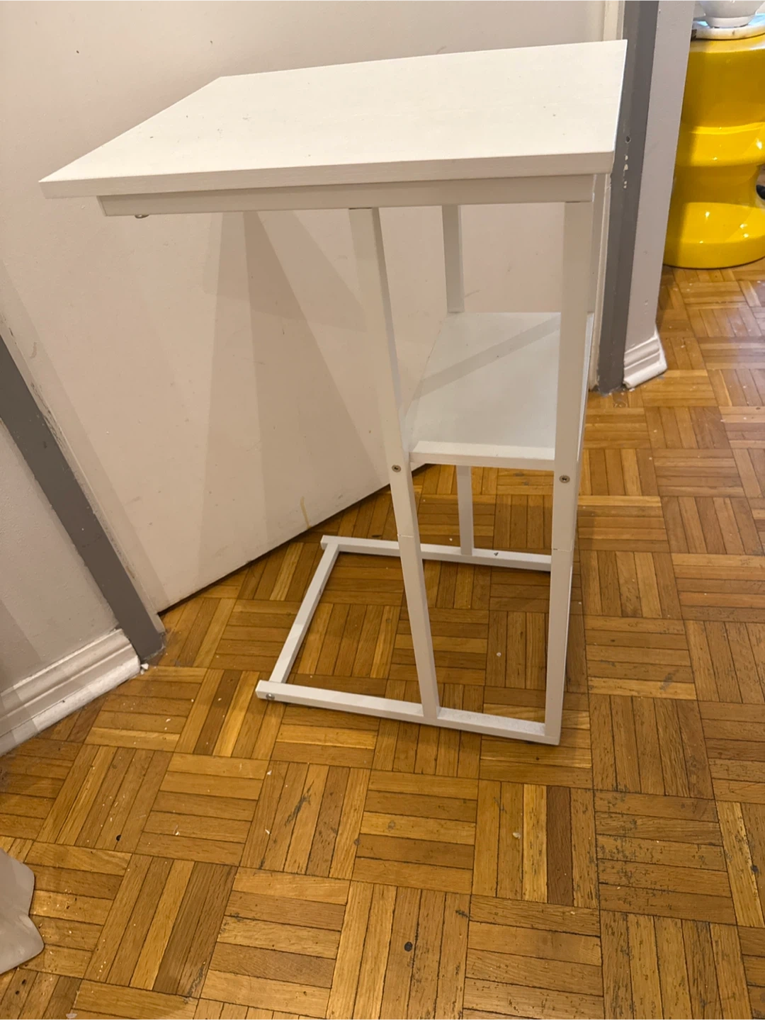 Selling a handy white side table! It's perfect for small spaces and has a convenient shelf for extra storage. Great for beside a couch or bed!