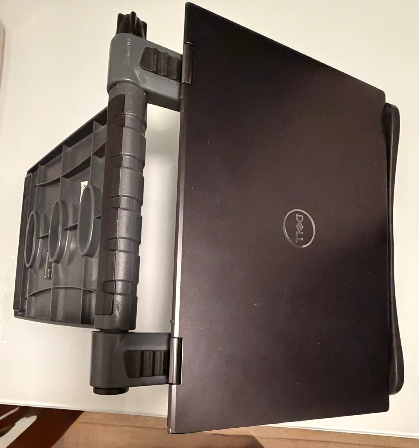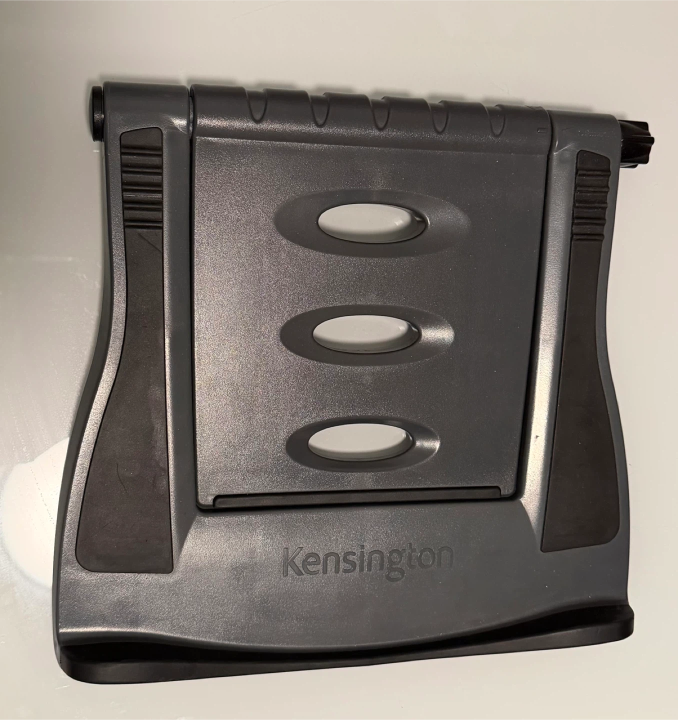 Great condition Kensington laptop stand. Has a sturdy design with multiple height settings. The stand is made of durable plastic and is designed to hold laptops securely. 1 picture has been added with laptop view.