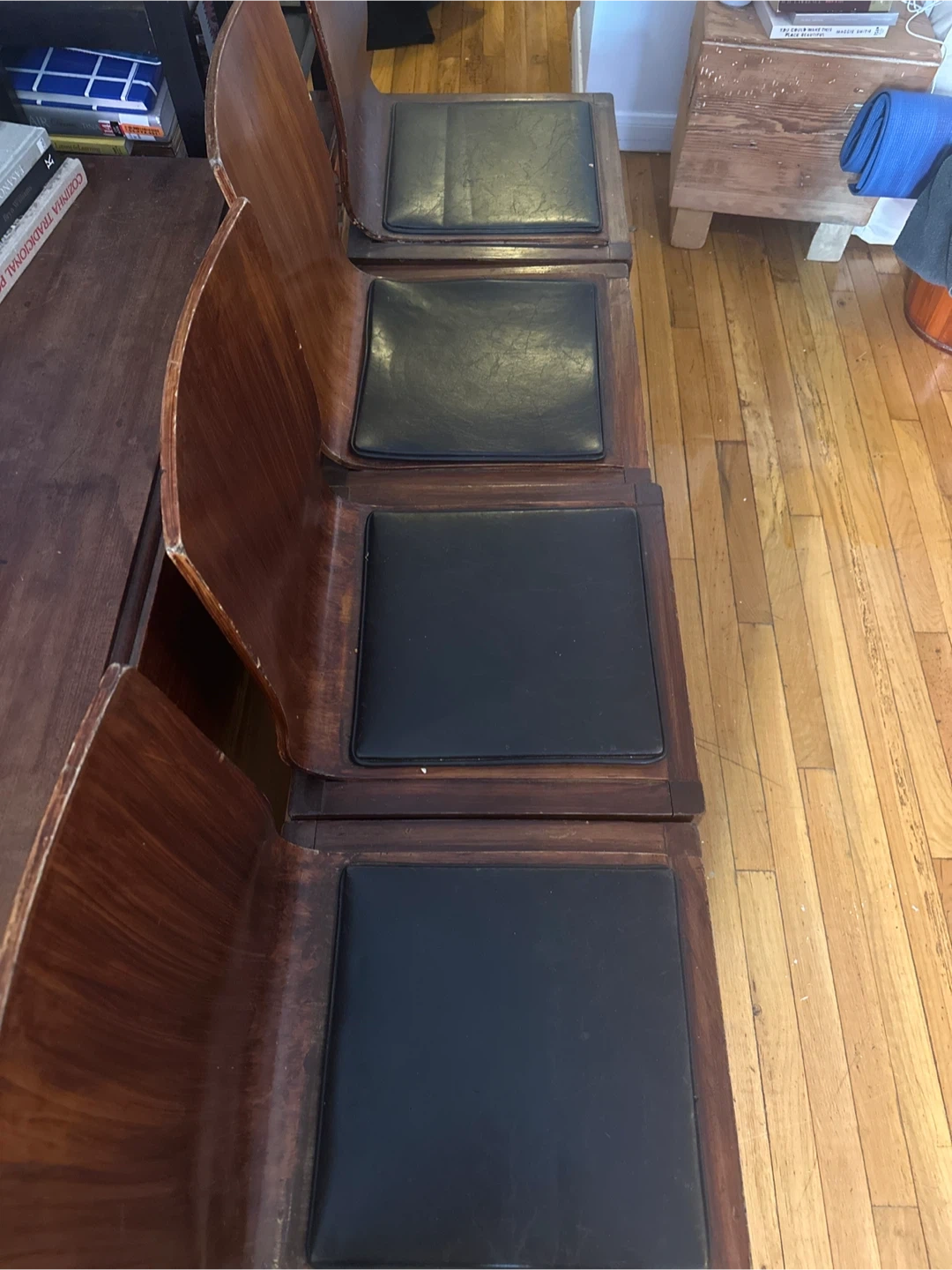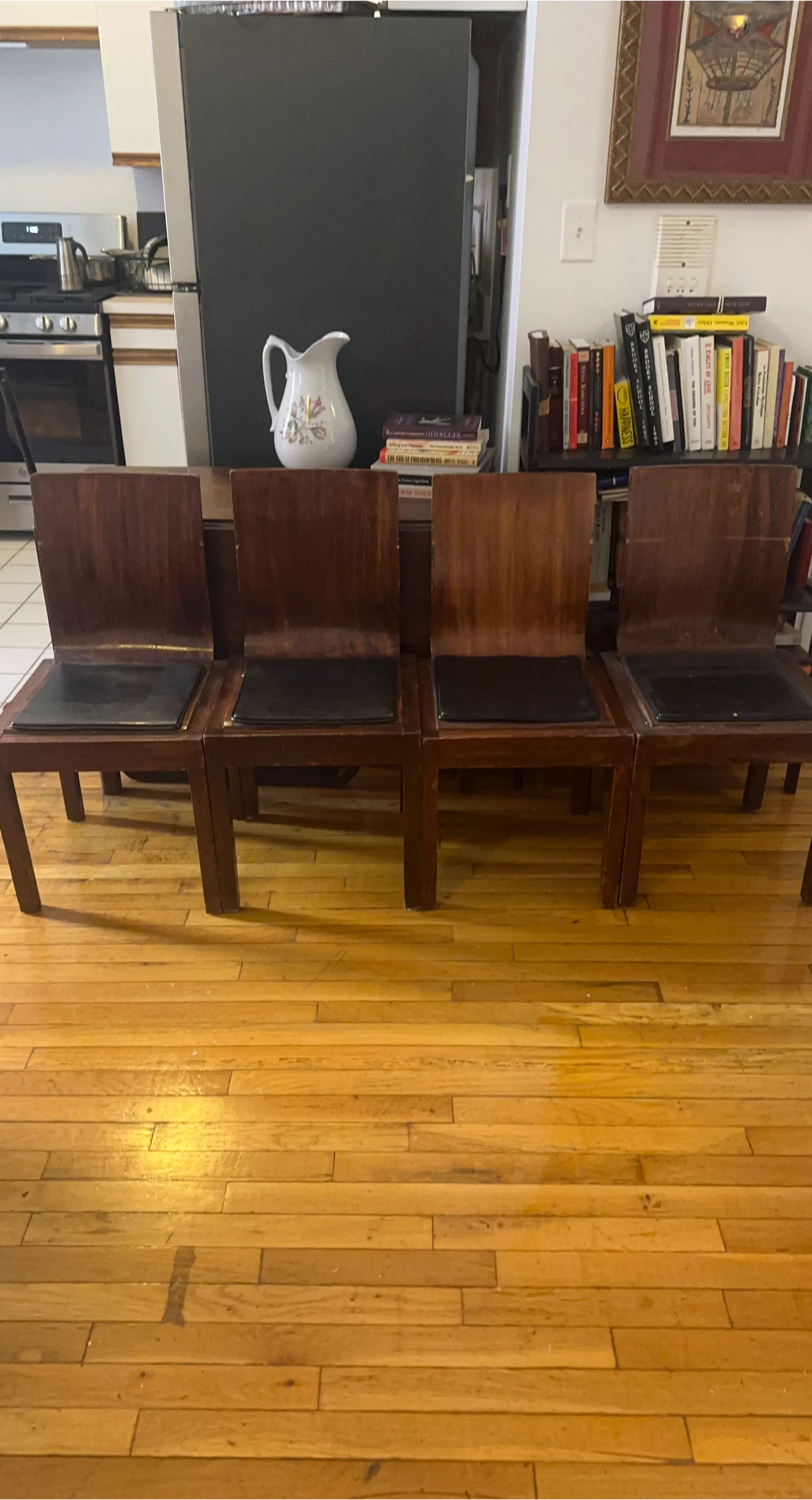 Selling a set of 4 wooden dining chairs. They have a beautiful wood finish with black leather cushioned seats. They're sturdy and ready to add some character to your dining area!