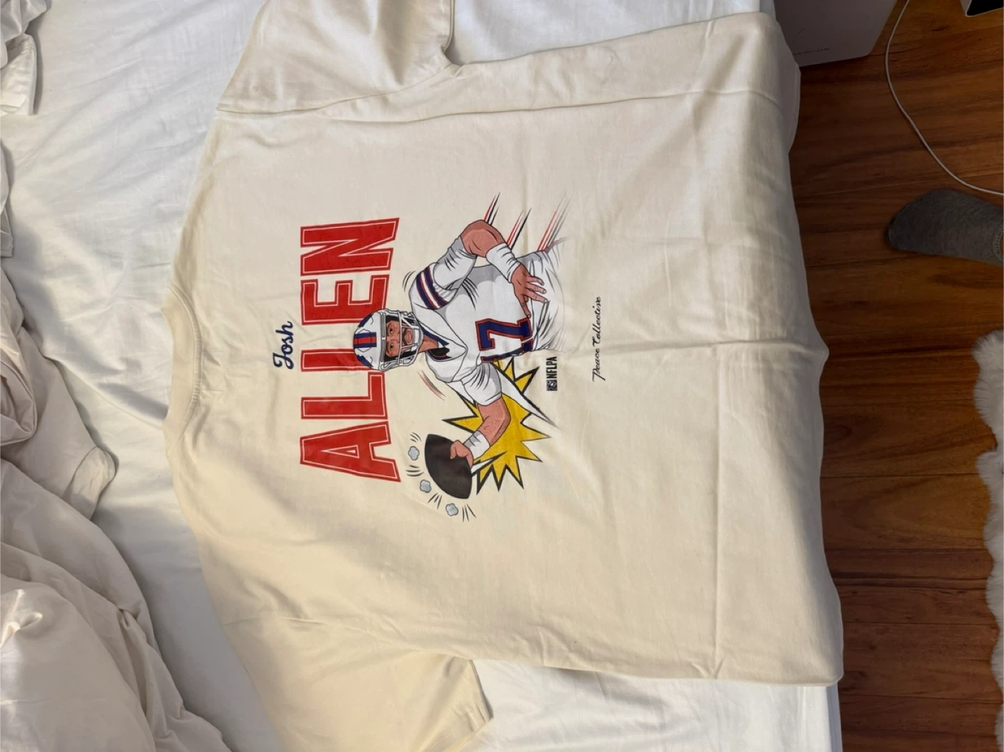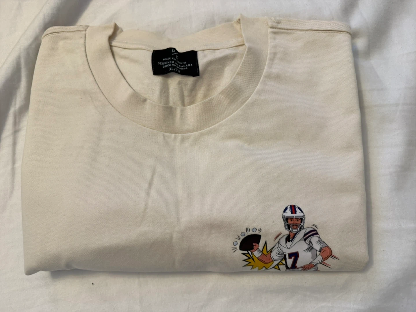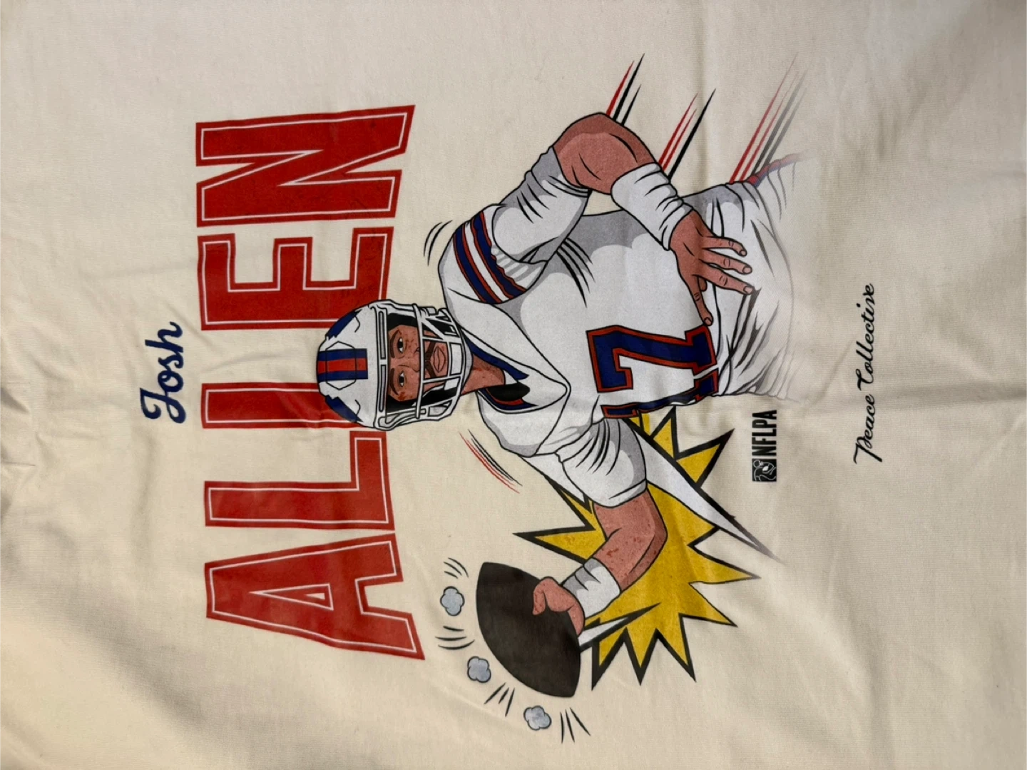 Peace Collective t-shirt featuring Josh Allen. It's an extra large (XL). The shirt is a cream/off-white colour and has a graphic of Josh Allen on the front