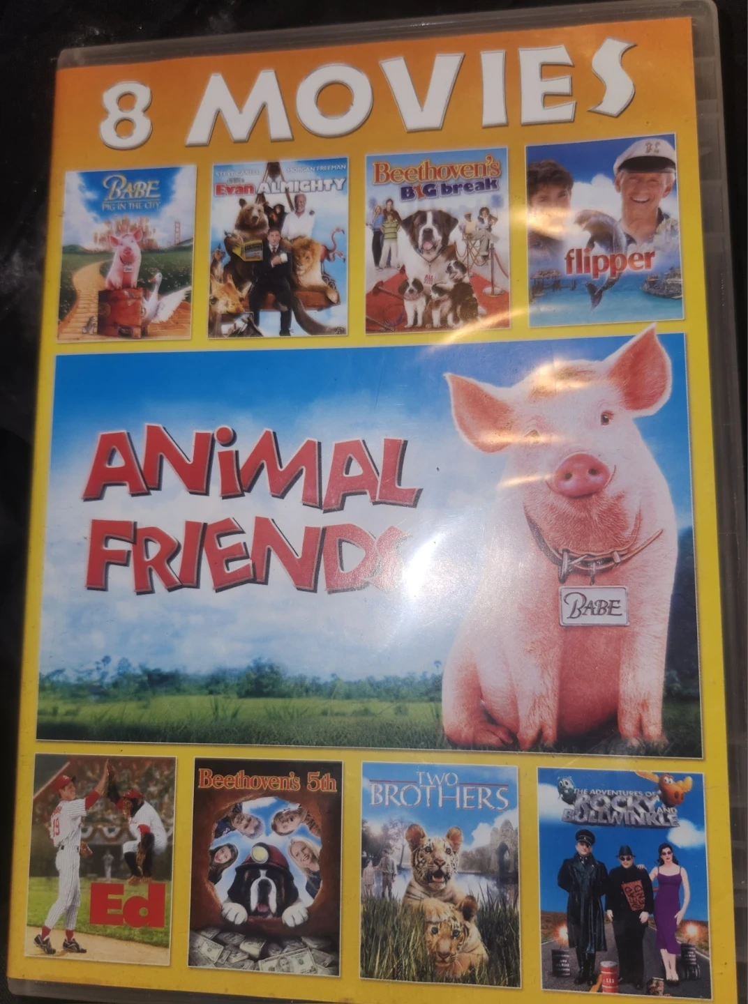 Selling a DVD featuring 8 movies including Babe, Evan Almighty, Beethoven's Big Break, Flipper, Ed, Beethoven's 5th, Two Brothers, and The Adventures of Rocky and Bullwinkle! It's a great collection for family movie night. Pick up only unless near intersection of Oxford and Gammage Street.