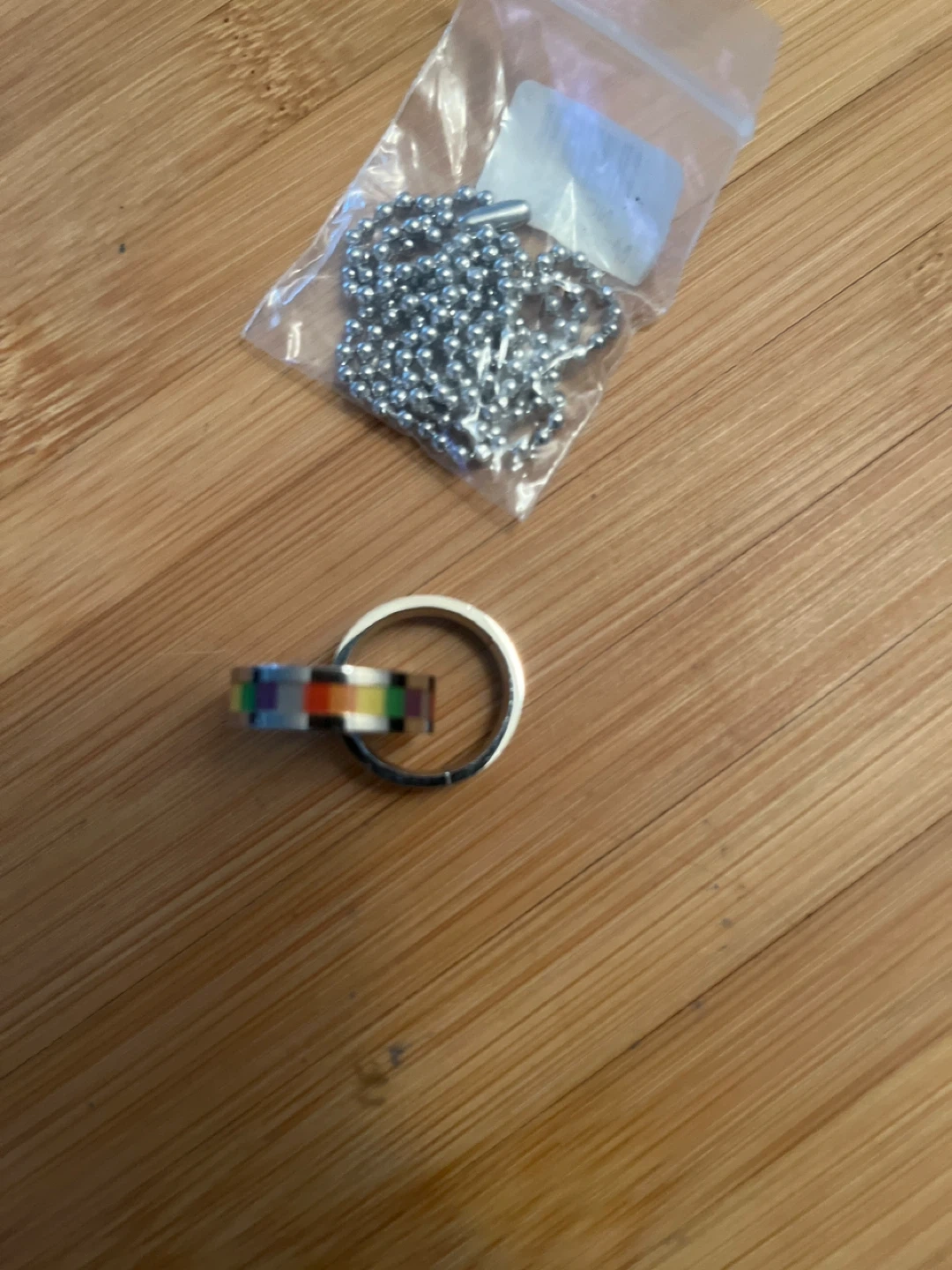 Selling two intertwined ring with a unique rainbow design. It comes with a chain, so you can wear it as a necklace if you like! It's in great condition and ready for a new owner