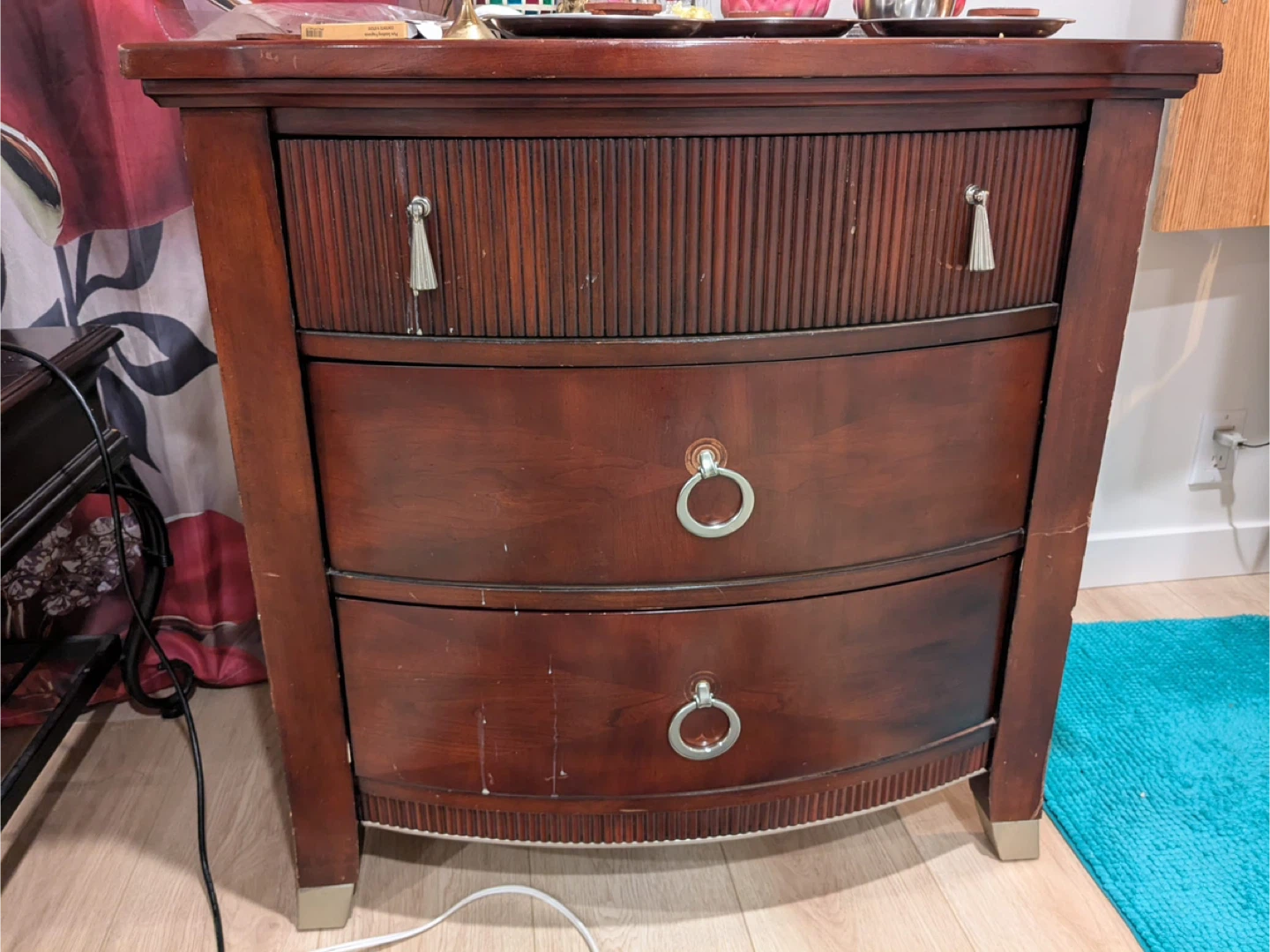 Selling a wooden nightstand with three drawers. It has a lovely, classic design with silver-tone hardware. There are some signs of wear and tear, as shown in the photos, but it's still a sturdy and functional piece of furniture for your bedroom or living space