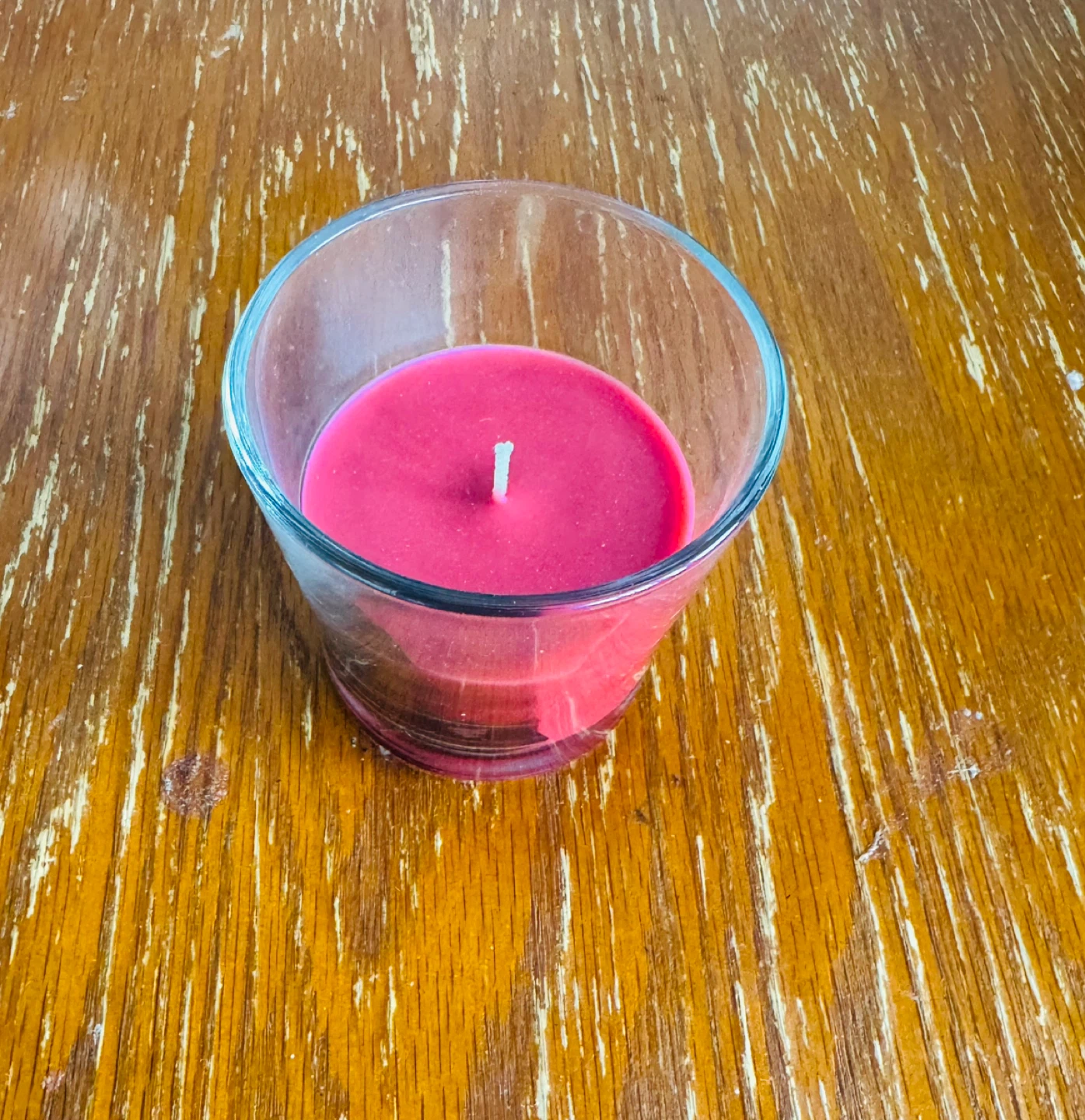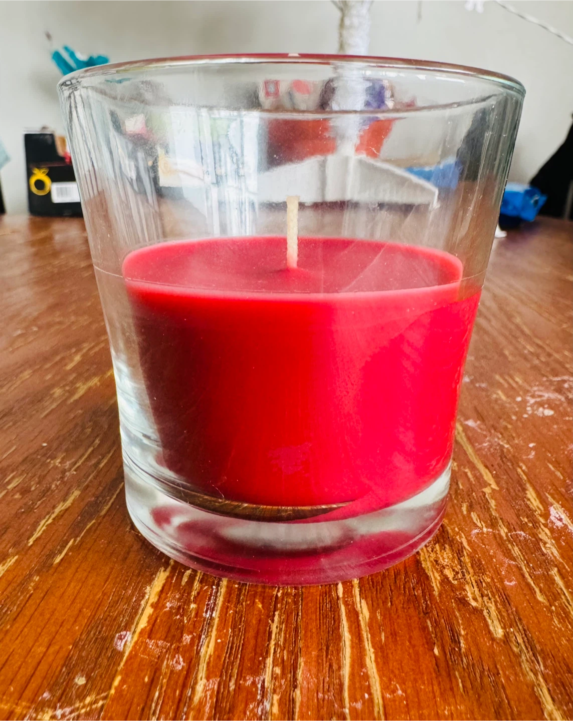 A vibrant red scented candle nestled in a clear glass holder. It's perfect for adding a touch of warmth and fragrance to any room. The candle is in great condition and ready to brighten up your space!