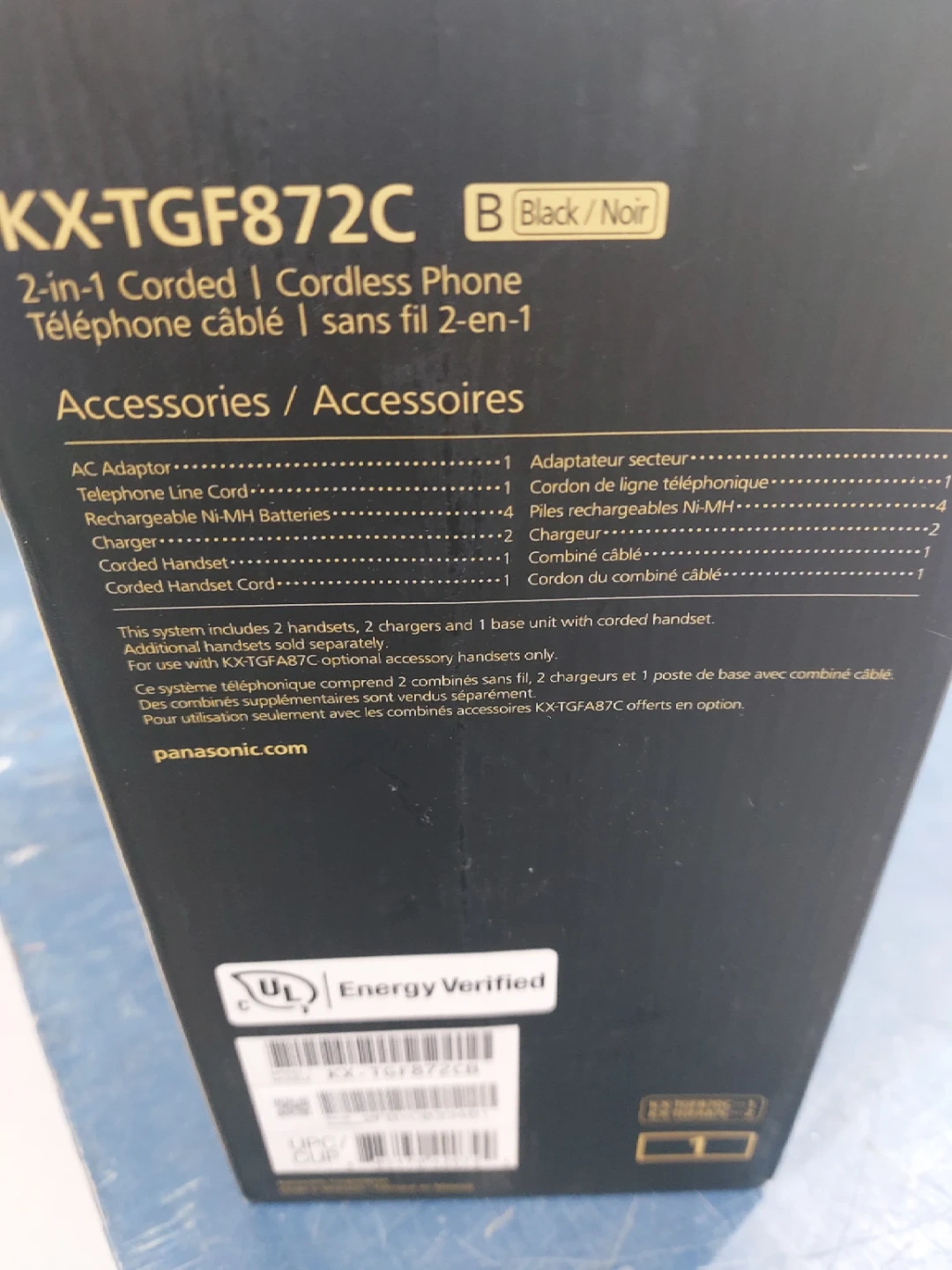 Selling a Panasonic KX-TGF872C 2-in-1 corded/cordless phone in black. It comes with the AC adaptor, telephone line cord, rechargeable Ni-MH batteries, charger, corded handset, and corded handset cord. The box is included!