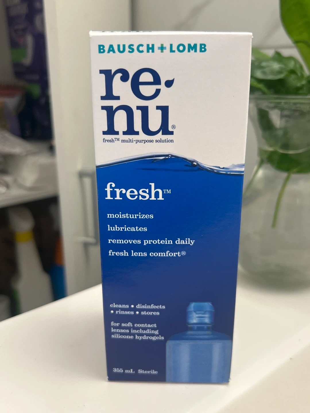 Selling a bottle of unopened Bausch + Lomb re-nu Fresh multi-purpose solution for soft contact lenses, including silicone hydrogels. It moisturizes, lubricates, and removes protein daily for fresh lens comfort. Expiry date is 2027 September 01. 355 mL sterile
