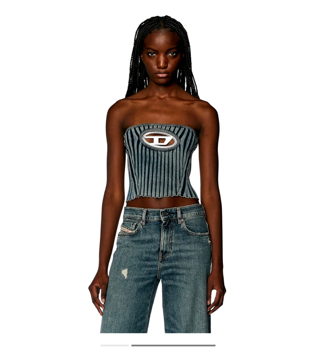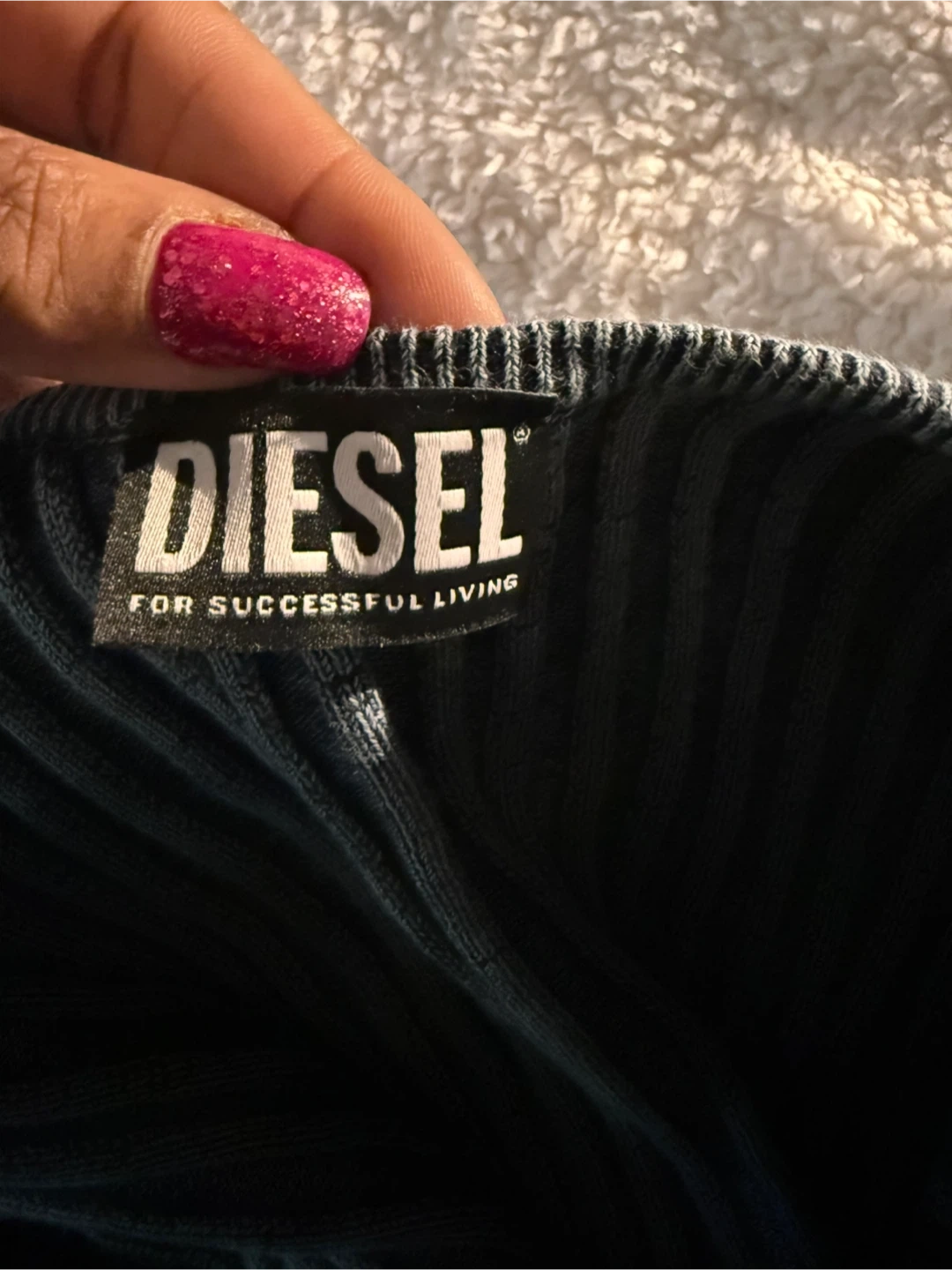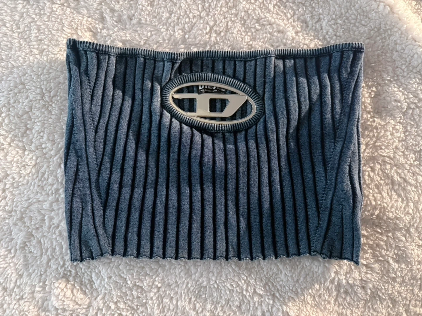 Diesel ribbed knit tube top in a blue color. It features the Diesel logo on the front. The material appears to be a soft, stretchy knit. Perfect for layering or wearing on its own!
