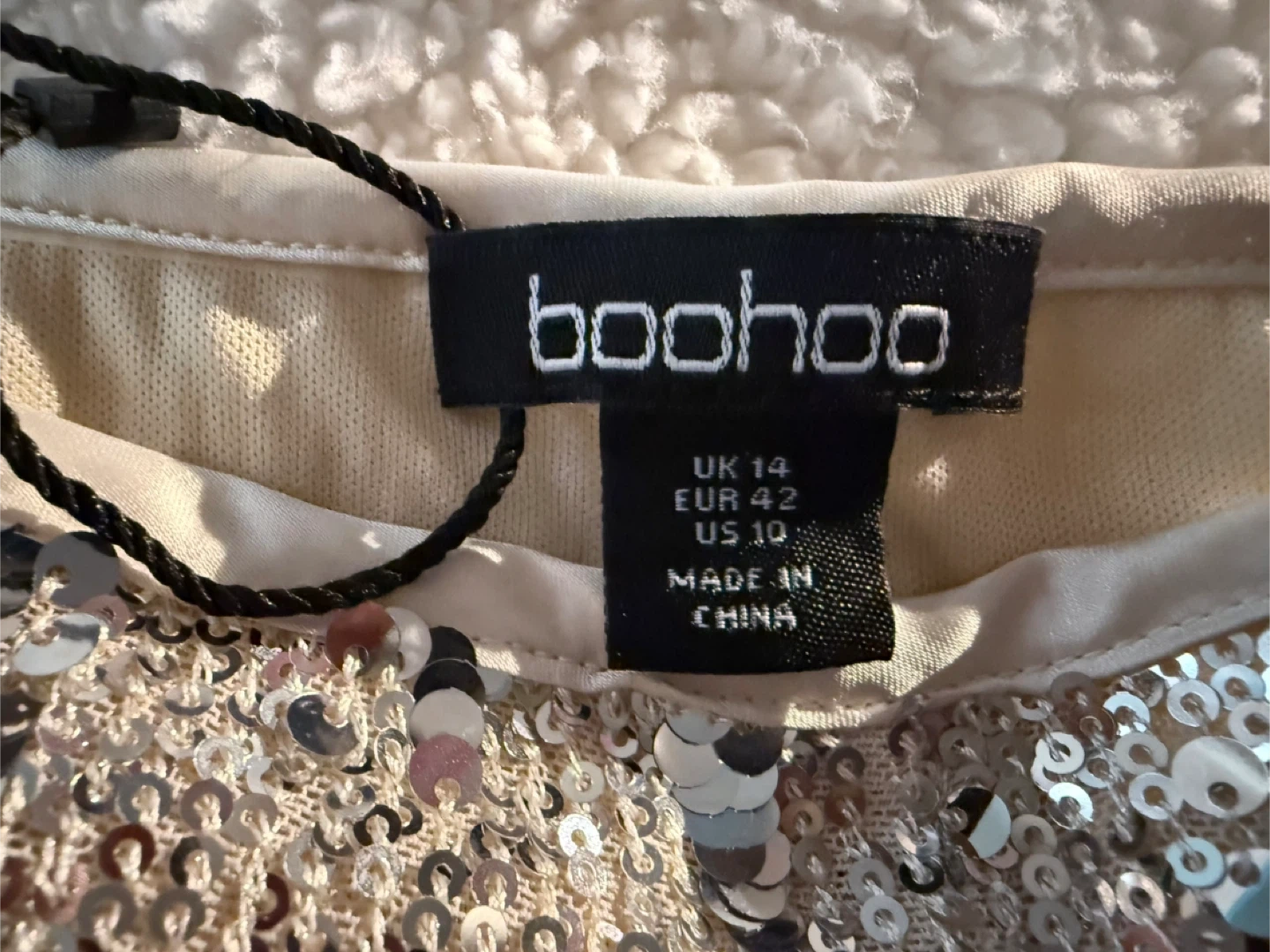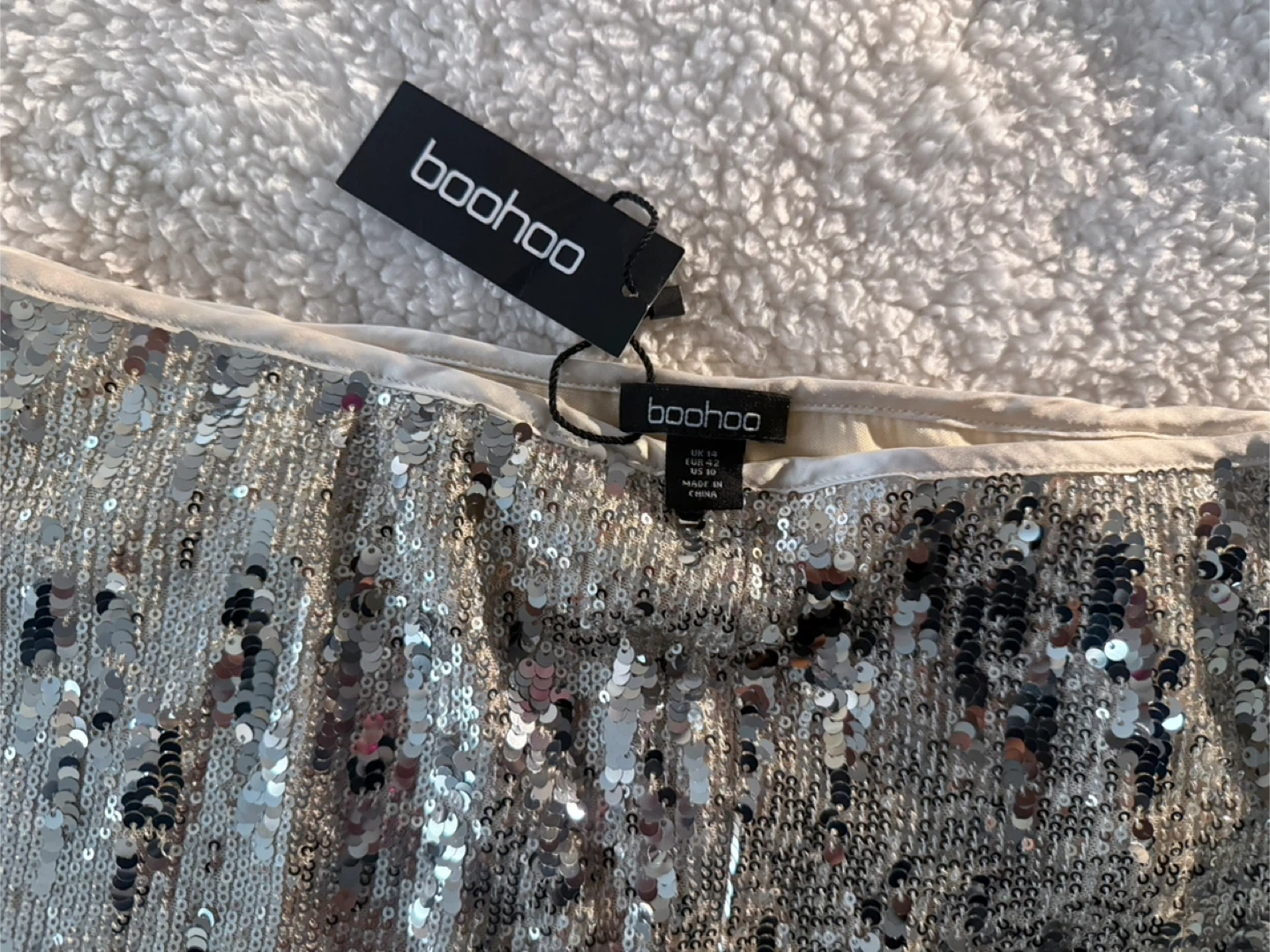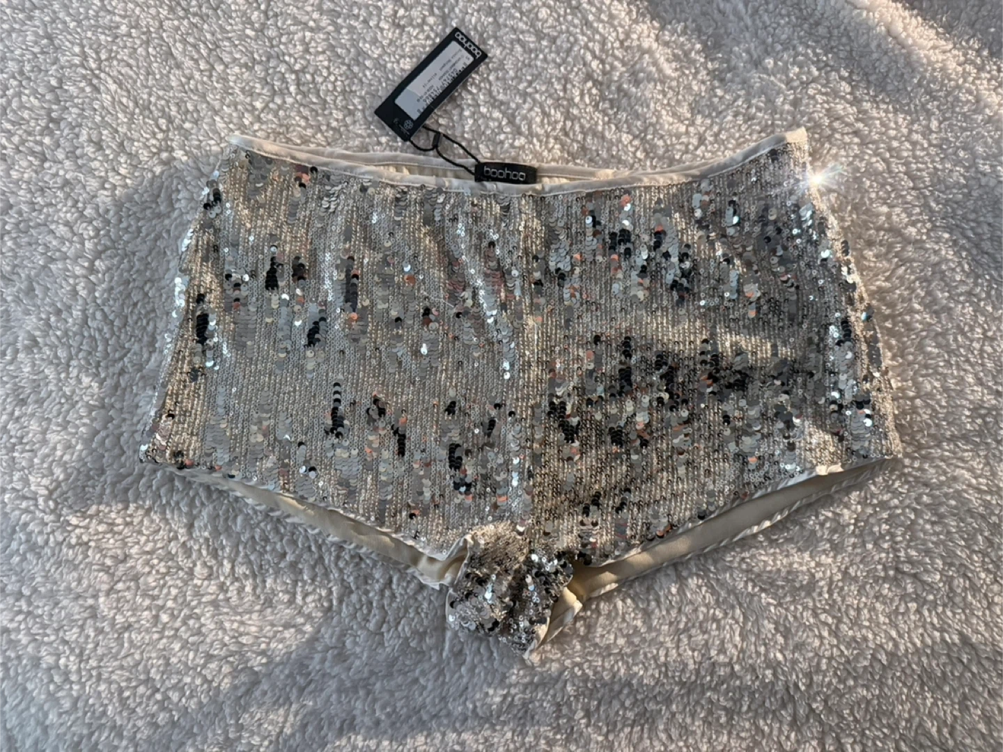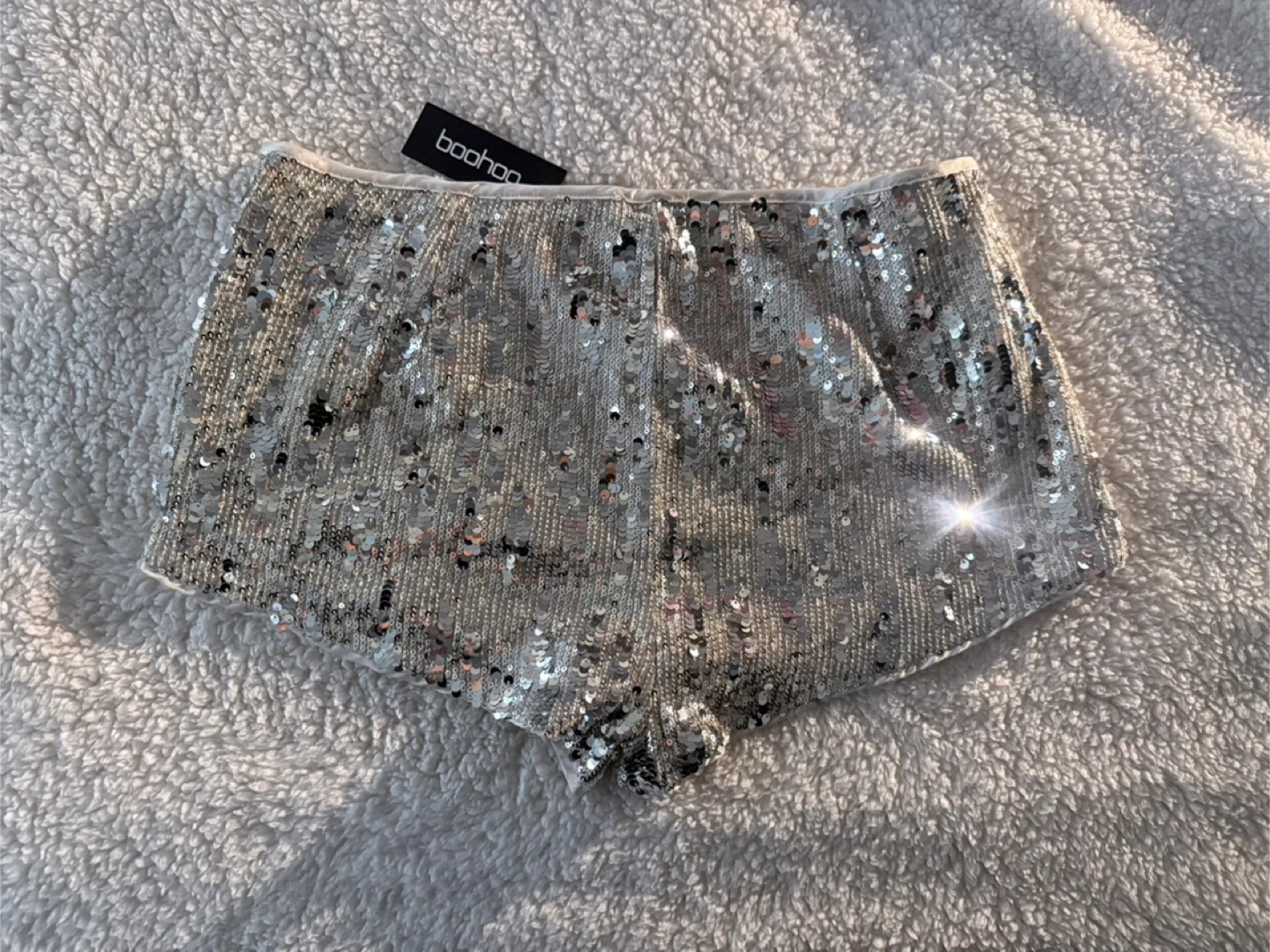 These Boohoo sequin shorts are perfect for adding some sparkle to your wardrobe! They're a size US 10 and feature a fun, eye-catching sequin design. Great for a night out or a special occasion!