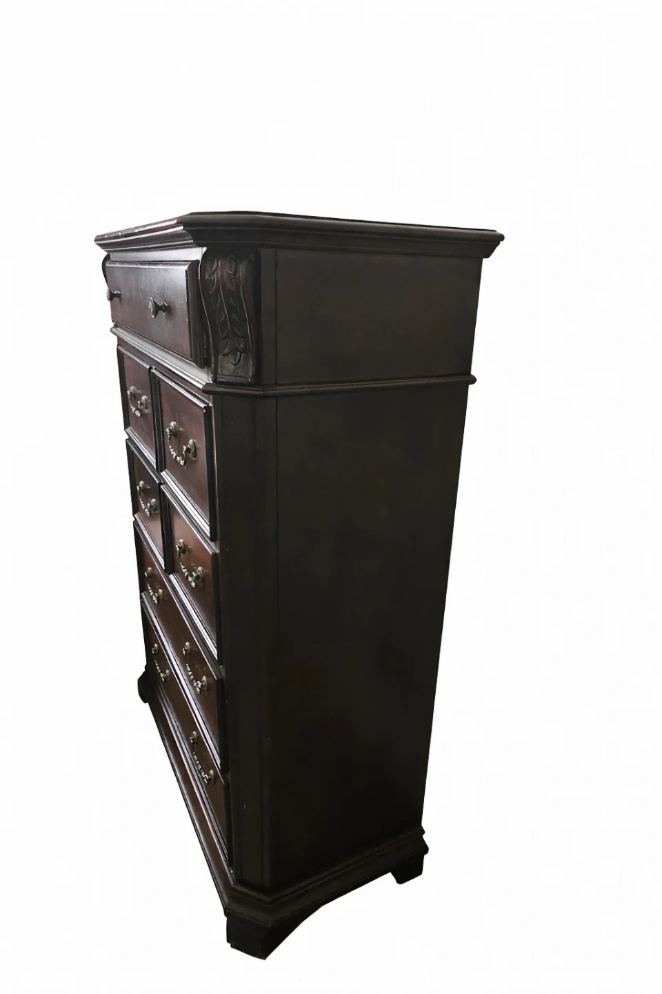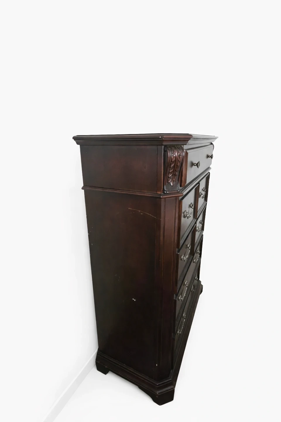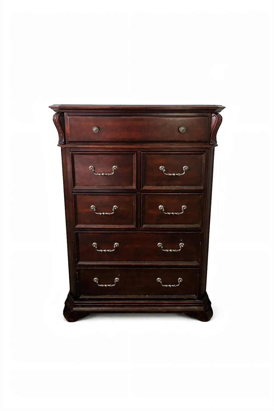 Selling a dark wood chest of drawers. It has seven drawers with ornate handles. There are some signs of wear, but it's still a solid piece of furniture!