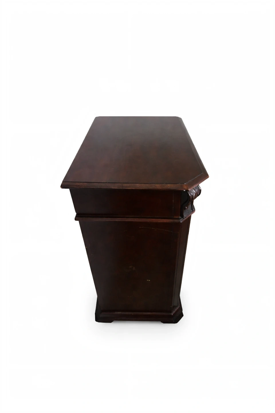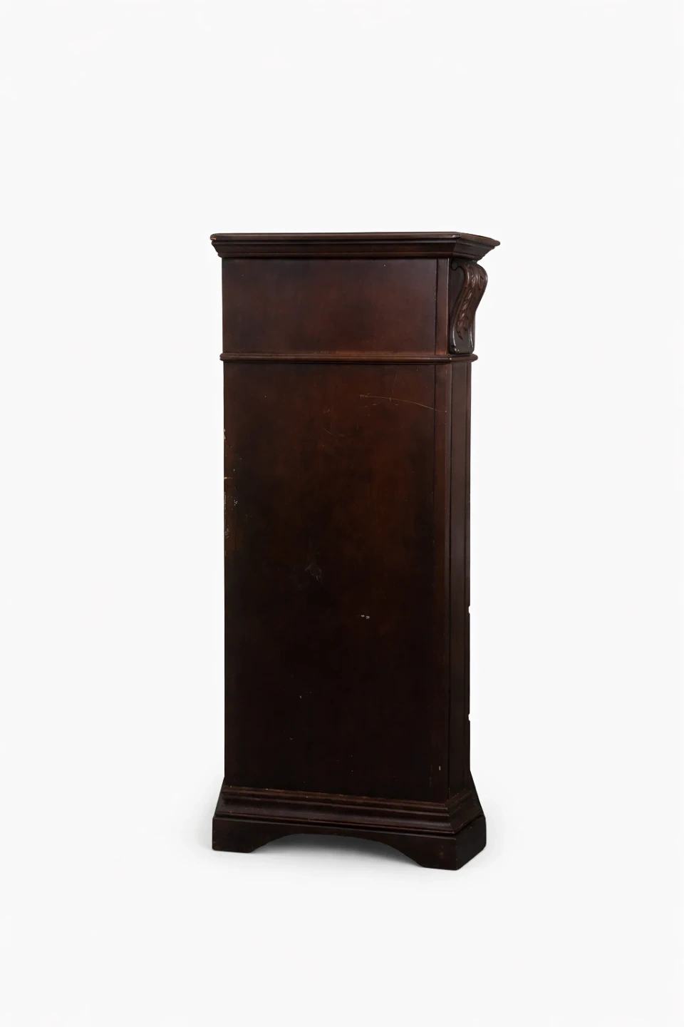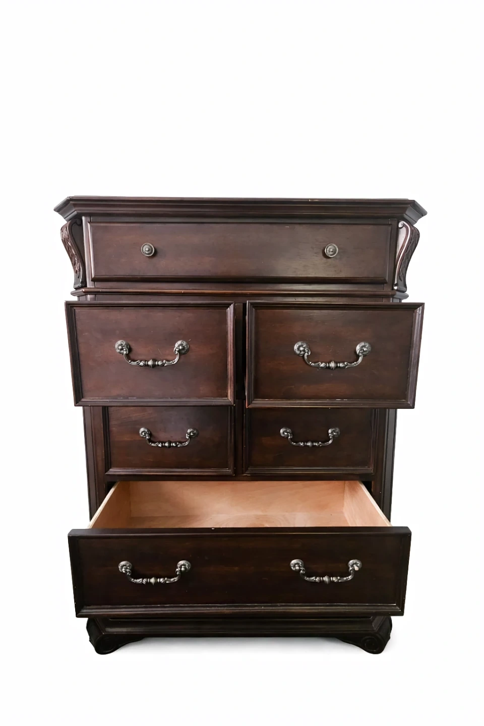 Selling a dark wood chest of drawers. It has seven drawers with ornate handles. There are some signs of wear, but it's still a solid piece of furniture!