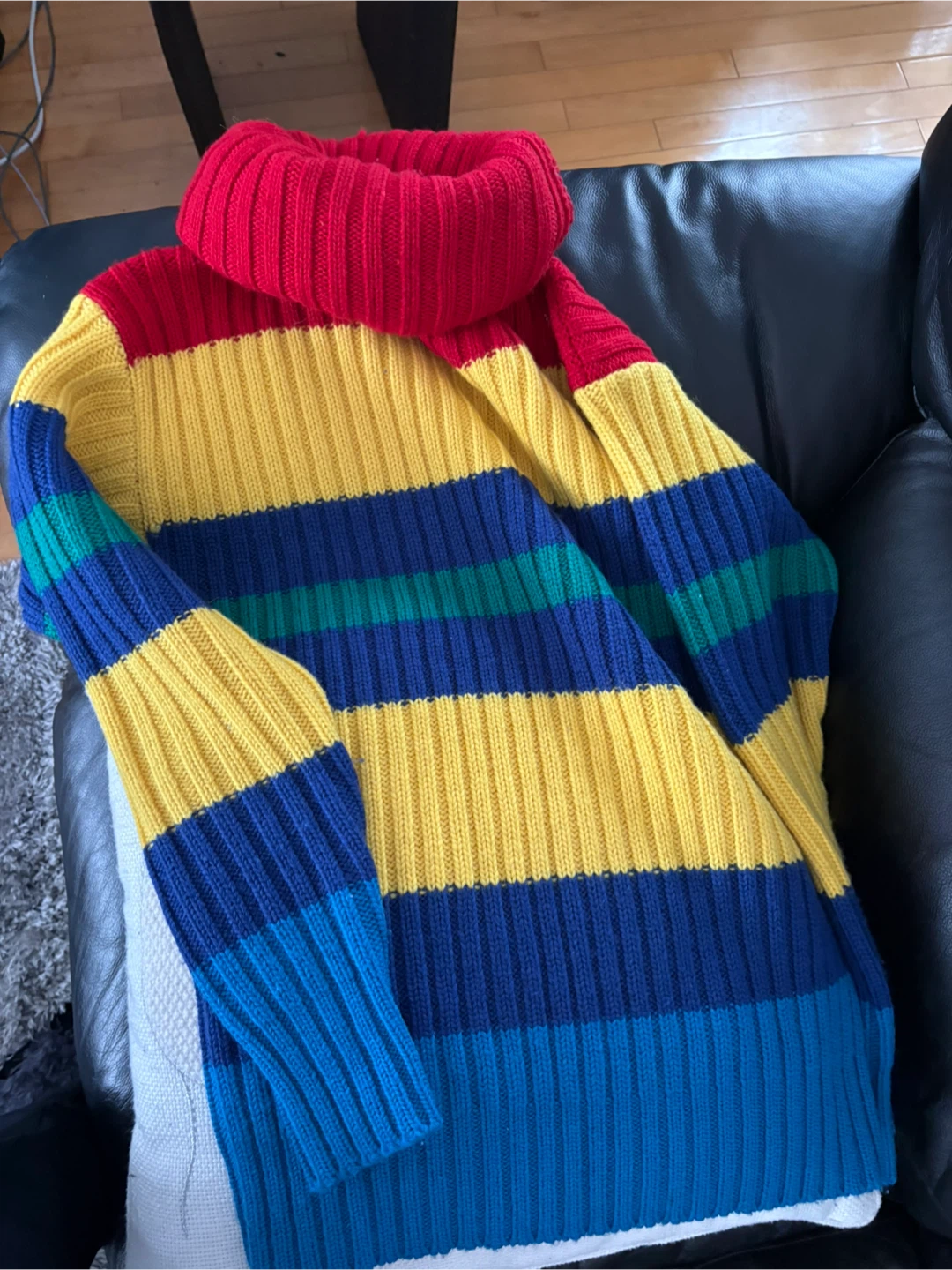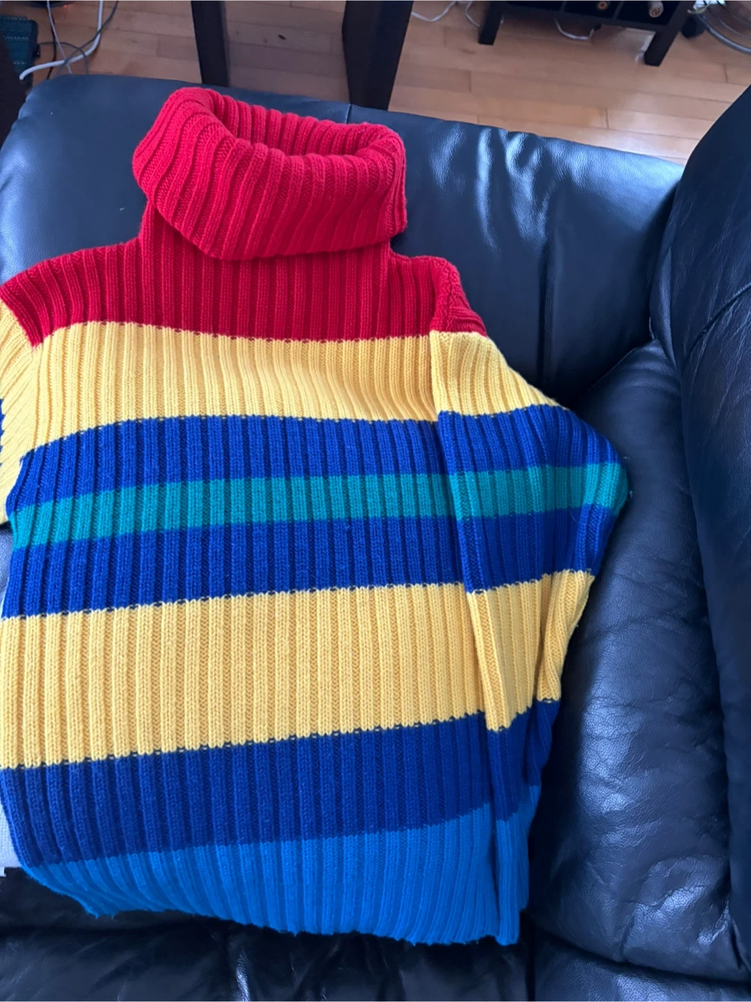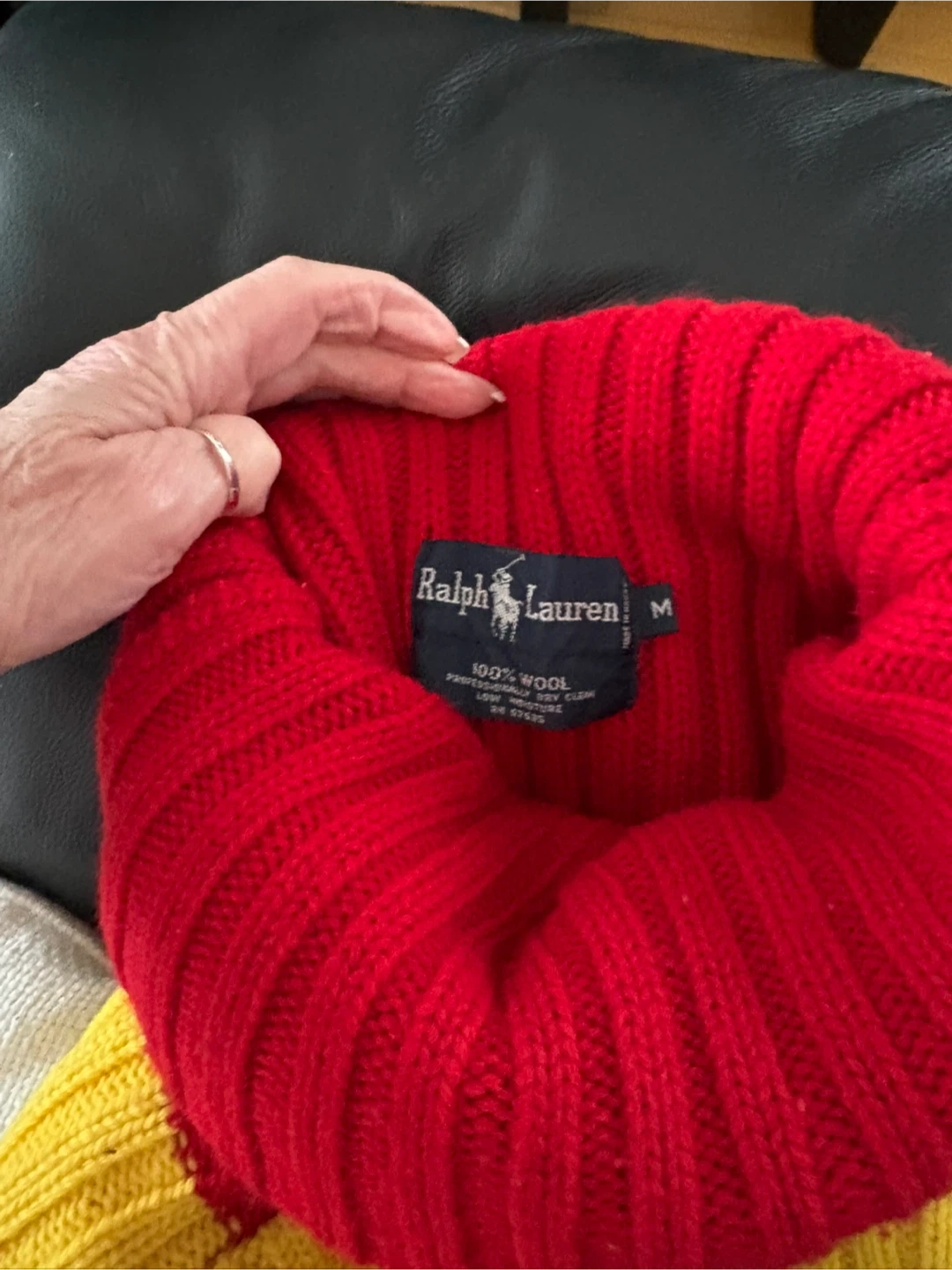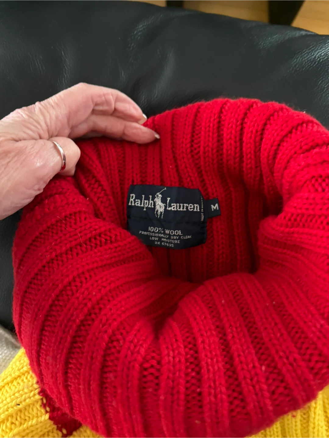 Selling a vintage 1980s Ralph Lauren sweater made of 100% wool. It features a vibrant striped design with red, yellow, green, and blue colors. The sweater is a size M. Excellent condition smoke and pet free home.