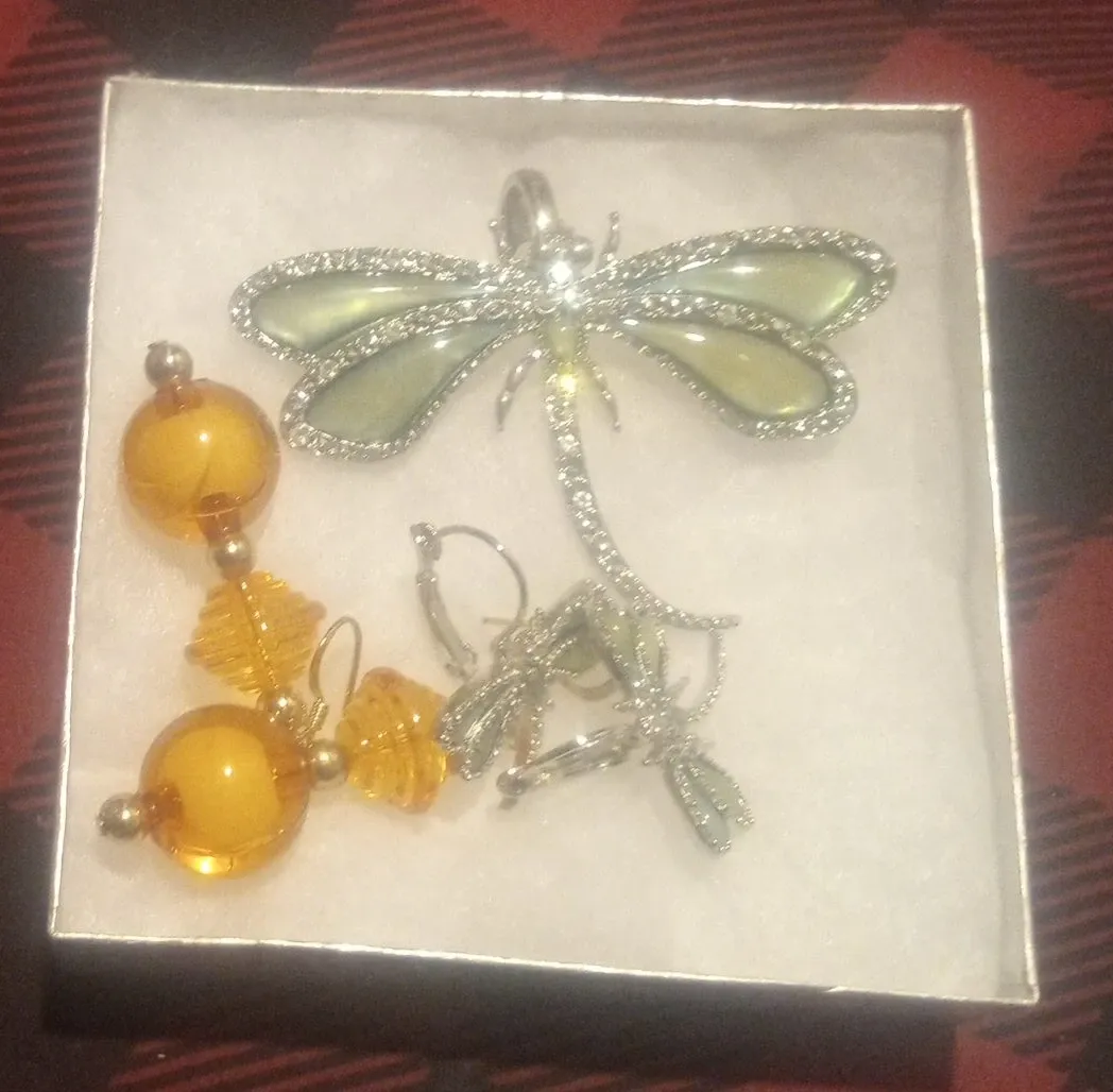 Here's a beautiful dragonfly brooch and earrings set! The set comes in a box and features a dragonfly design with rhinestones. The earrings are a matching dragonfly design and also feature yellow beads.