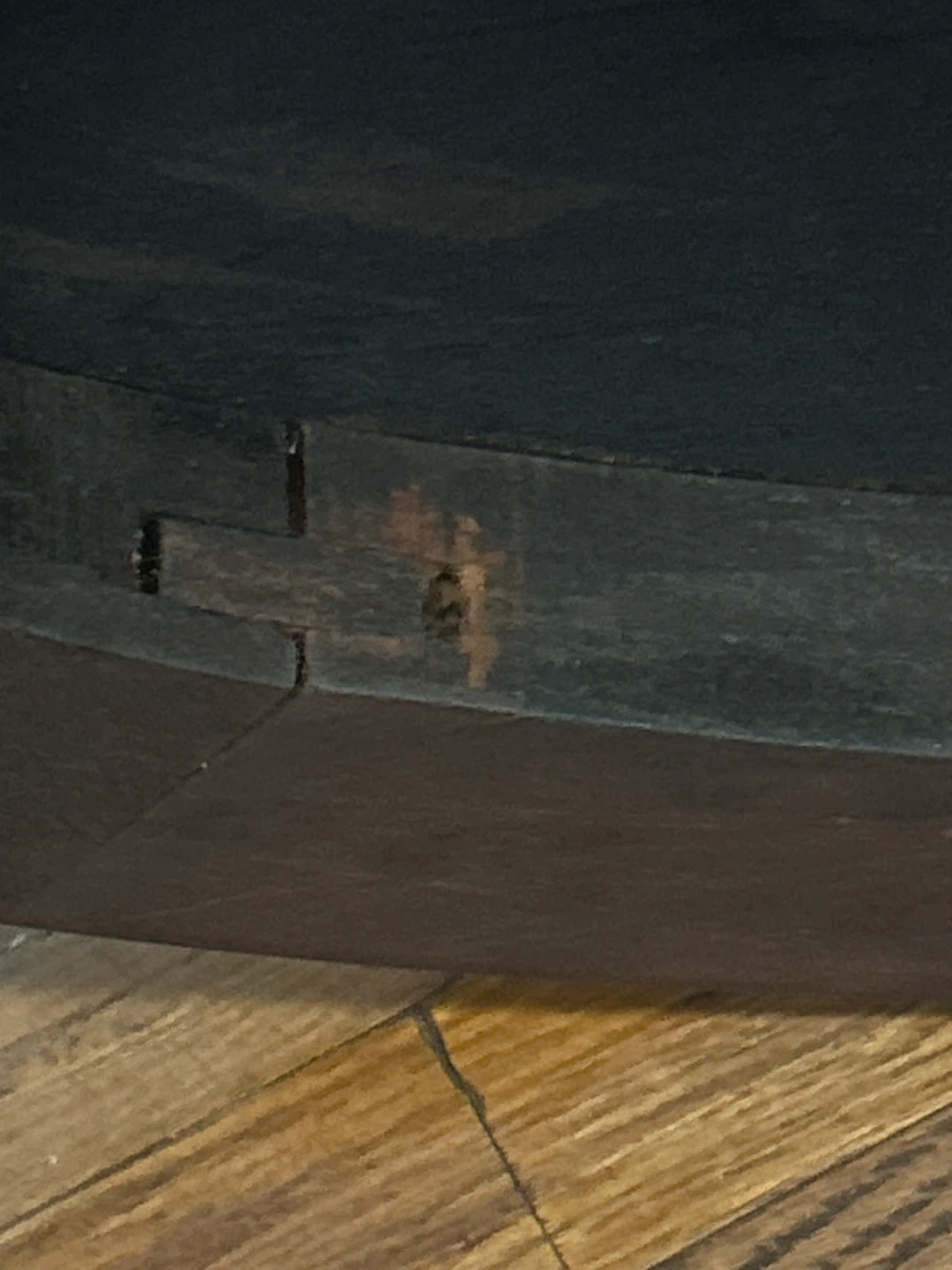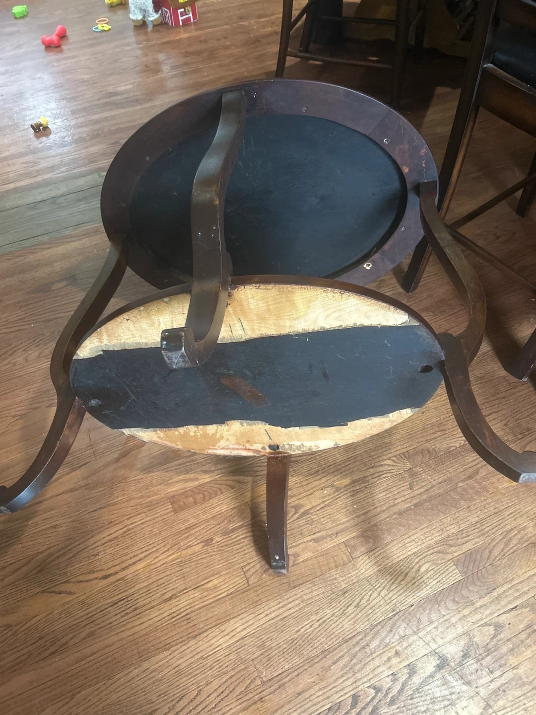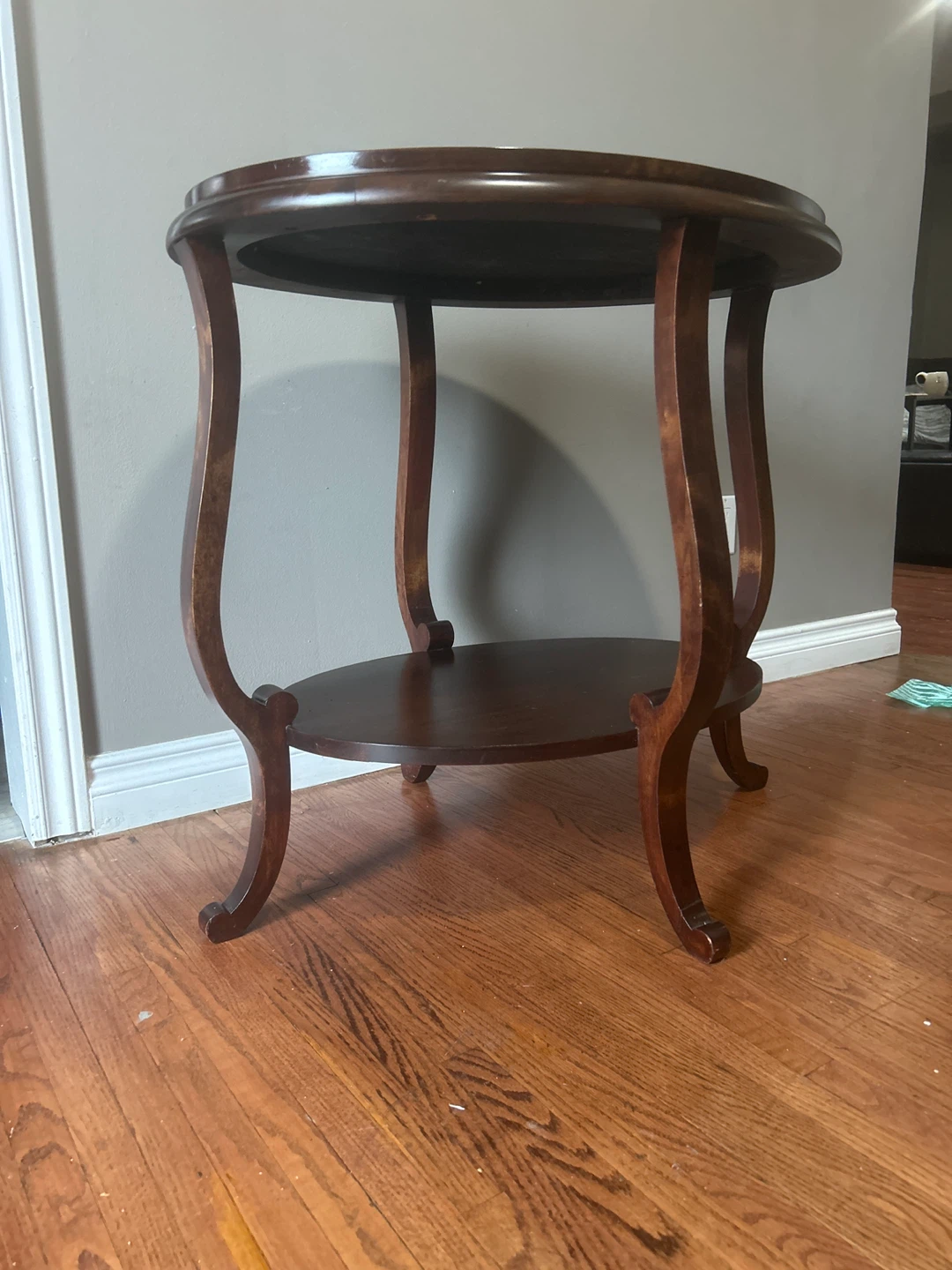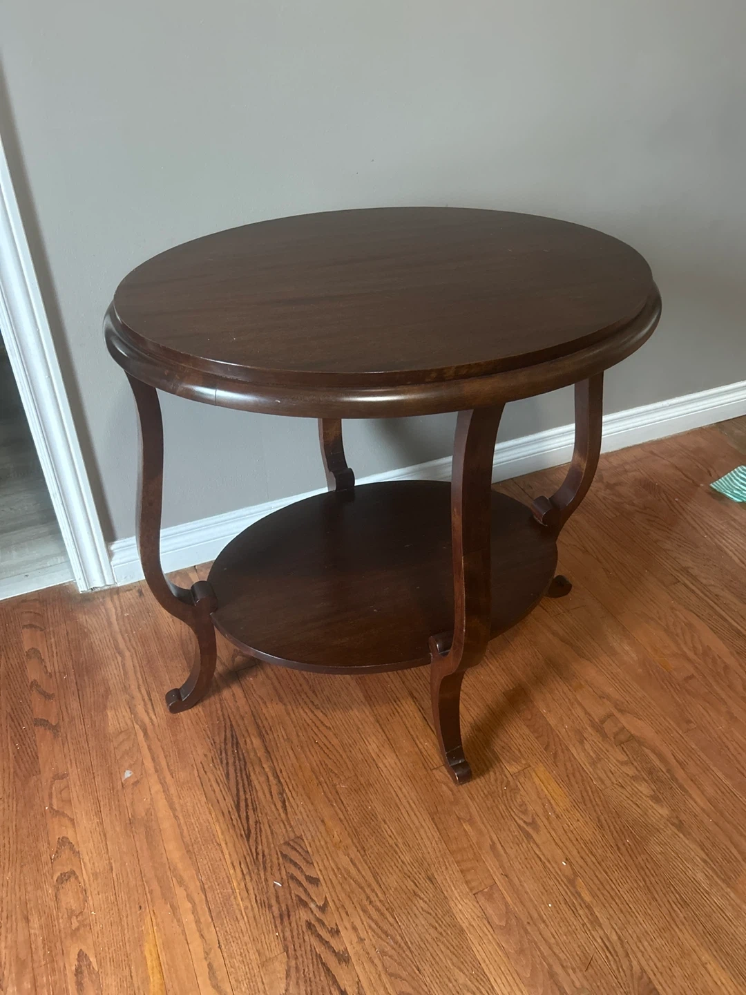 Selling a dark brown round (oval) accent table. It has a two-tiered design with curved legs. There are some signs of wear, but it's still in good condition for use as a side table or decorative piece