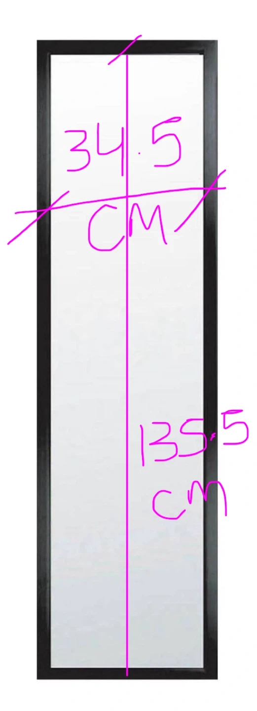Selling a full-length mirror with a sleek black frame. The mirror measures 34.5 cm in width and 135.5 cm in height. It's in great condition and ready to brighten up any room!