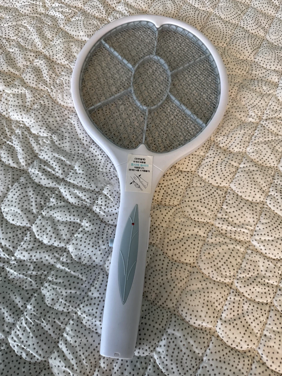 Here's an electric mosquito swatter! It's white and in great condition. It has a safety design that requires pressing two buttons simultaneously to activate it.
