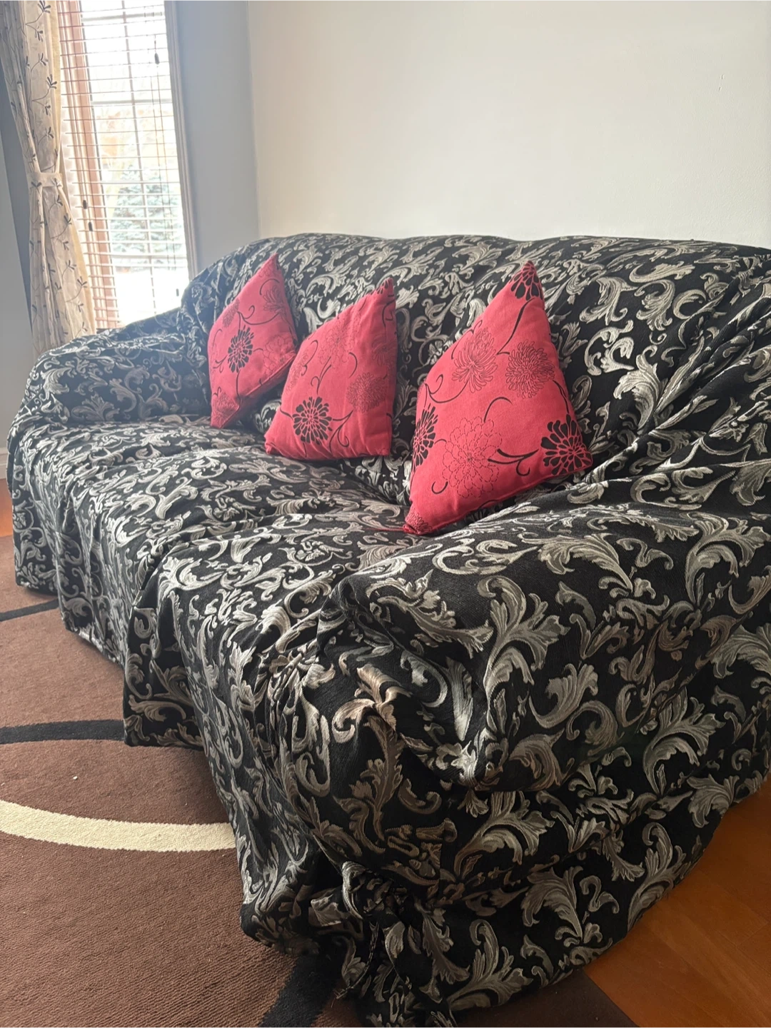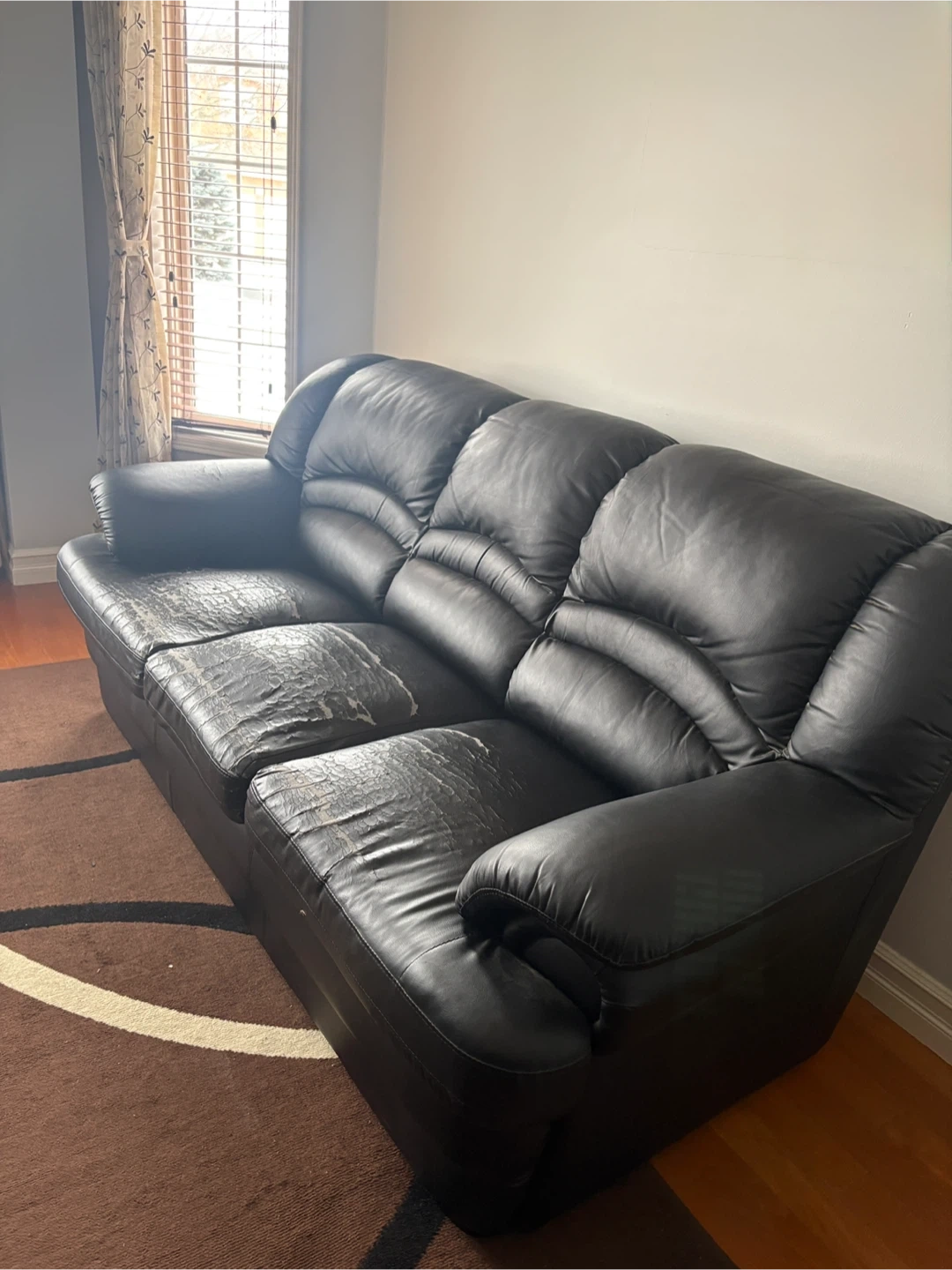 Selling a three-seater black leather sofa. It has some wear and tear on the seating cushions as shown in the pictures. But, it is in good condition and also comes with a sofa cover that is washable.