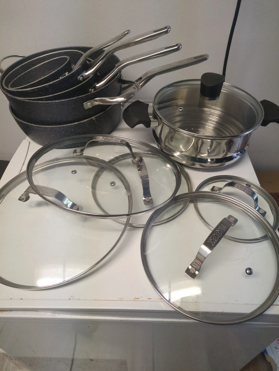 Frying pan (slightly warped on the bottom), four pans, five lids, steamer with lid for free.