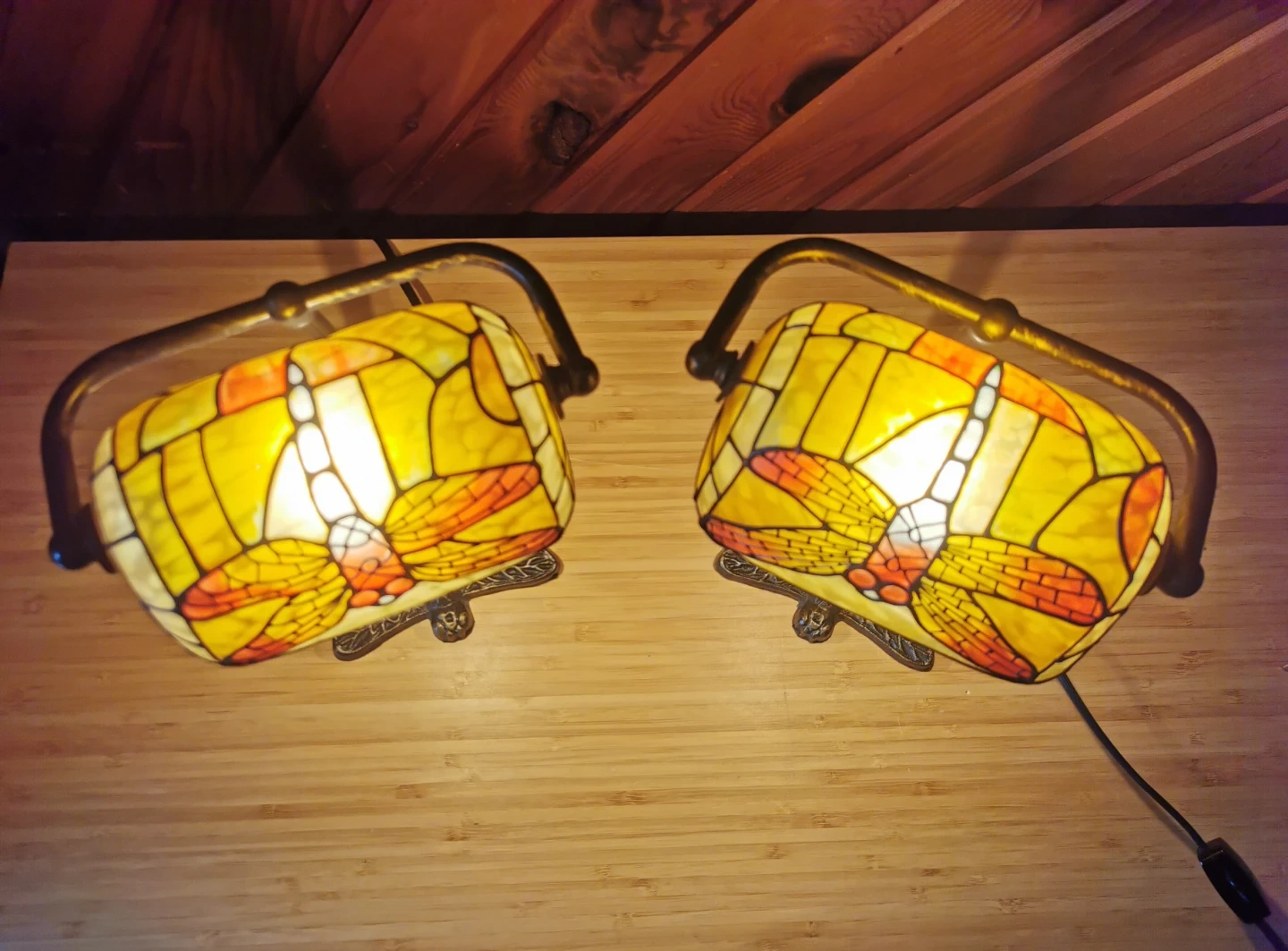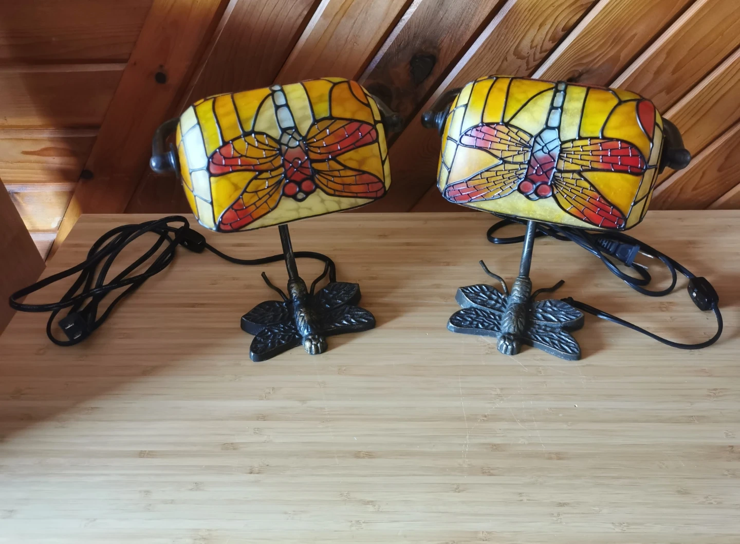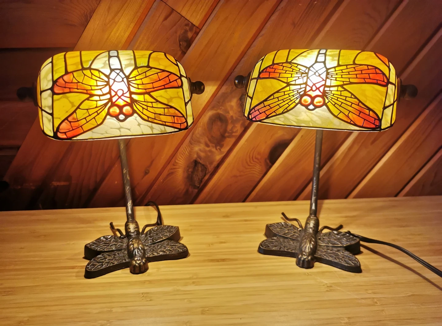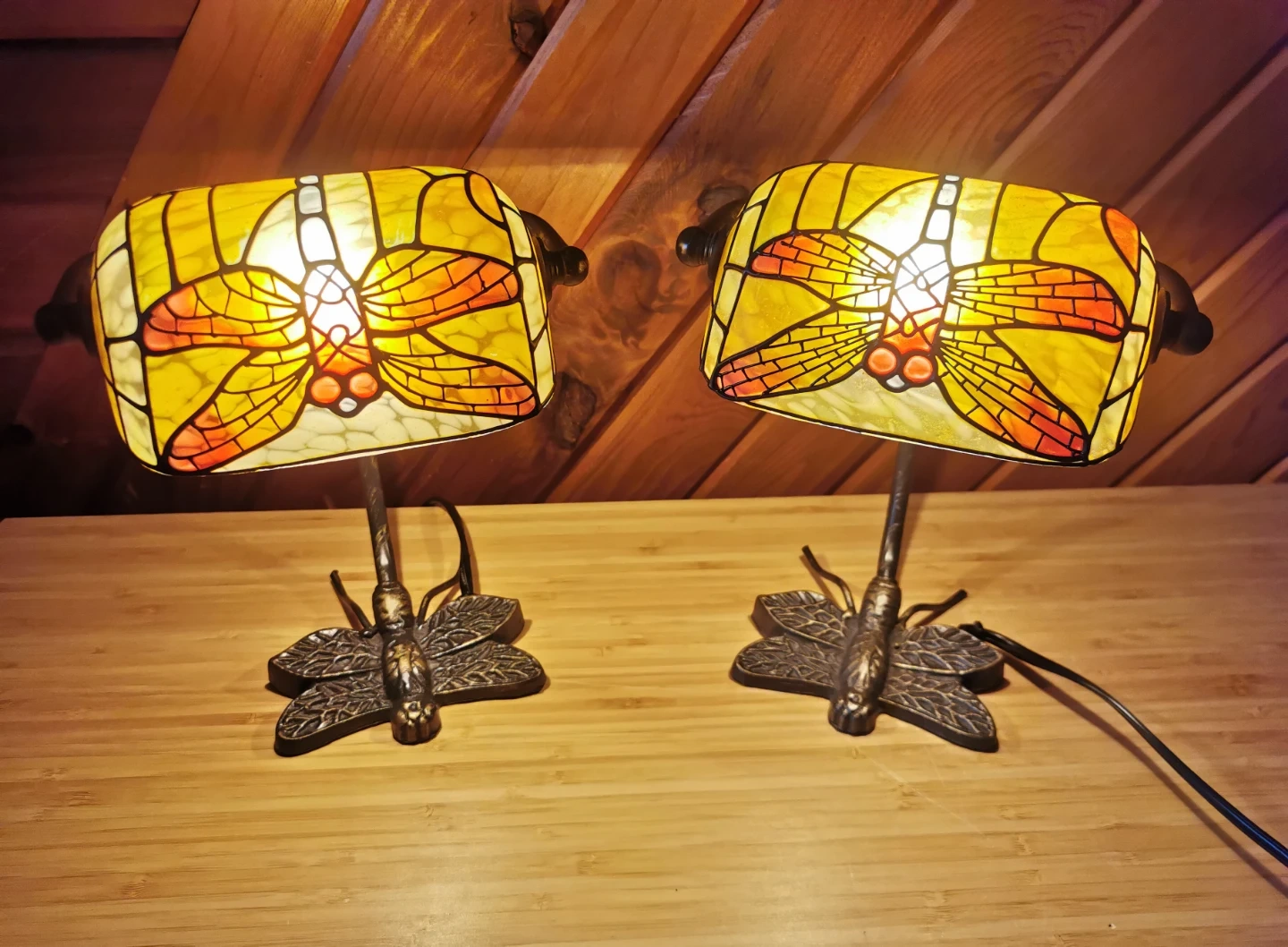 Pair of Vintage Stained Glass Dragonfly Desk Lamps