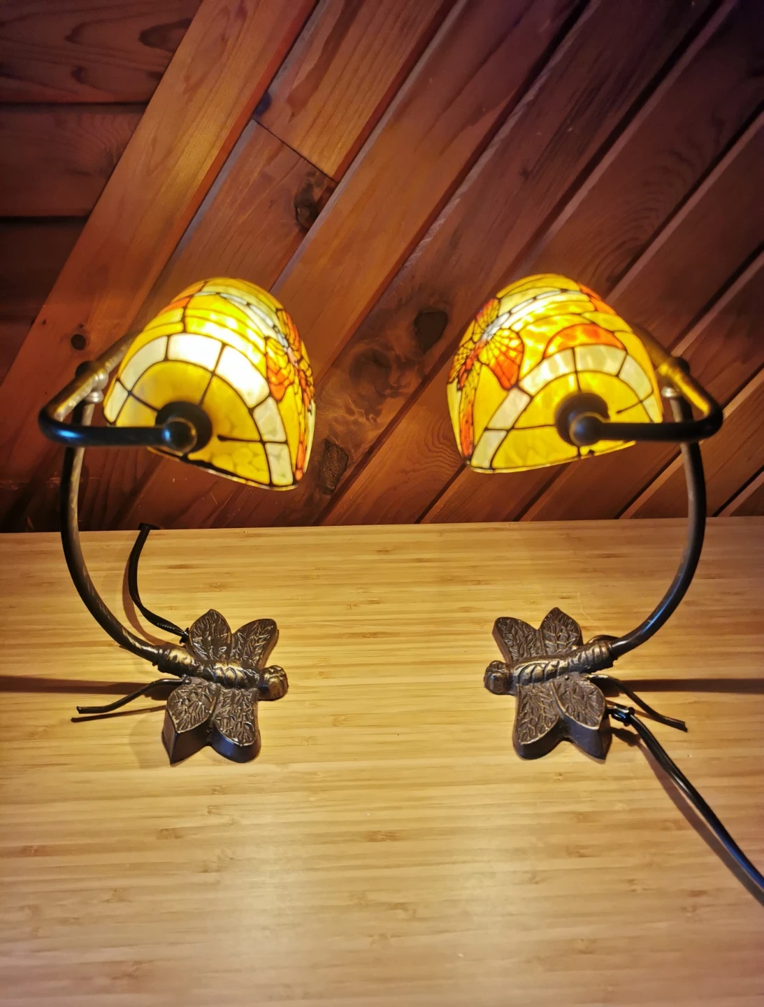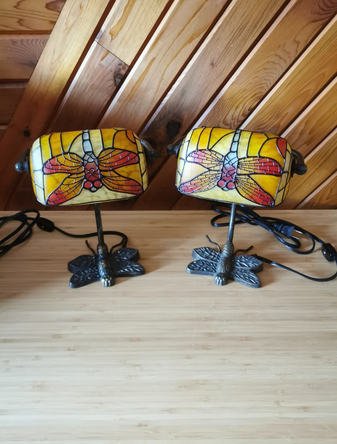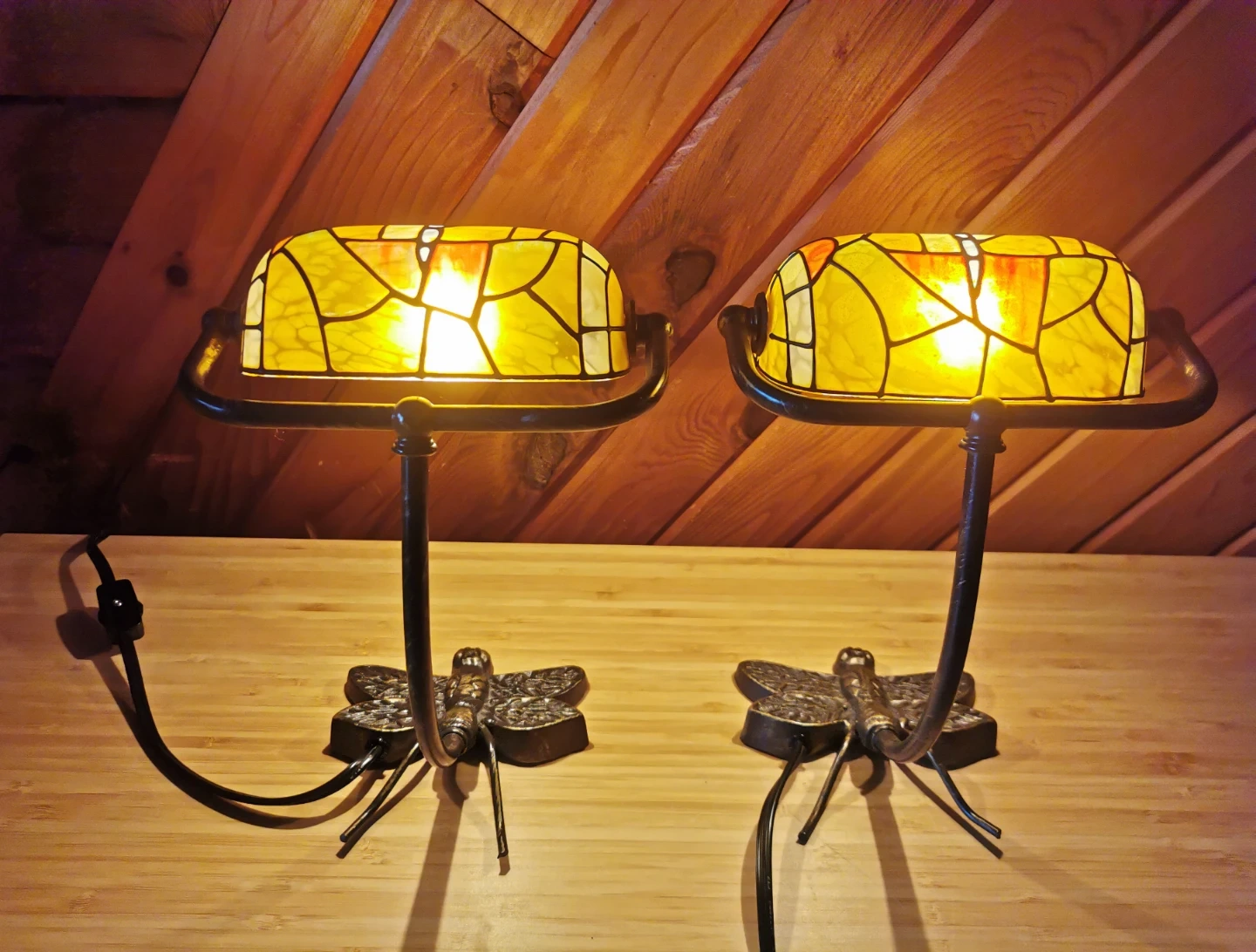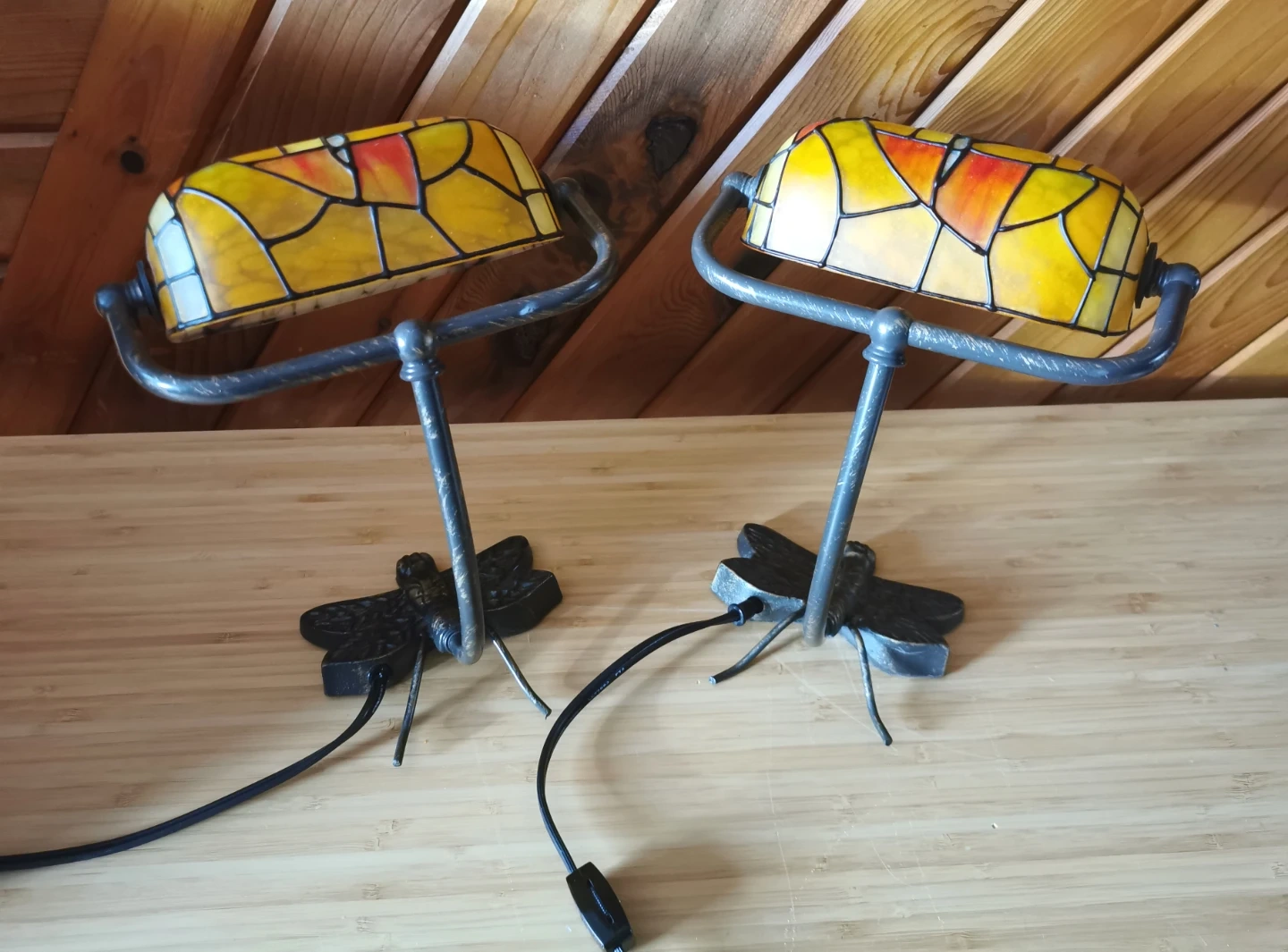 Pair of Vintage Stained Glass Dragonfly Desk Lamps