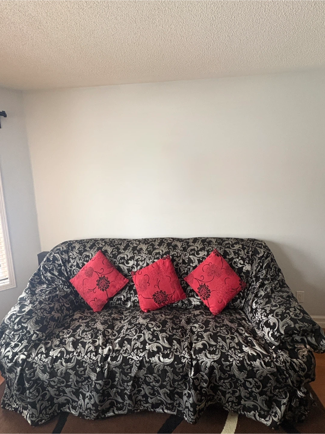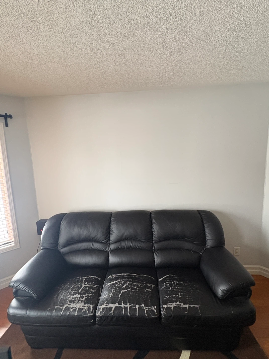 The three-seater black leather sofa has some wear and tear on the seating cushions as shown in the pictures. But, it is in good condition and also comes with a sofa cover that is washable.