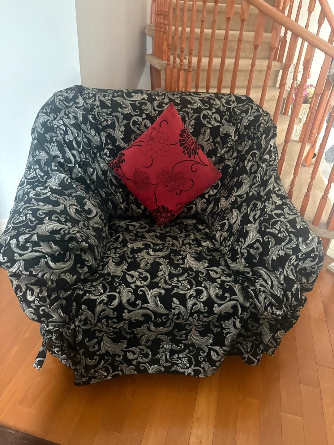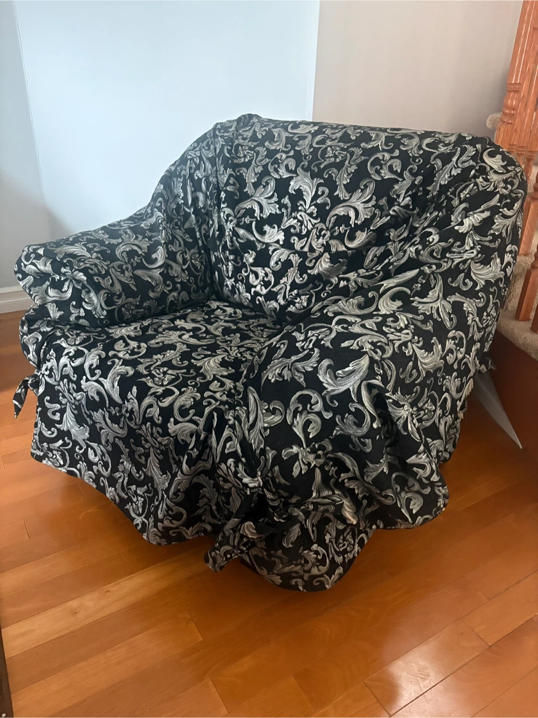 Selling a comfortable Black Leather armchair and three-seater sofa set! It comes with a stylish black and silver patterned cover. The cover is removable and washable, making it easy to keep clean. The chair itself is in good condition and perfect for a cozy corner in your home!